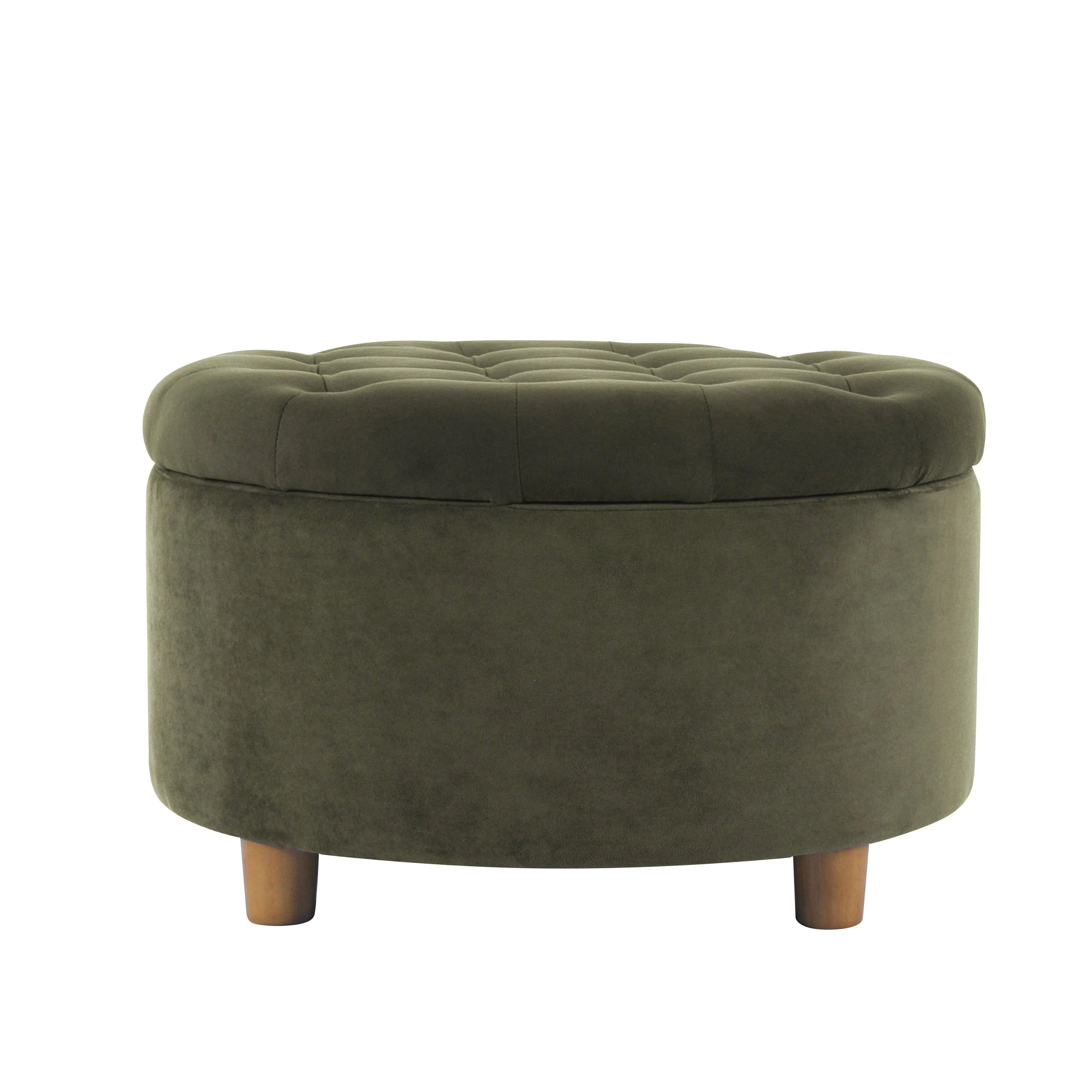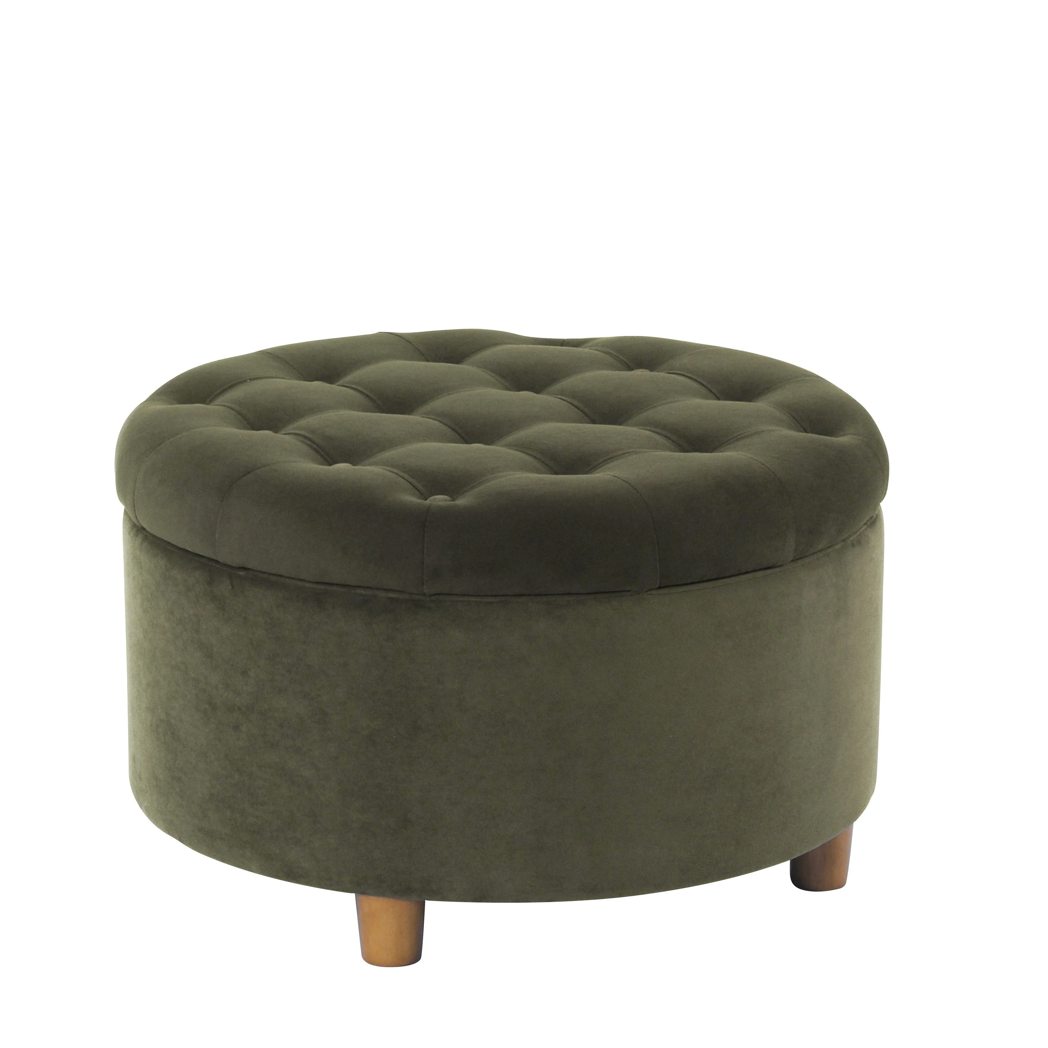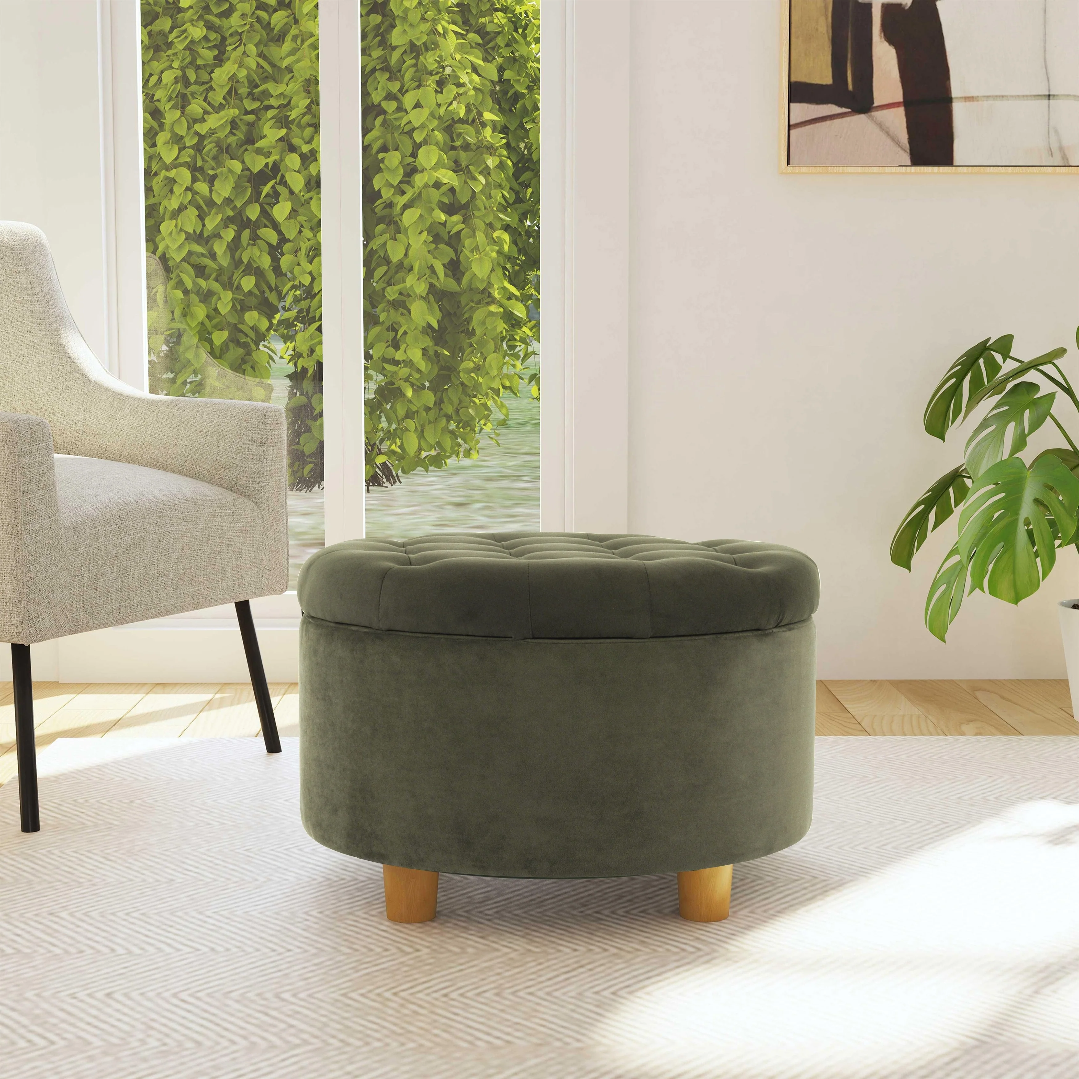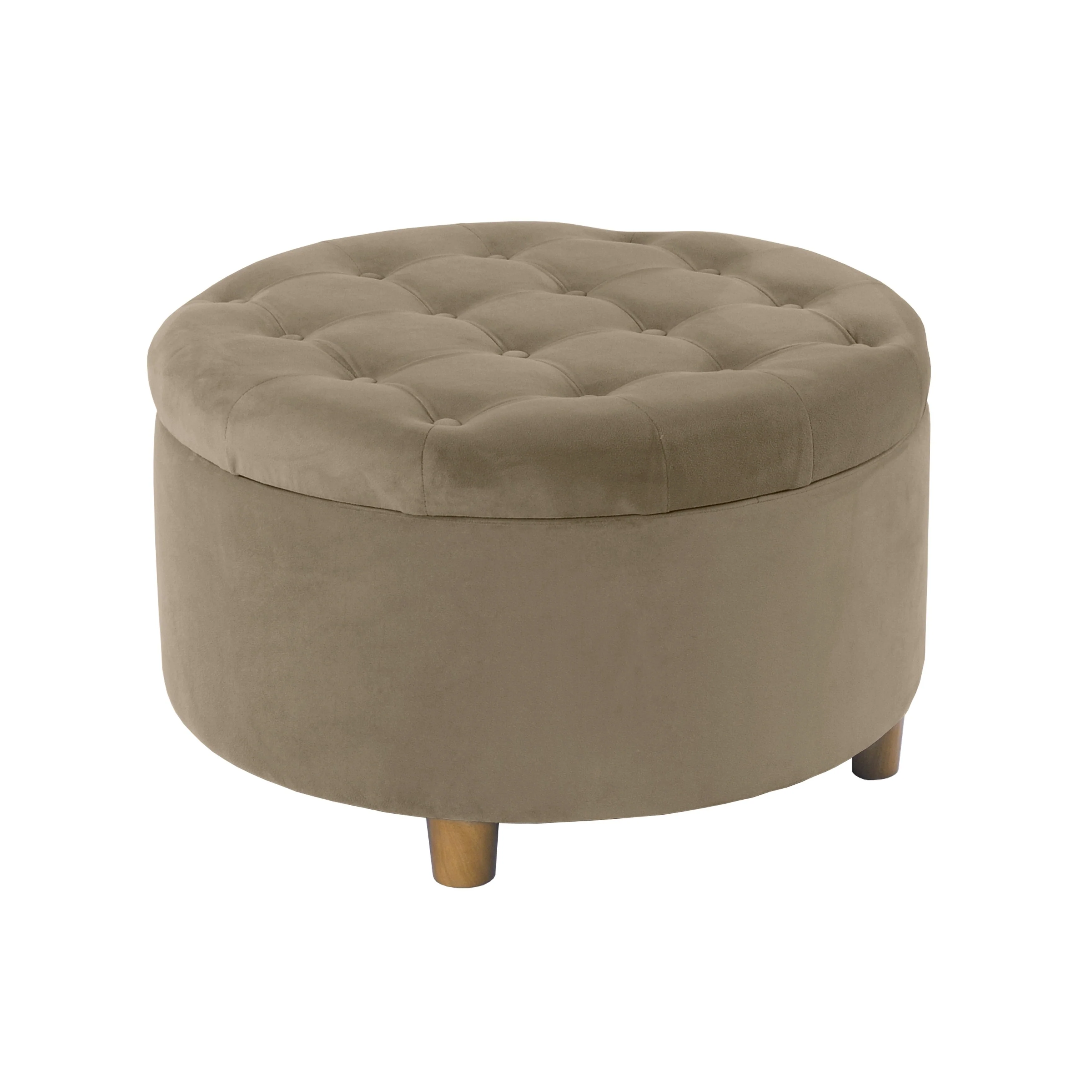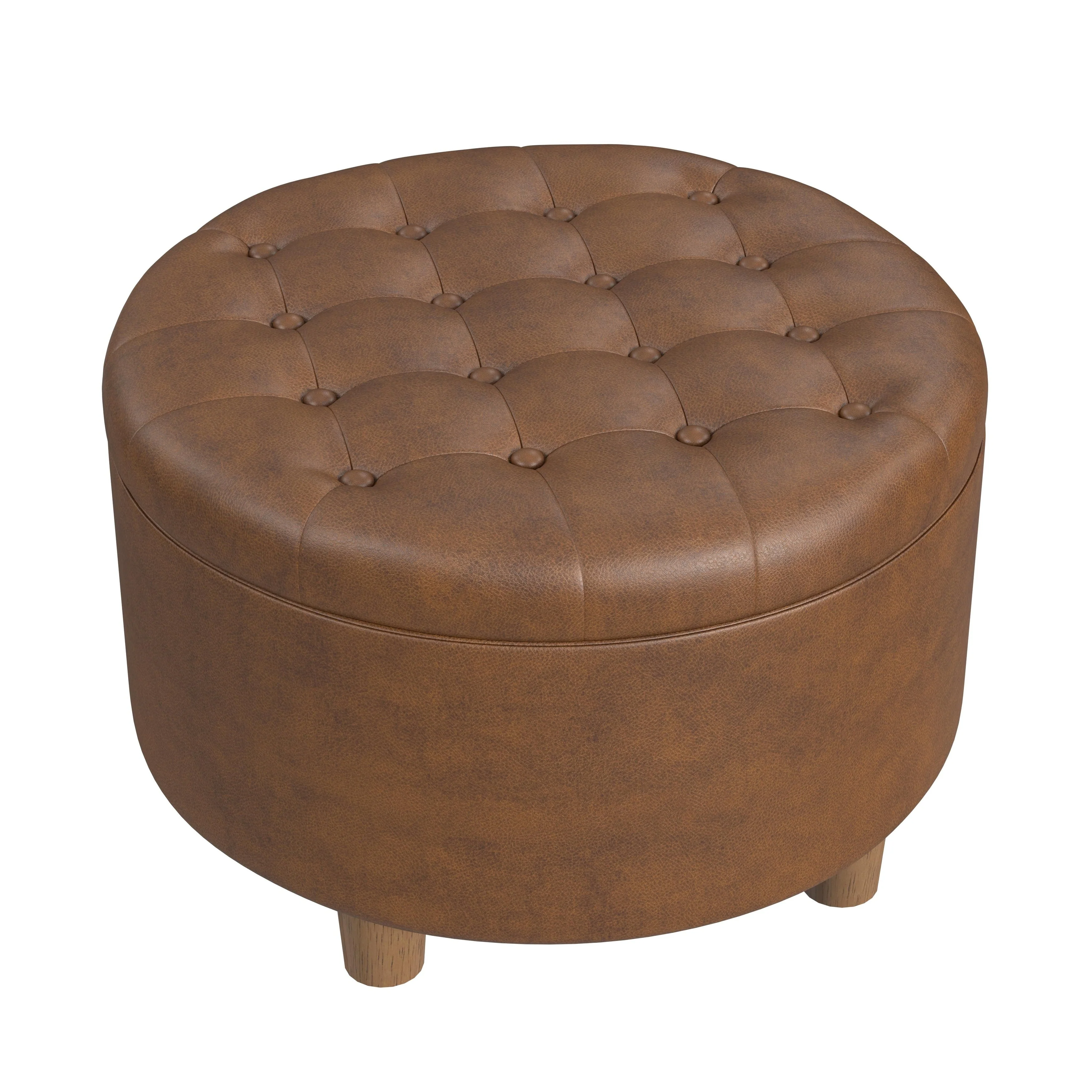 Our large round ottoman offers interest, seating and a stylish storage solution for everything from blankets to toys. With a button tufted lift off lid this modern ottoman has a relaxed feel. Enjoy in your living room as a pair or in front of an accent chair for a comfortable seating arrangement. This storage ottoman with a lift off top and honey oak finished legs is easy to assemble and maintain.