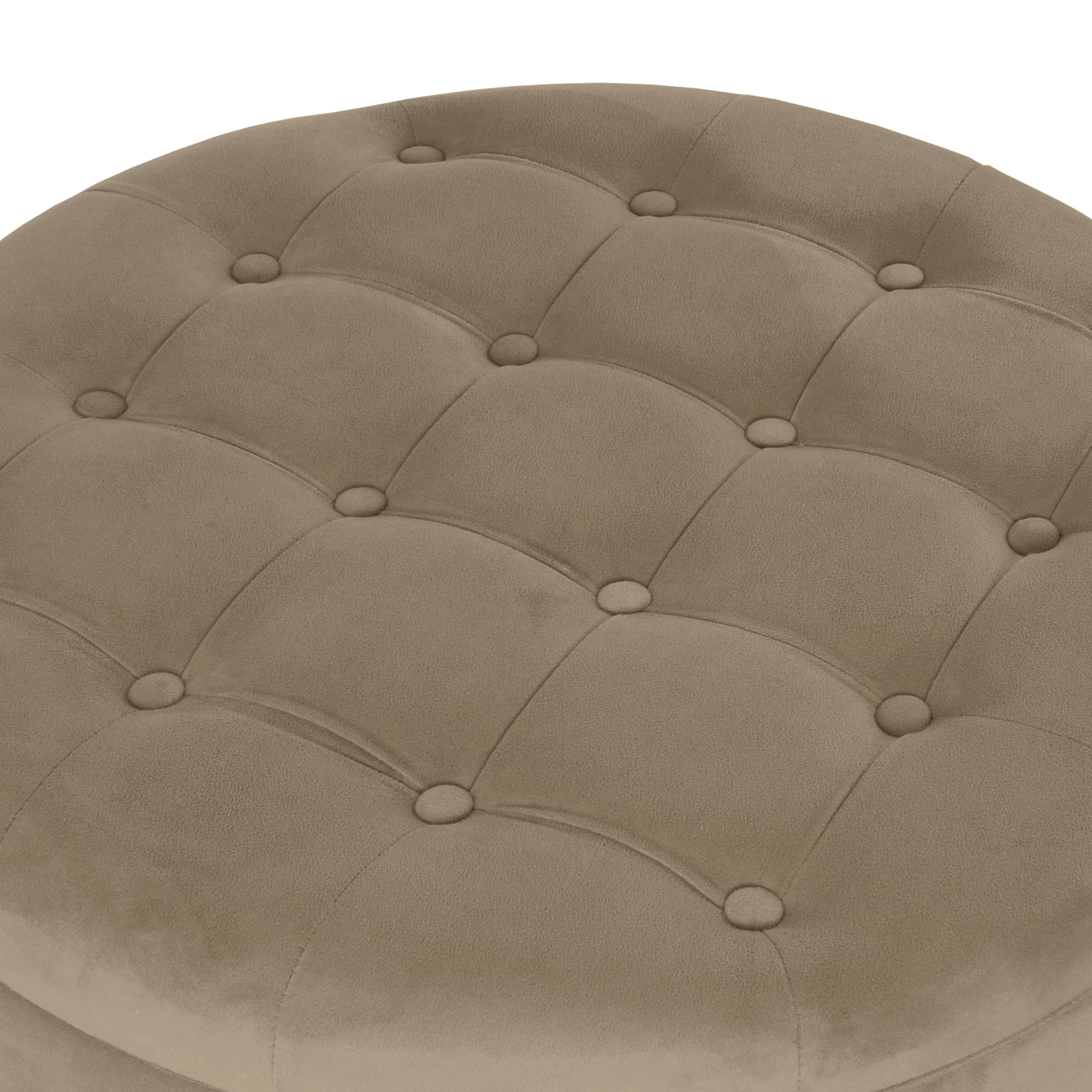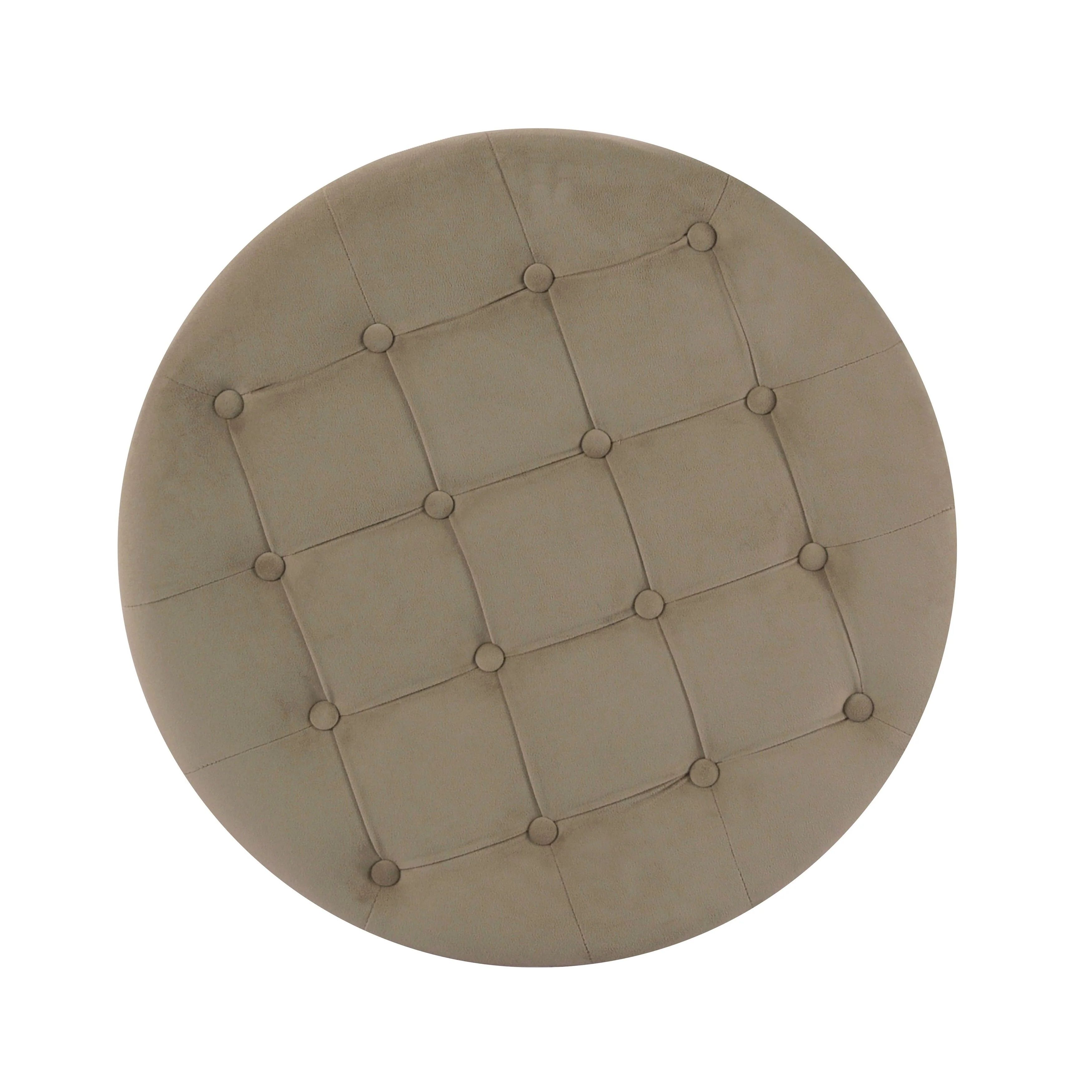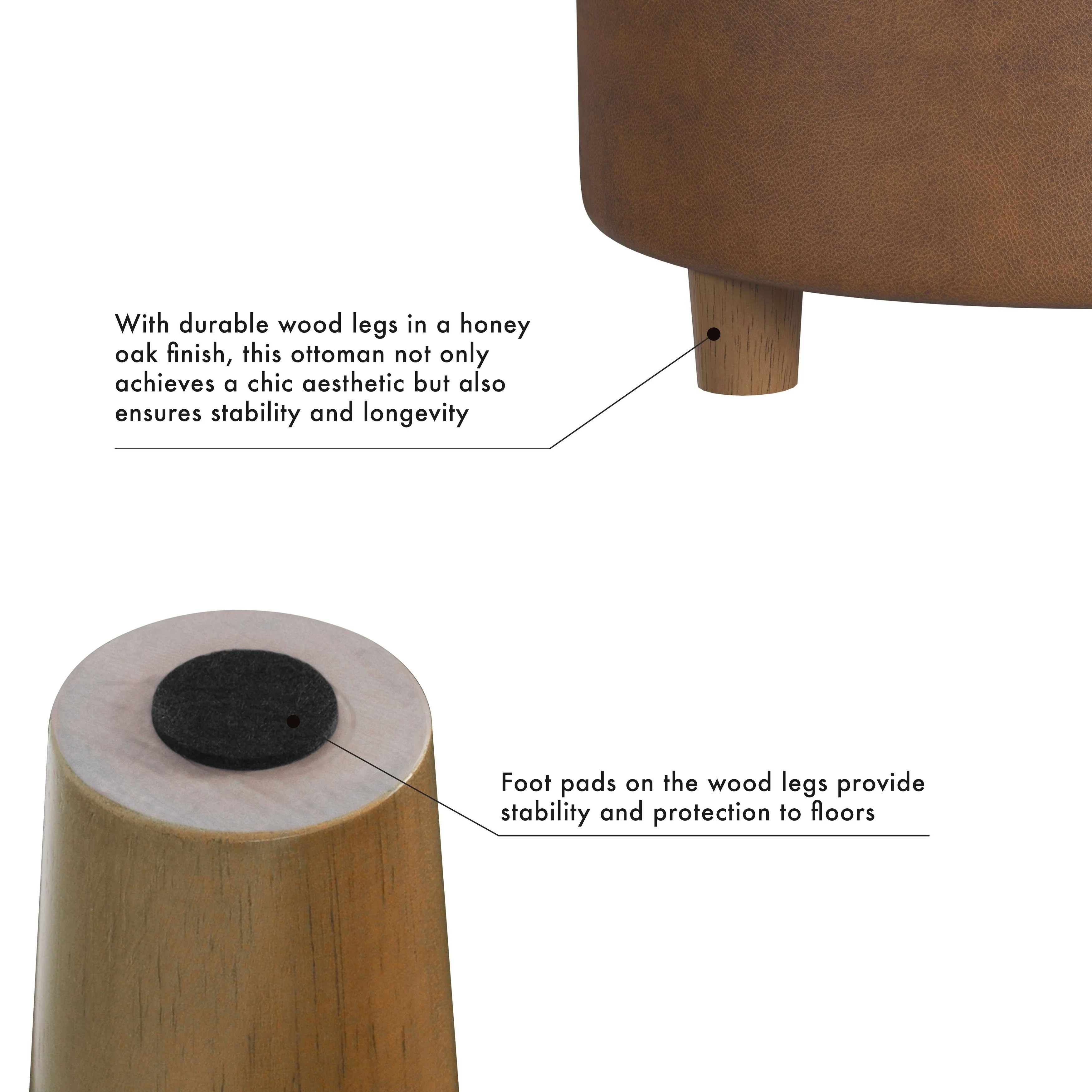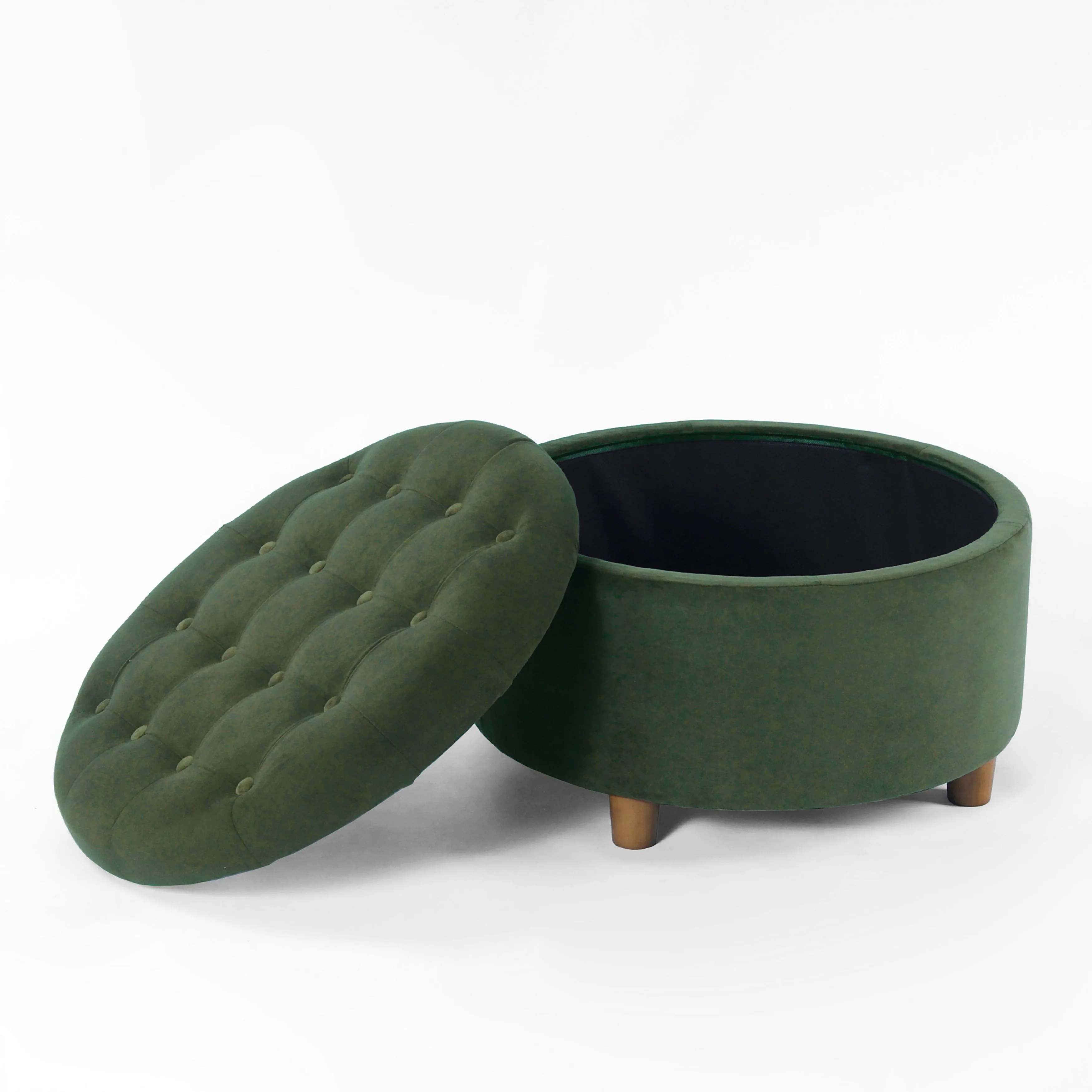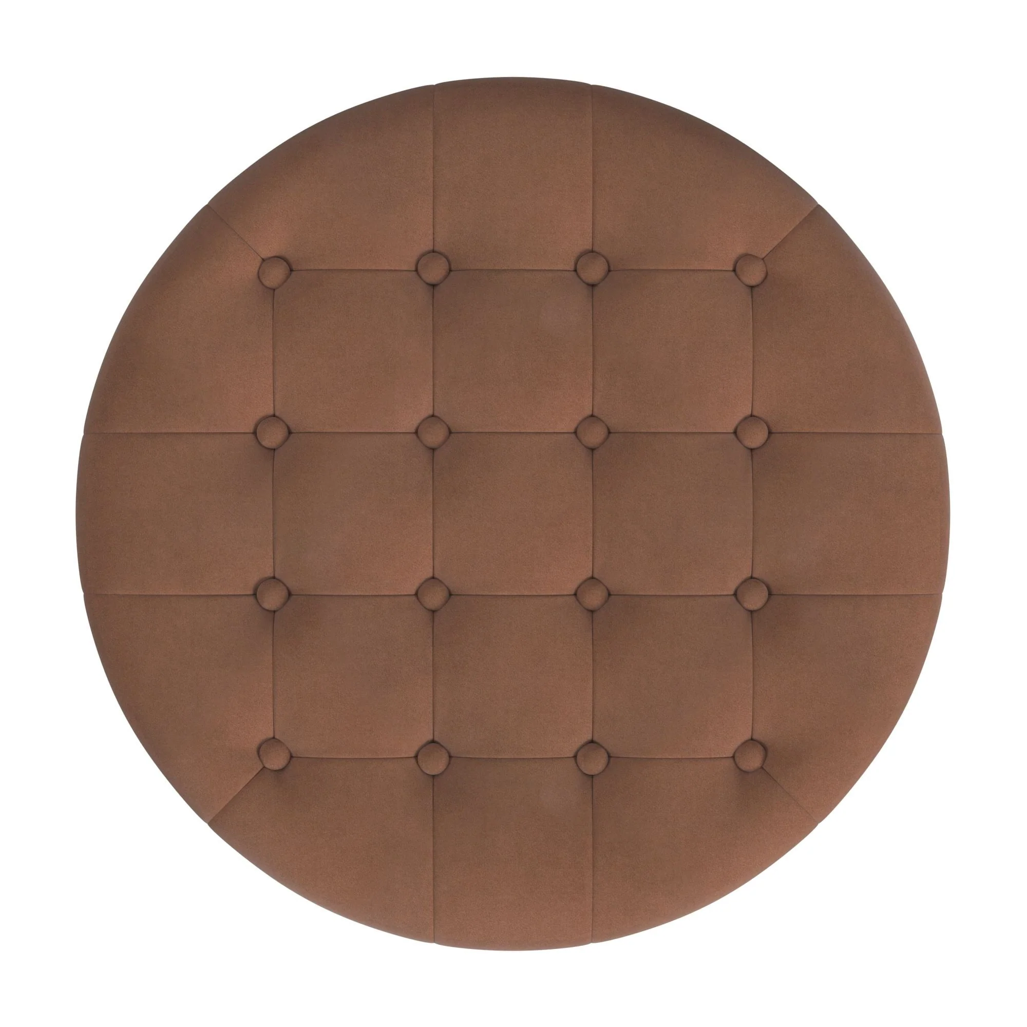 Our large round ottoman offers interest, seating and a stylish storage solution for everything from blankets to toys. With a button tufted lift off lid this modern ottoman has a relaxed feel. Enjoy in your living room as a pair or in front of an accent chair for a comfortable seating arrangement. This storage ottoman with a lift off top and honey oak finished legs is easy to assemble and maintain.