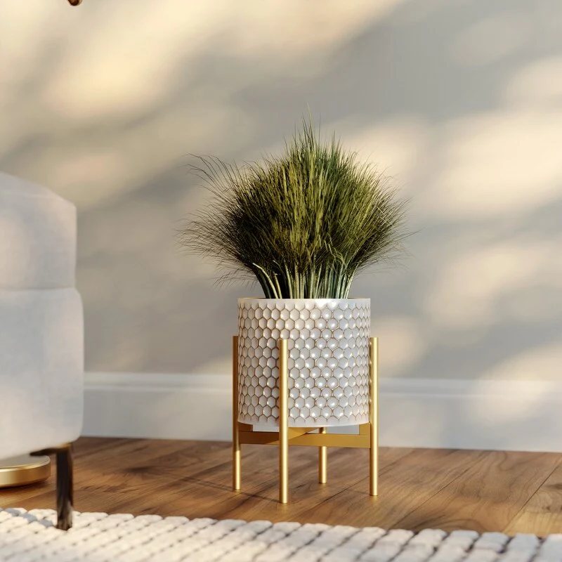 • Honeycomb Mid-Century Modern Indoor Metal Pot Planter with 4-Leg Metal Base