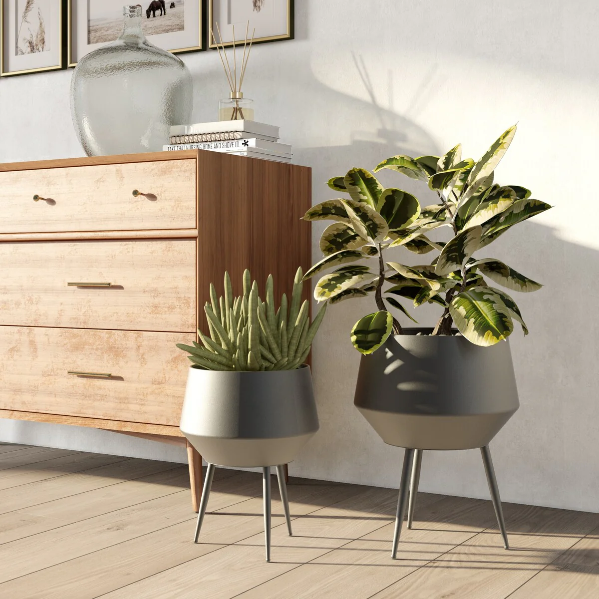 Add a touch of retro cool to your home with this set of Huxley Mid Century Modern Planters. Made with sleek metal craftsmanship and a geometric-inspired design, these planters are perfect for adding a touch of greenery to your space. Whether as floor decor or table-top accents, these versatile planters will complement any modern, mid-century modern, or industrial decor.