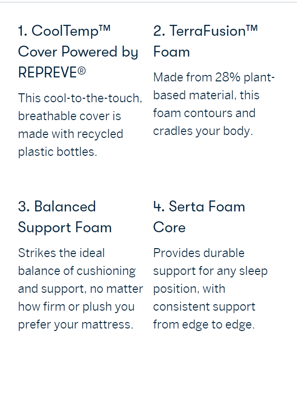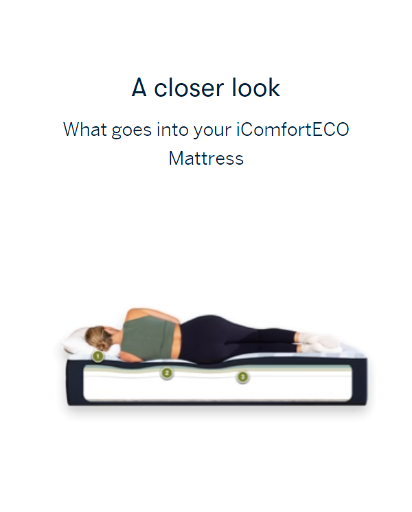 • With more comfort, support, and sustainability, the quilted hybrid iComfortECO delivers a better night's sleep that's easier on the earth. With eco-friendly materials like the CoolTemp™️ Cover Powered by Repreve®, a cool-to-the-touch, breathable cover made with the recycled plastic equivalent to 120 water bottles* and Terra Fusion™️ Memory Foam made from 28% plant-based material that provides pressure relief, cradling comfort, and reduces motion transfer for uninterrupted sleep. For even more targeted pressure relief and durable support, all models include our exclusive 5-Zone Support System made from 85% recycled steel. Designed with edge-to-edge support, ideal for any sleep position, so you rest comfortably all night long.