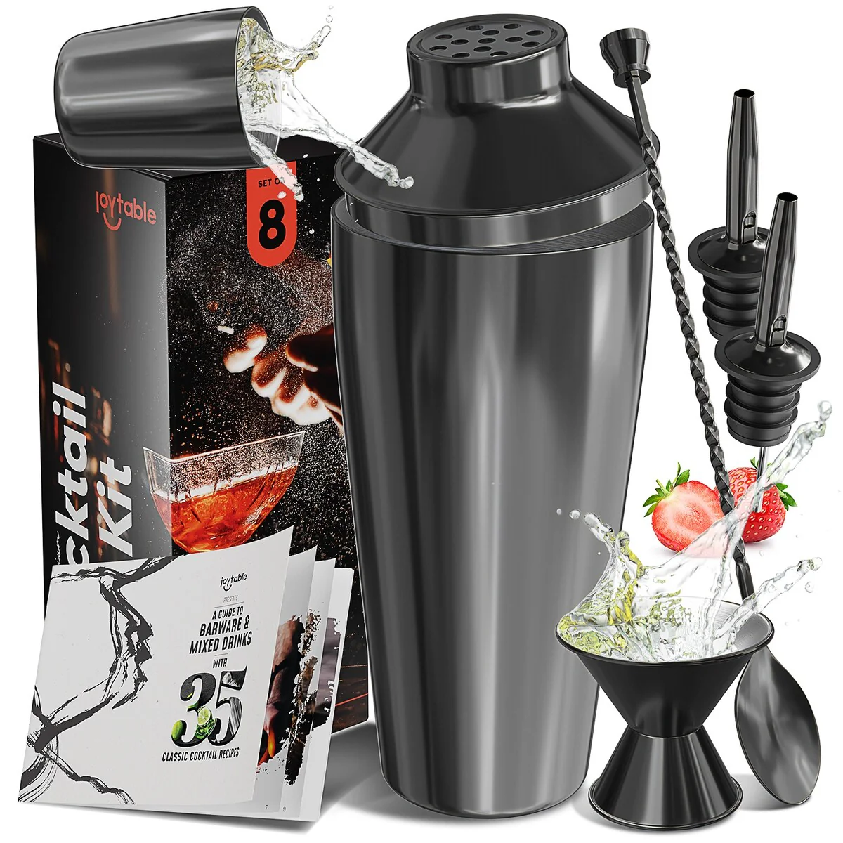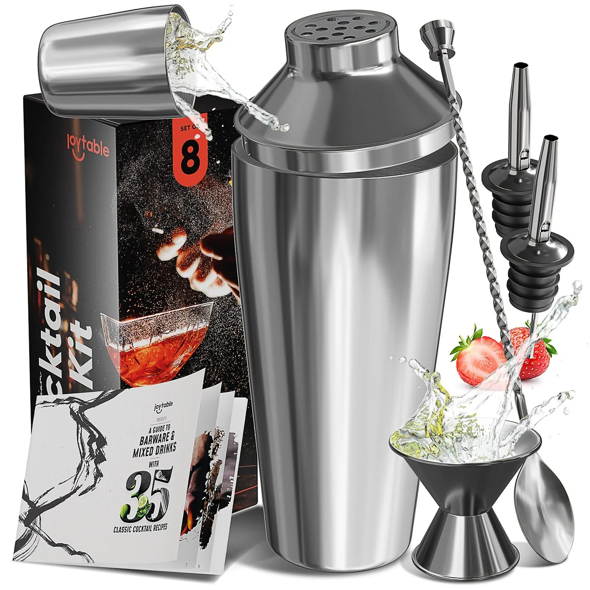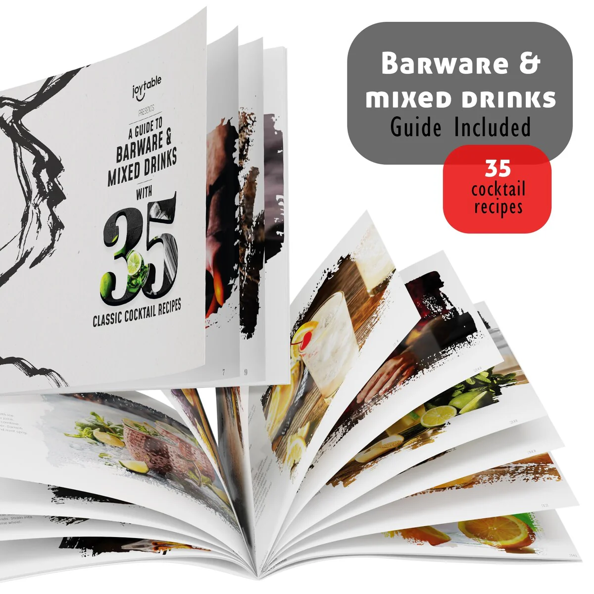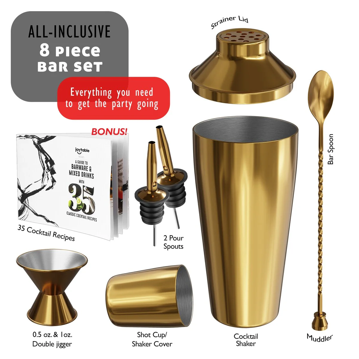 - 8 Piece Set: 2 Rubber Pourers, Cobbler Shaker with Strainer Cover (26oz), Double Jigger (0.5oz & 1oz), steel Bar Spoon (also serves as a Muddler), and Cocktail Recipe Book