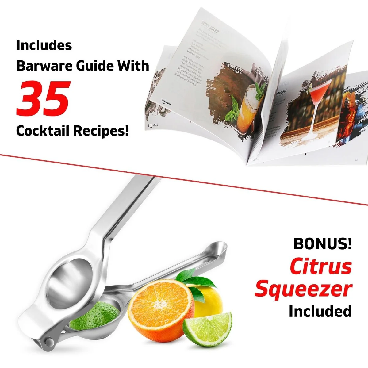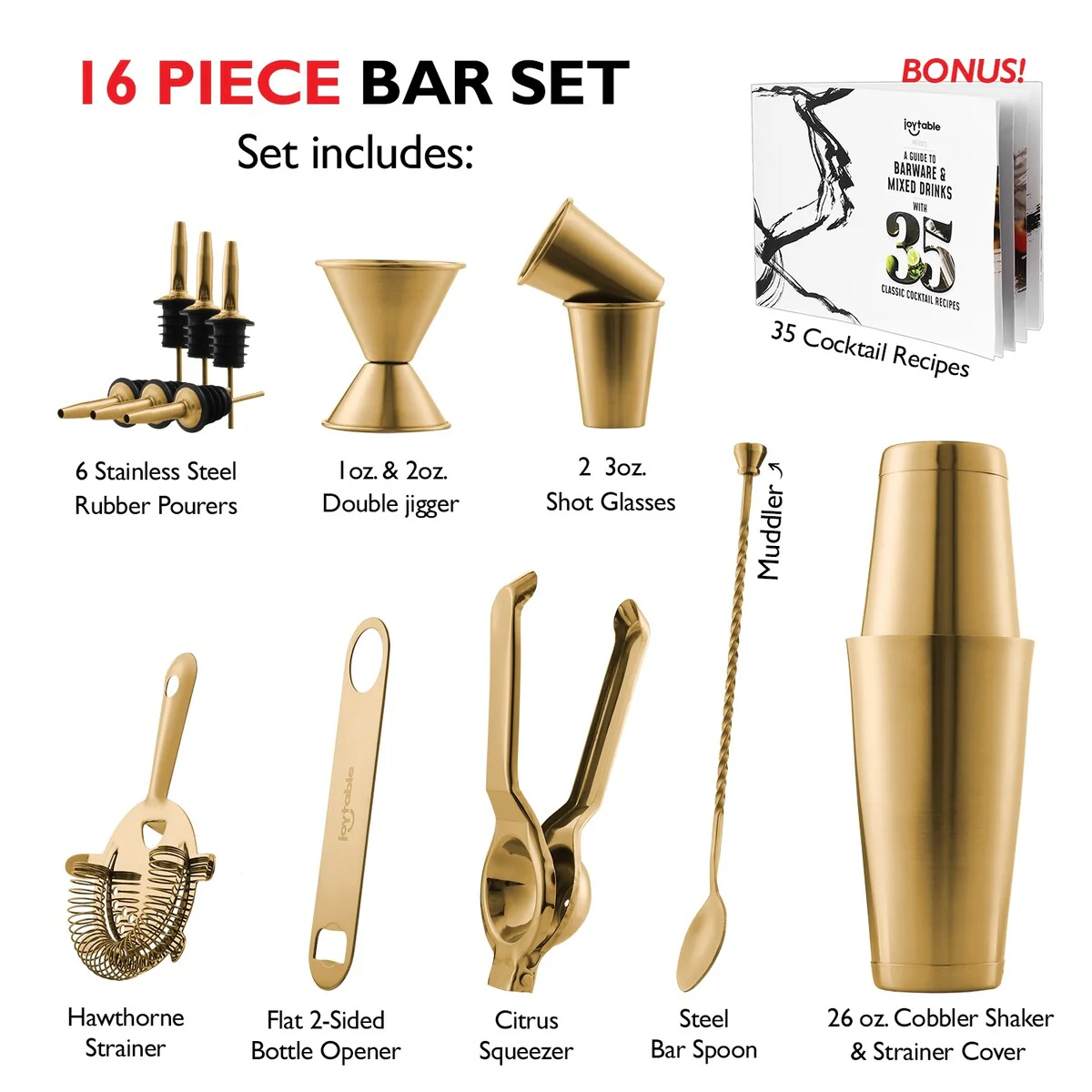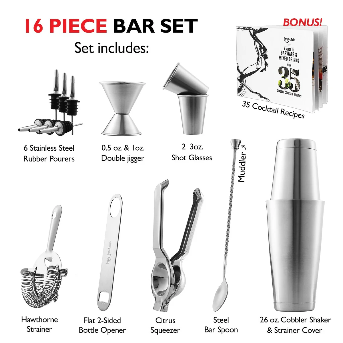 - 16 Piece Set: 6 Rubber Pourers, 2 Shot Glasses 3oz, Cobbler Shaker with Strainer Cover (26oz), Double Jigger (0.5oz & 1oz), Flat 2-Sidded Bottle Opener, Hand-Held Citrus Squeezer, Bar Spoon (also serves as a Muddler), Hawthorne Strainer, and Cocktail Recipe Book.