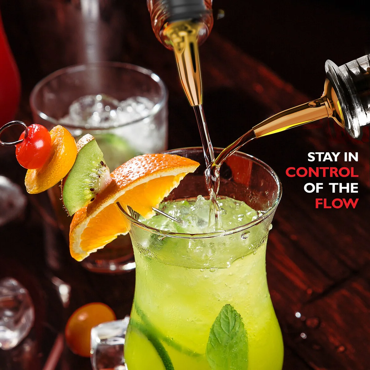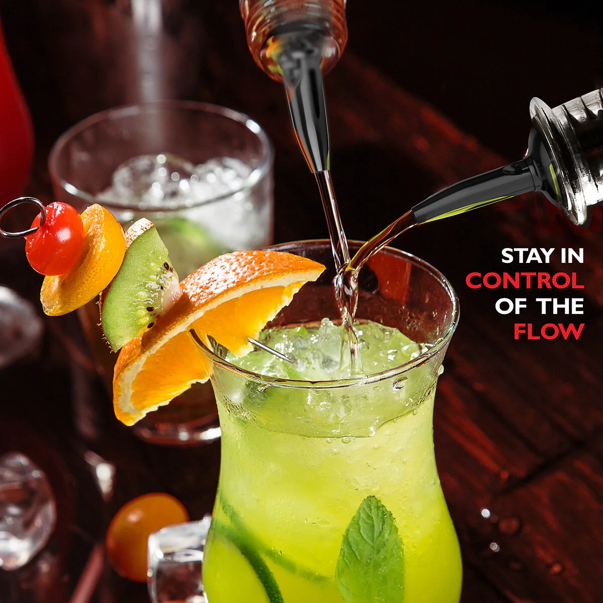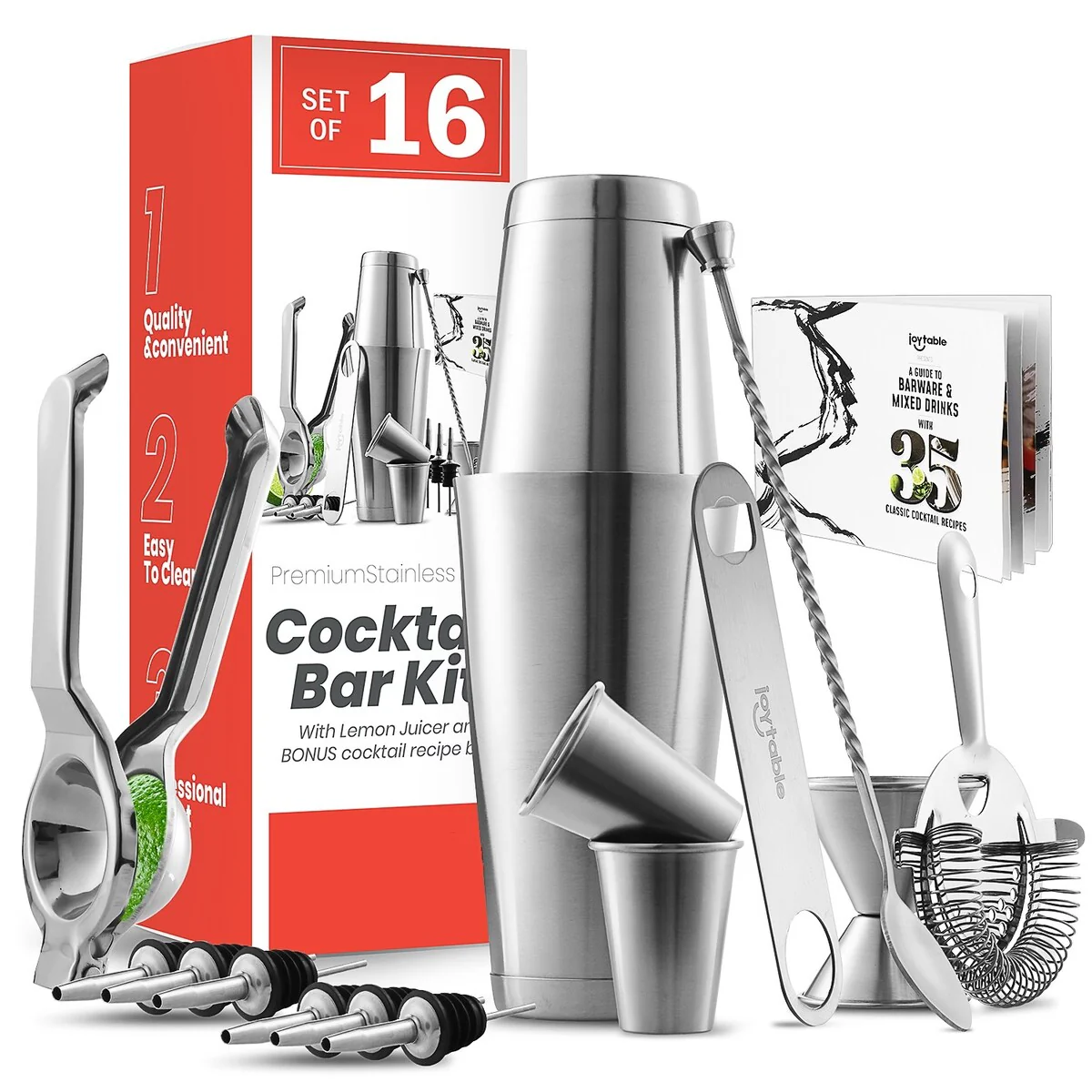 - 16 Piece Set: 6 Rubber Pourers, 2 Shot Glasses 3oz, Cobbler Shaker with Strainer Cover (26oz), Double Jigger (0.5oz & 1oz), Flat 2-Sidded Bottle Opener, Hand-Held Citrus Squeezer, Bar Spoon (also serves as a Muddler), Hawthorne Strainer, and Cocktail Recipe Book.