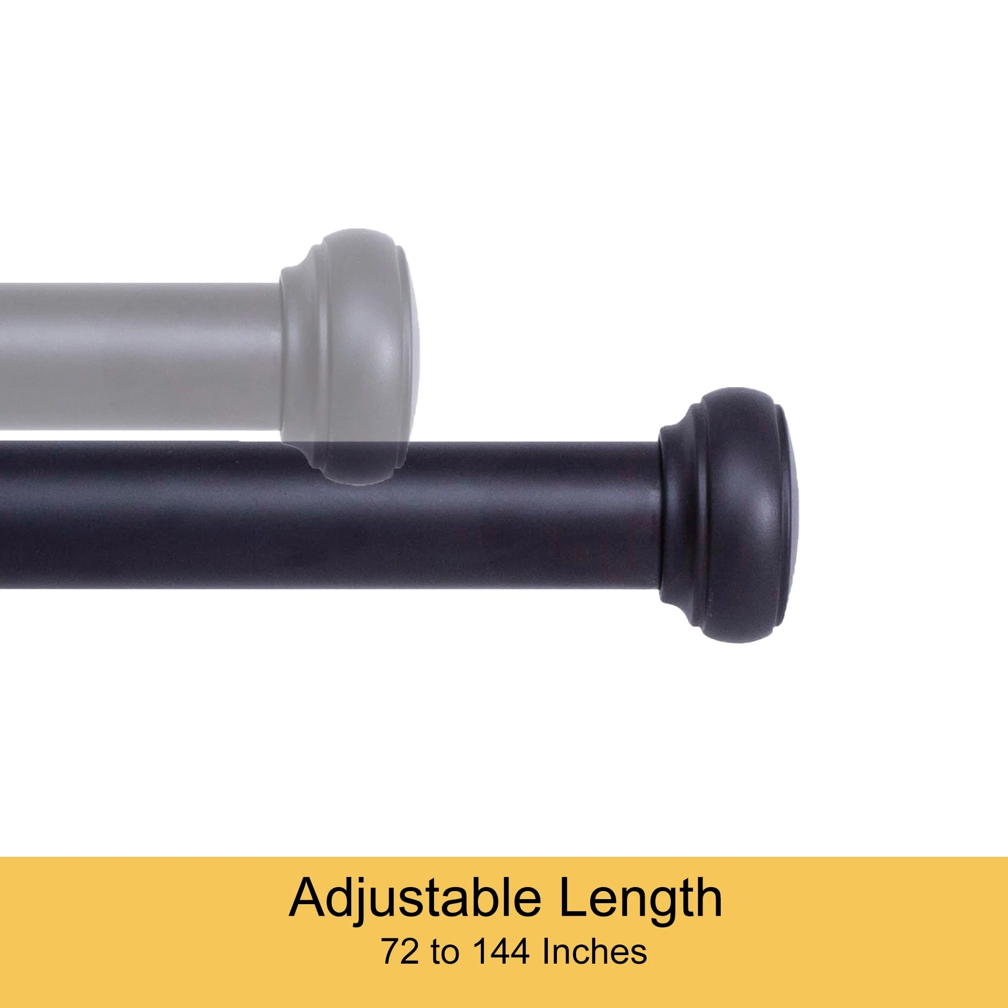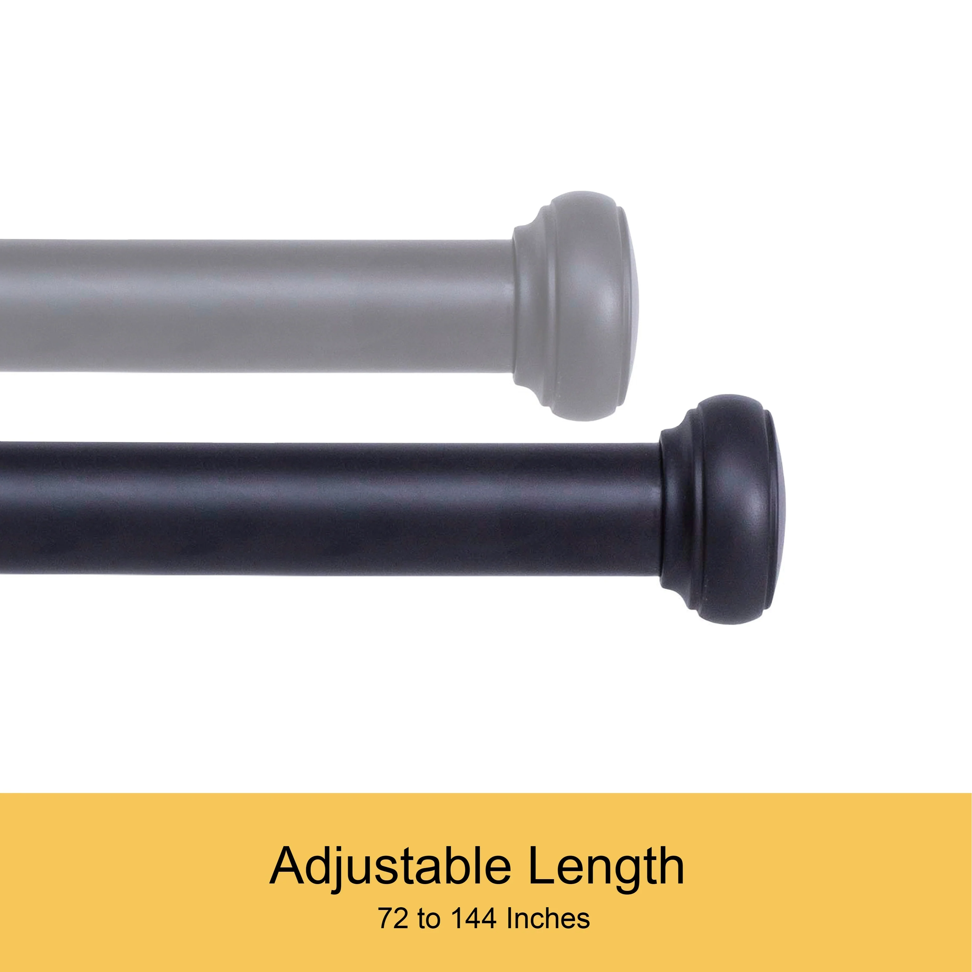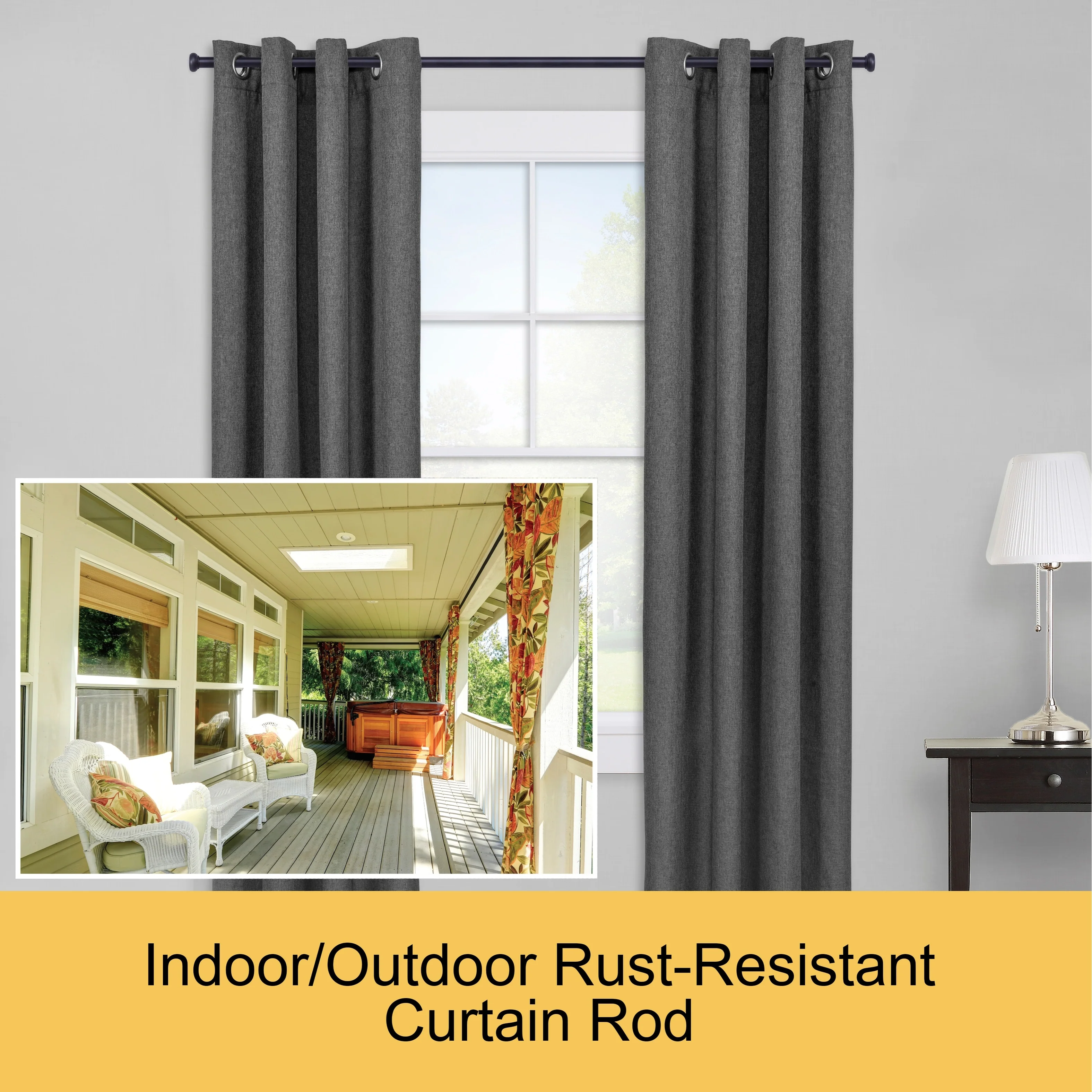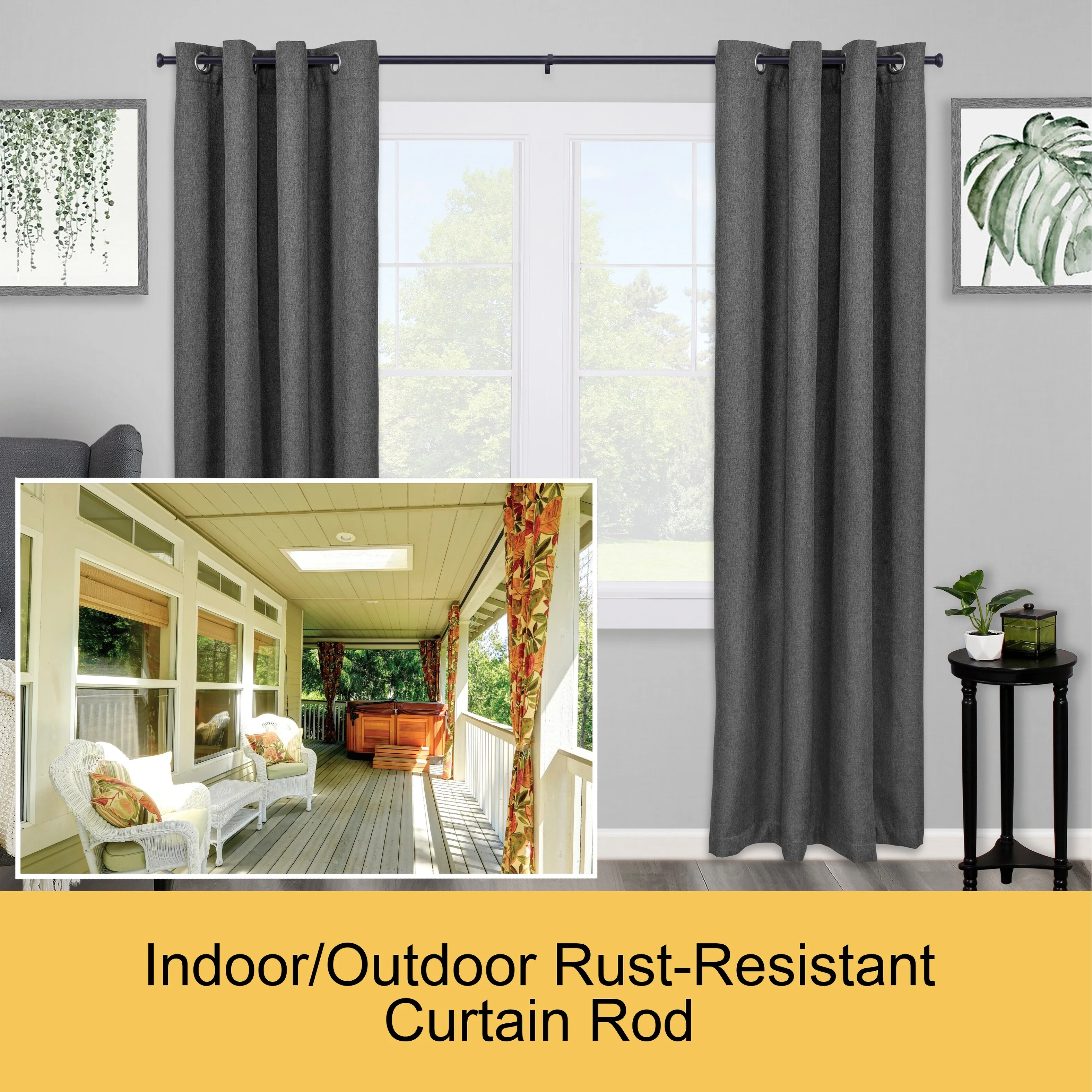 Add a touch of style inside or outside of your home with the Weaver Indoor/Outdoor Rust-Resistant Curtain Rod by Kenney.The 1 inch diameter Weaver curtain rod has a rust-resistant coating and secure brackets, making this an ideal solution for inside or outside your home. Ceiling or wall mount this rod on larger windows, in larger rooms, on your deck, or in a pergola to hang light to heavyweight curtains. The telescoping rod adjusts to fit your window and projects 3.4 inches from the wall. It is ideal for hanging curtains with pockets, grommets, back tabs, and tab tops, but can also be used with clip rings. Available in two adjustable lengths of 37-72 inches and 72-144 inches. Available in two finishes black and brushed nickelDrapery Hardware Set Includes: one telescoping steel curtain rod with decorative metal finials (0.9" L x 1.74" W x 1.74" H), two mounting brackets, one center support, screws, drywall anchors, and installation instructions.