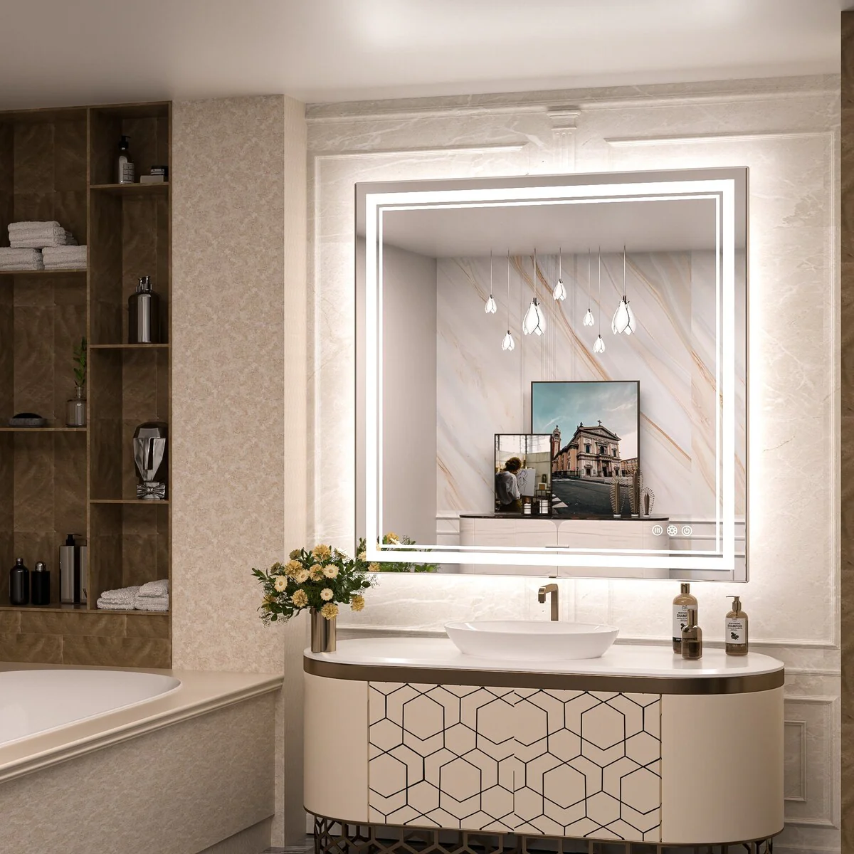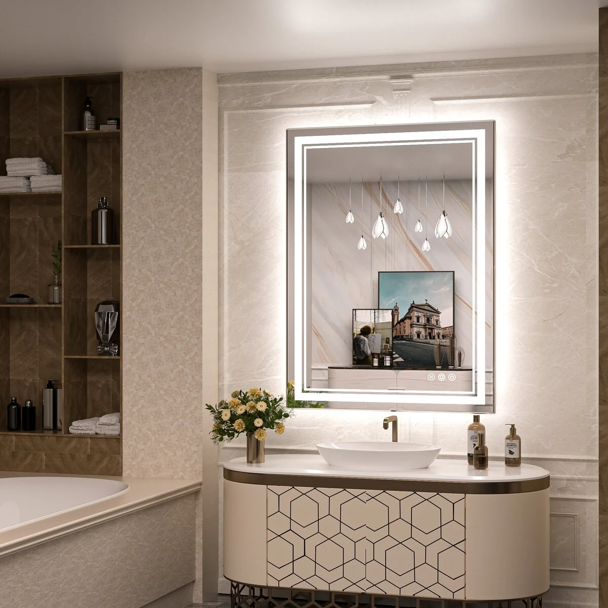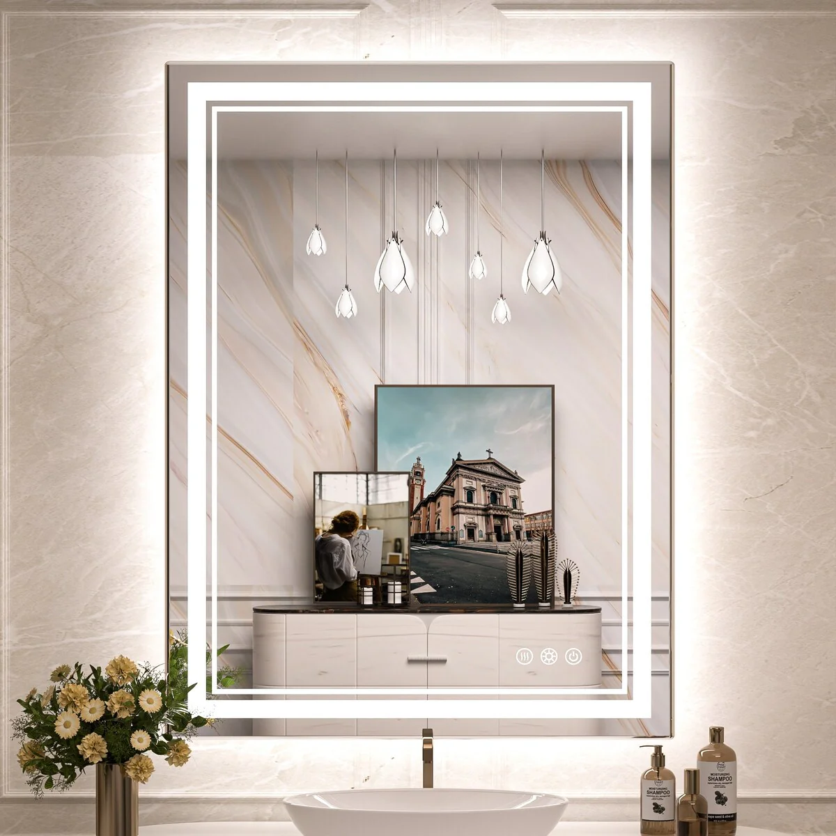 This vanity mirror is high quality and well-designed in various sizes. You can enjoy 3 styles at once with our featured double-led stirps. It also has 3 color temperatures by short-pressing the button and long-pressing for 3s to adjust brightness steplessly. An innovative smart defogger with 1-hour delayed Shut-off keeps the glass fog-free all the time. This high-quality mirror has a 50,000-hour LED lifetime and is made with environmentally friendly materials. The waterproof and moisture-proof backing ensures safe lighting in wet bathroom environments.