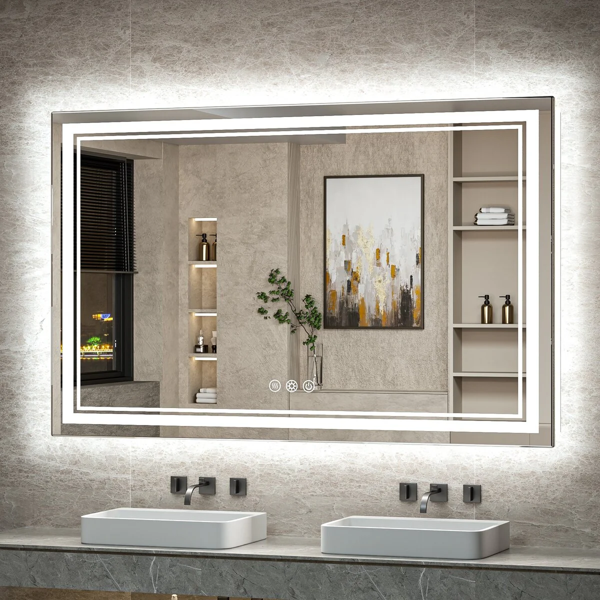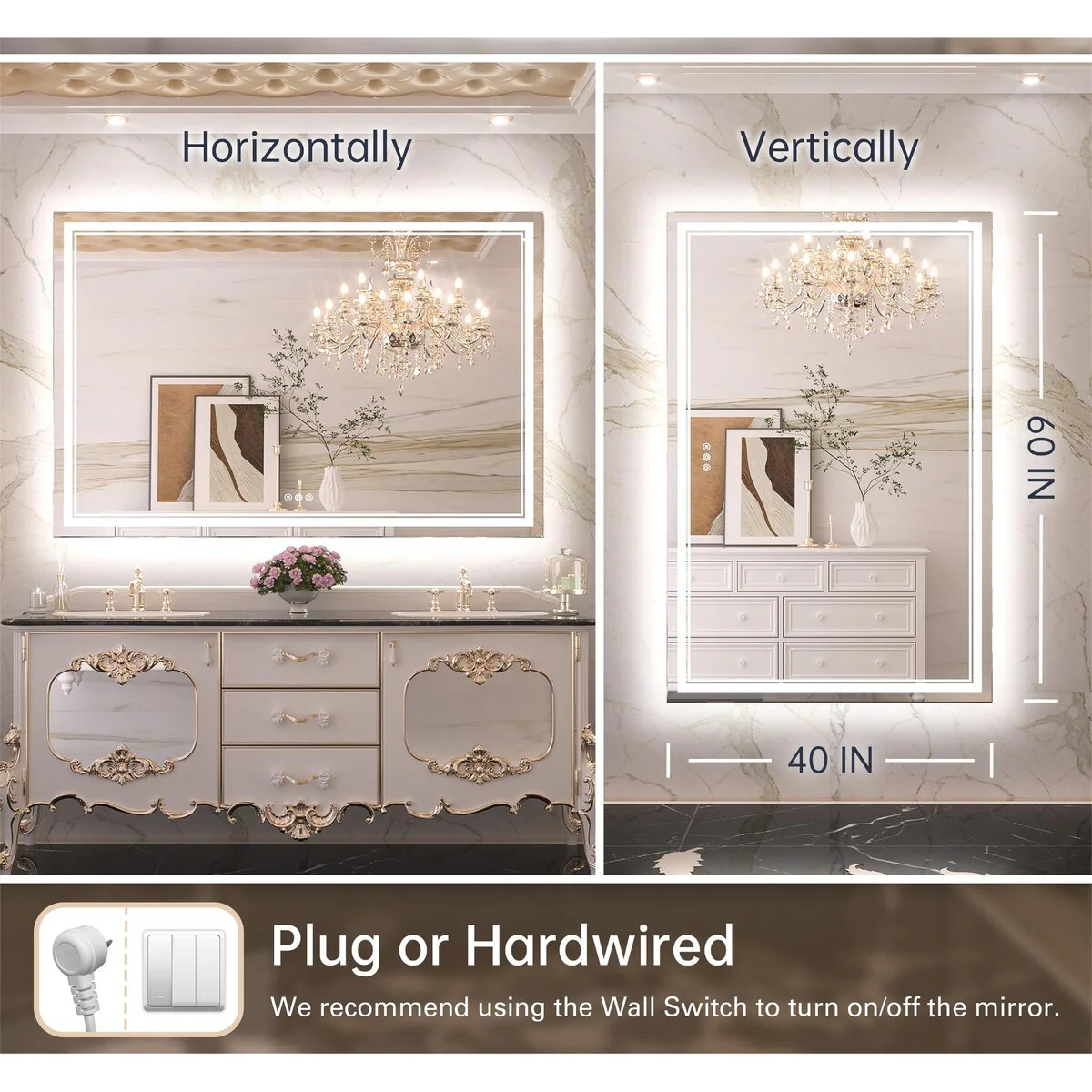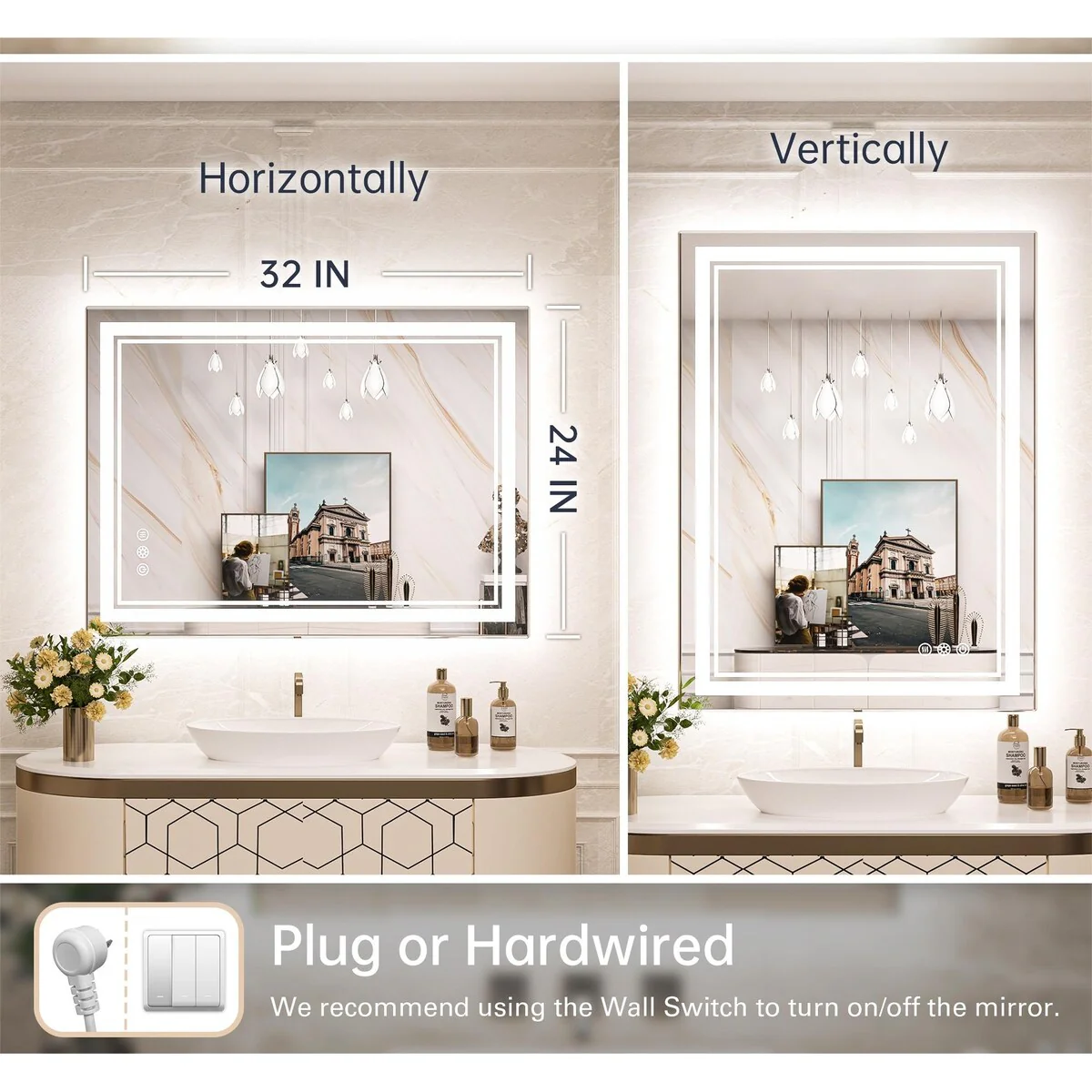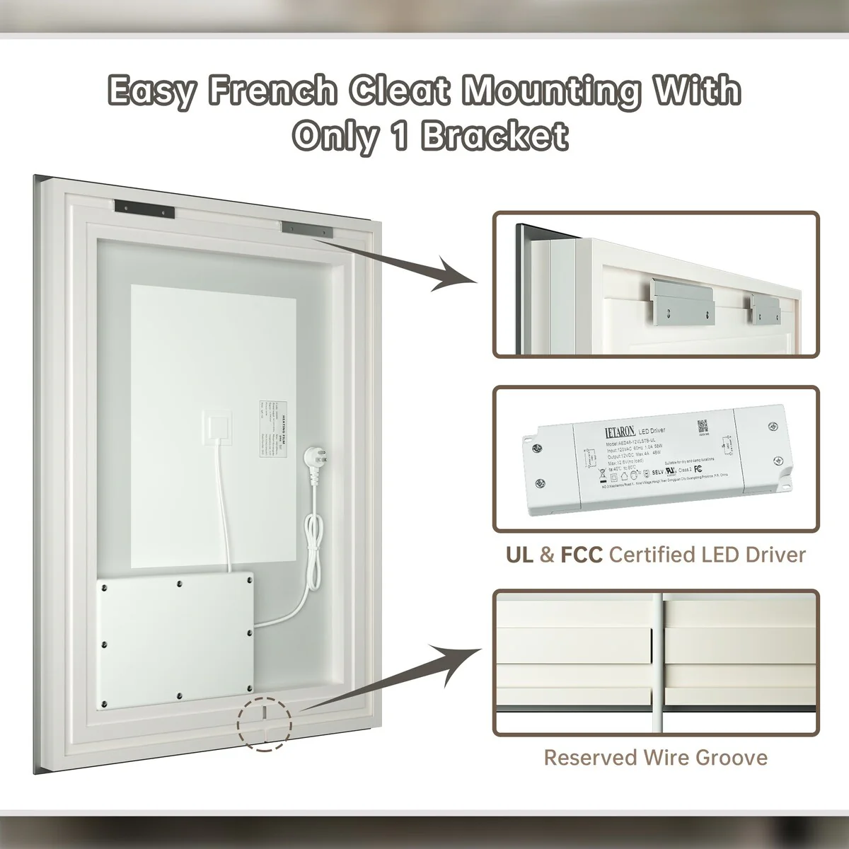 - [French Cleat Mounting] The LED bathroom mirror is designed with 4 built-in slots on the back for hanging horizontally or vertically. Super easy to install with French cleat brackets. Hardware Included. We have designed sturdy 5-layer packaging, so you don't need to worry about receiving a broken mirror.