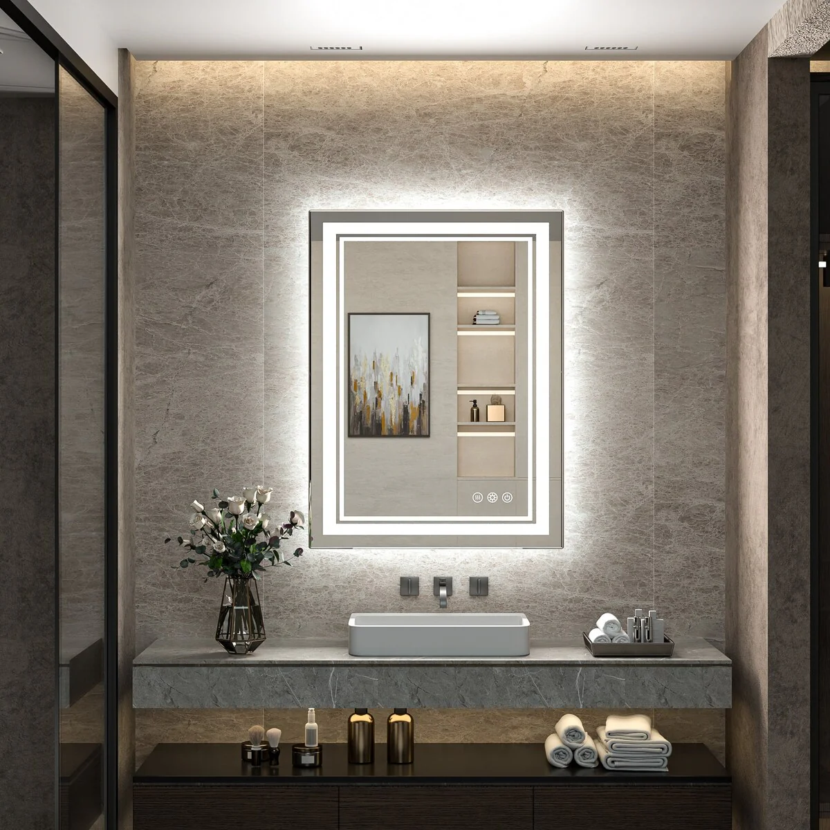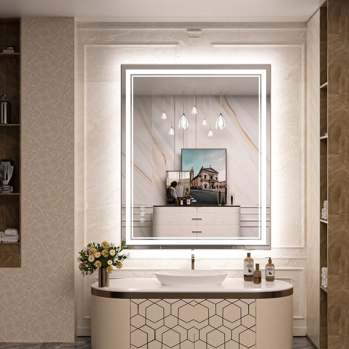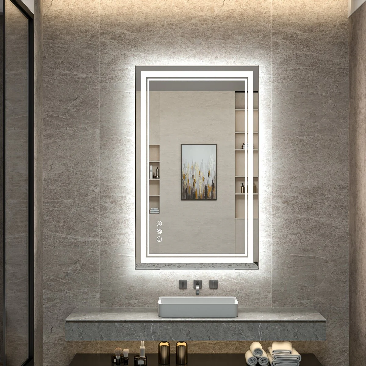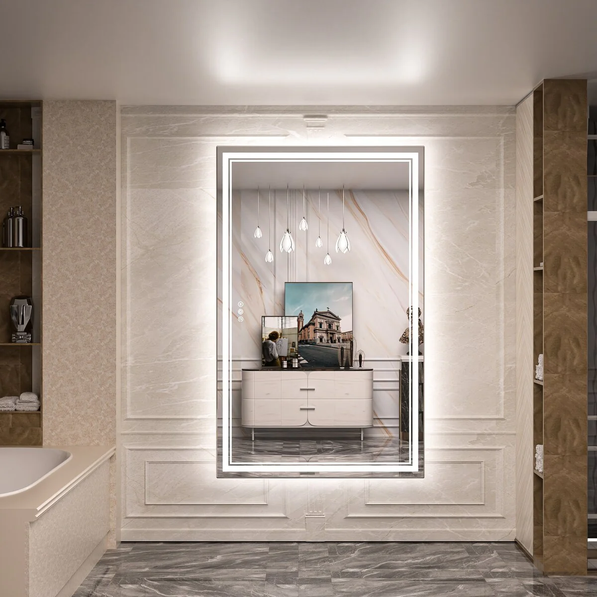 - [French Cleat Mounting] The LED bathroom mirror is designed with 4 built-in slots on the back for hanging horizontally or vertically. Super easy to install with French cleat brackets. Hardware Included. We have designed sturdy 5-layer packaging, so you don't need to worry about receiving a broken mirror.
