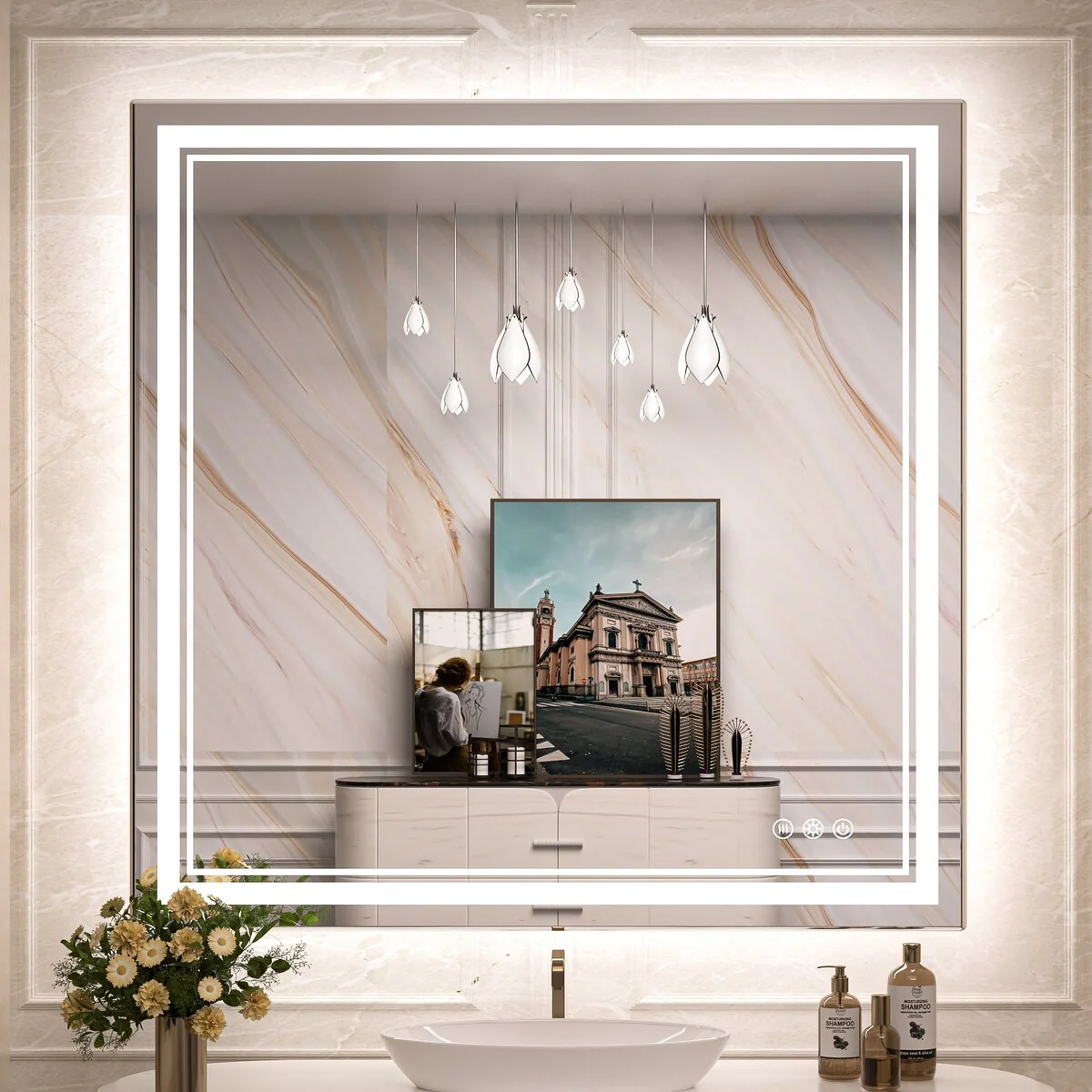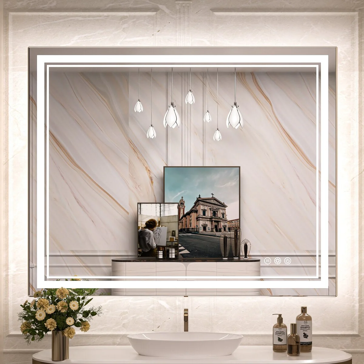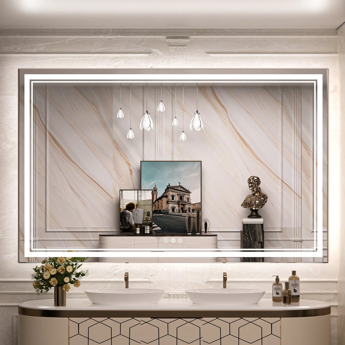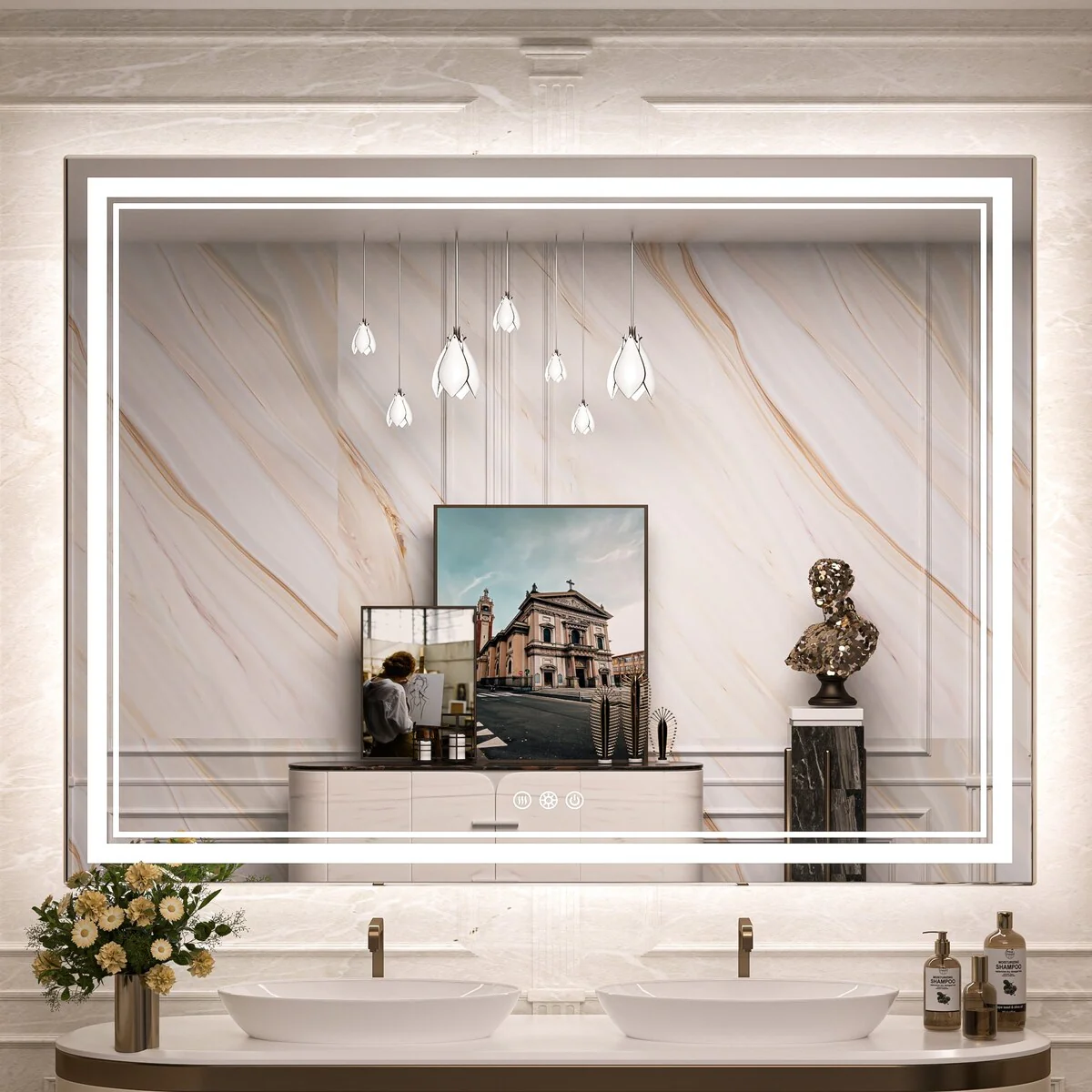 - [French Cleat Mounting] The LED bathroom mirror is designed with 4 built-in slots on the back for hanging horizontally or vertically. Super easy to install with French cleat brackets. Hardware Included. We have designed sturdy 5-layer packaging, so you don't need to worry about receiving a broken mirror.