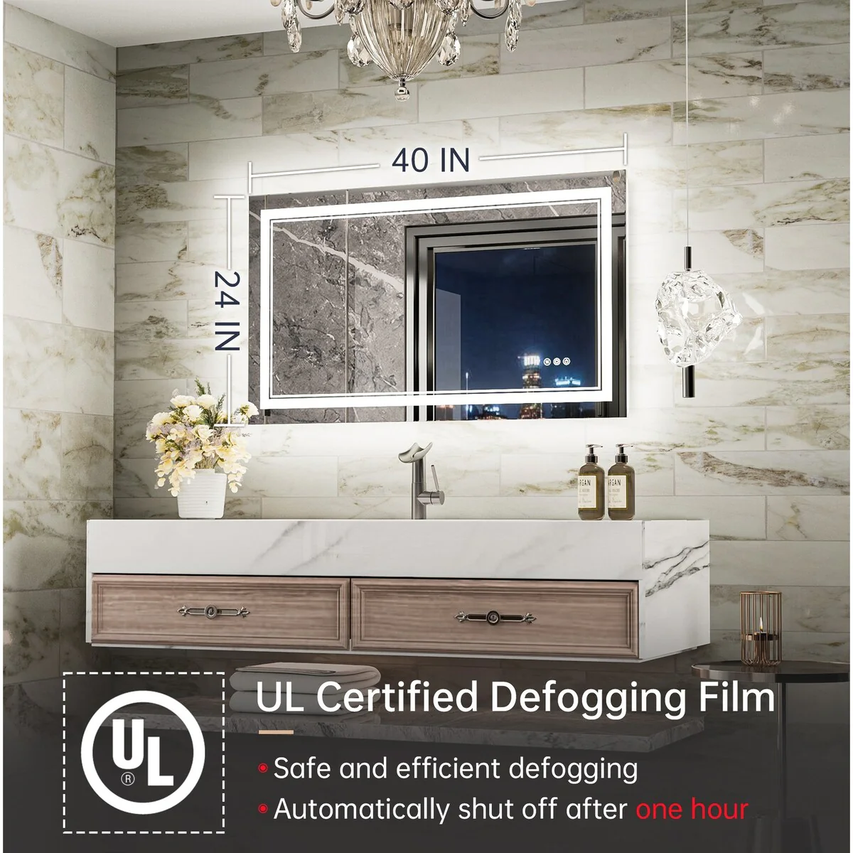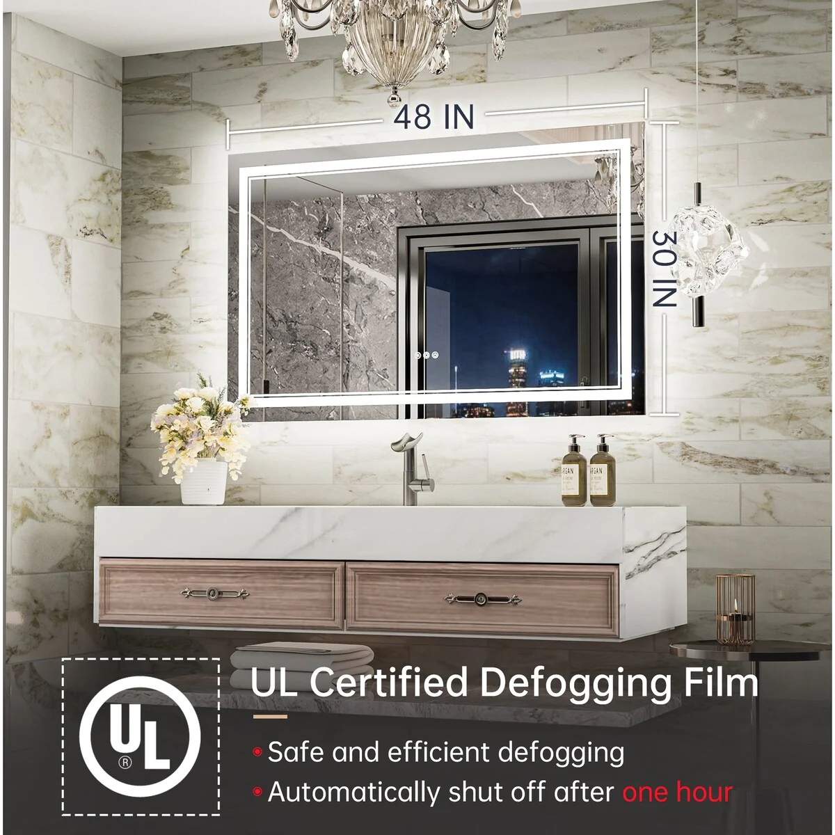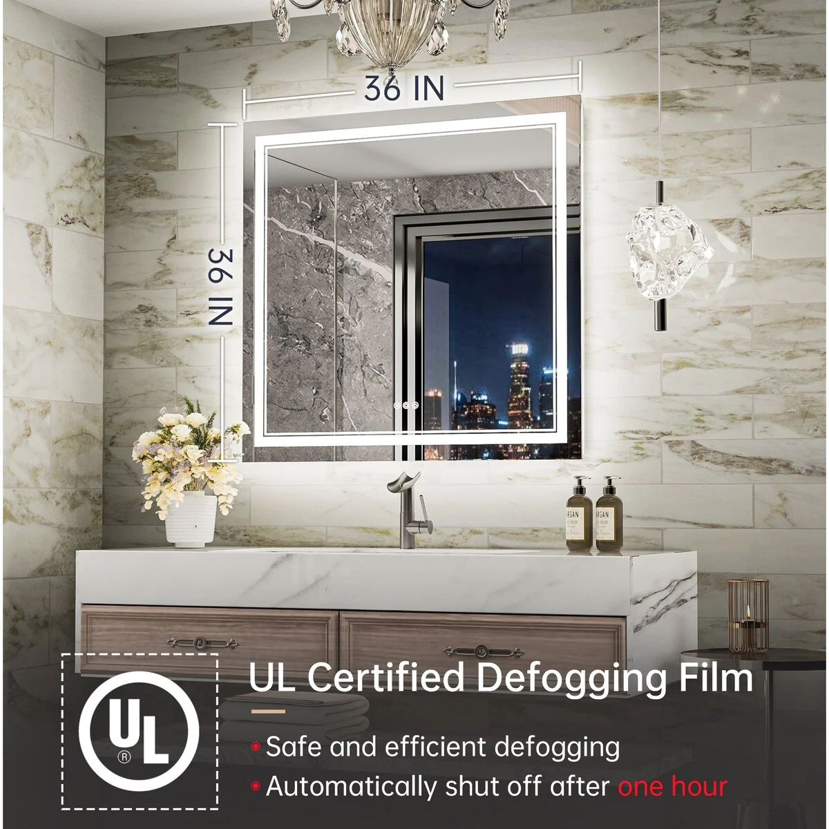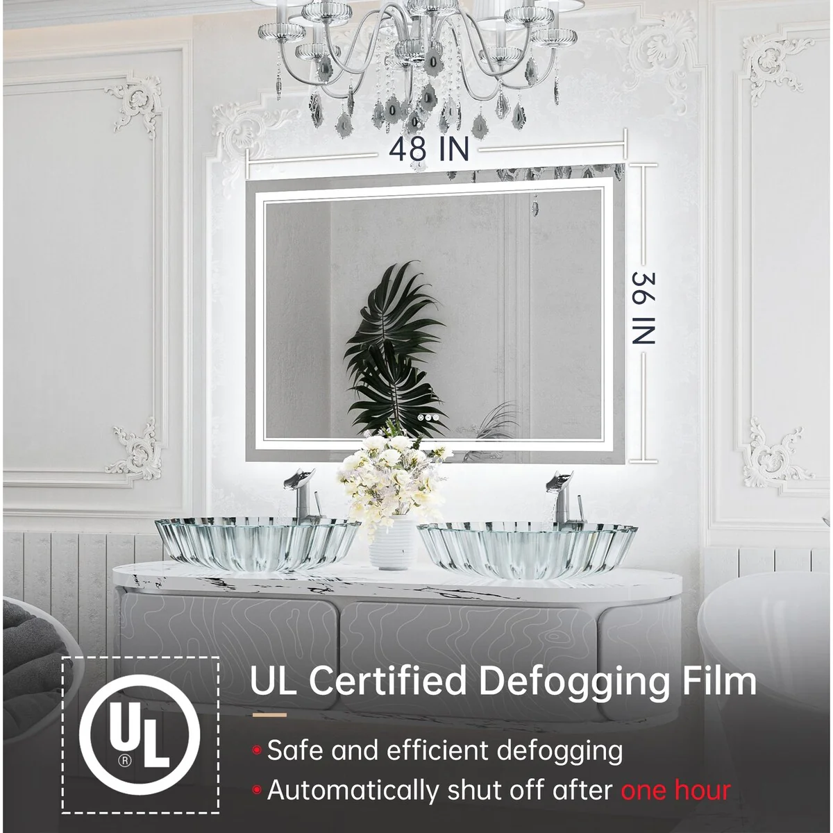 - [Safe & Defogging] The defogging function may take 5-10 minutes to completely cover/clear the entire bathroom mirror. *Note please turn on this function before you use it. To avoid overheating, the anti-fog function will turn off itself after one hour. IP54 waterproof rating ensures safe lighting in wet bathrooms.