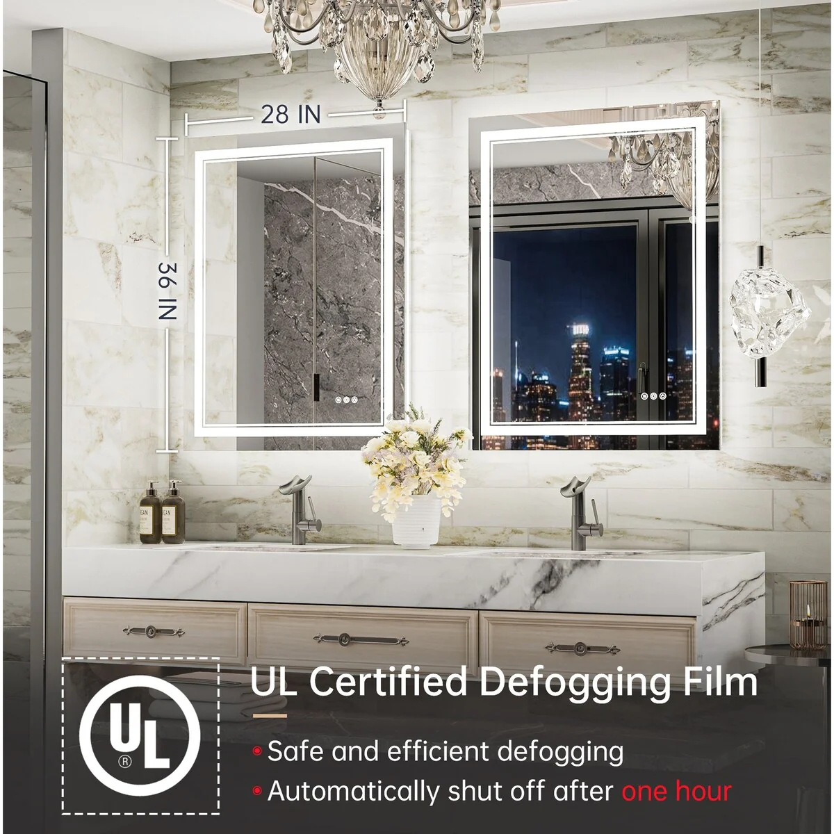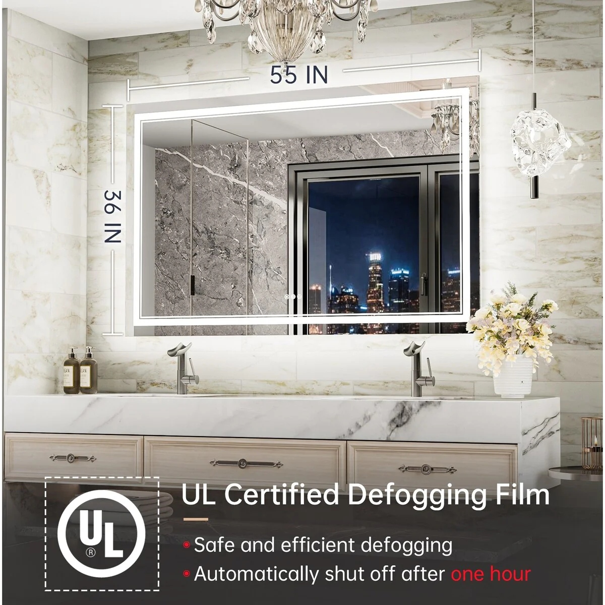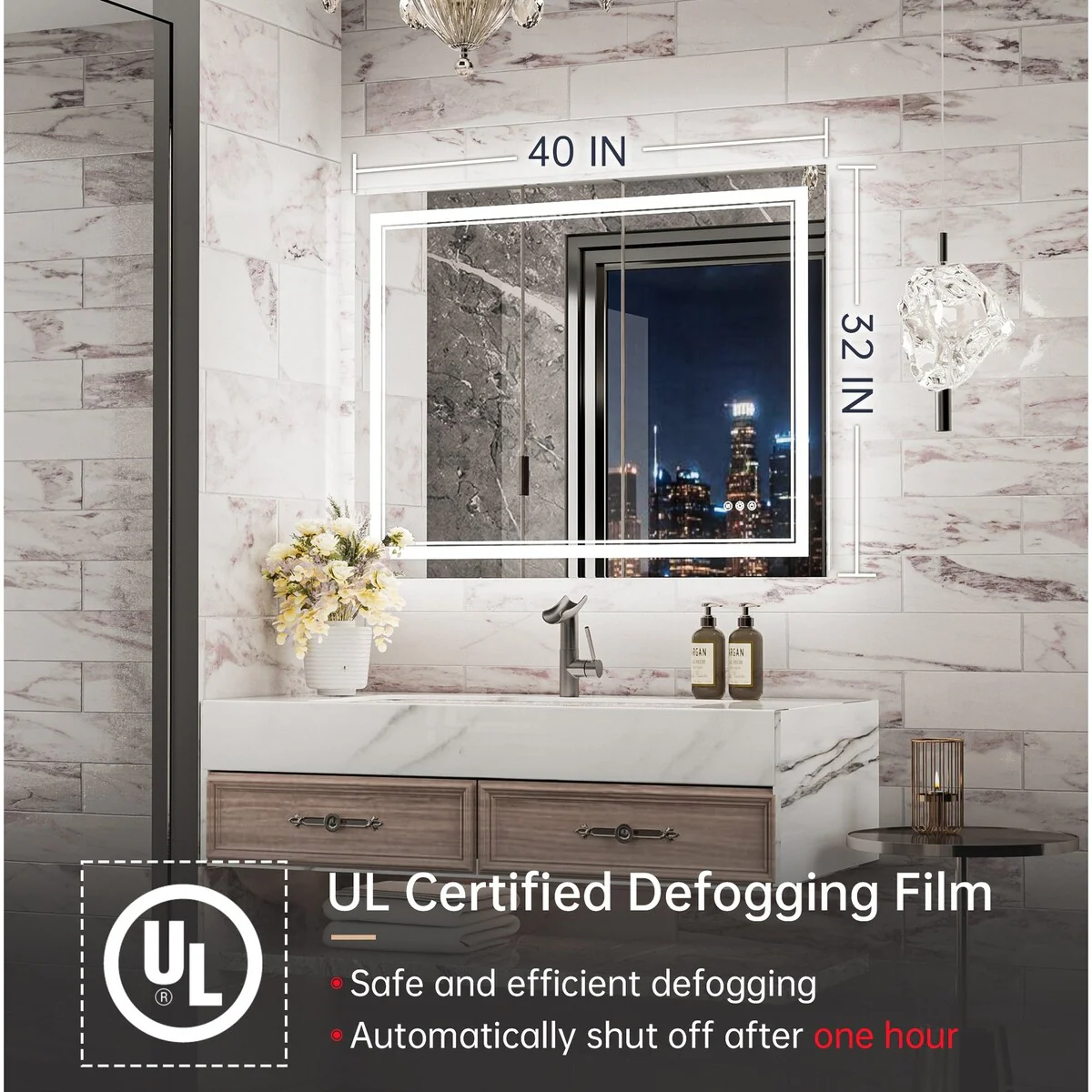- [Safe & Defogging] The defogging function may take 5-10 minutes to completely cover/clear the entire bathroom mirror. *Note please turn on this function before you use it. To avoid overheating, the anti-fog function will turn off itself after one hour. IP54 waterproof rating ensures safe lighting in wet bathrooms.