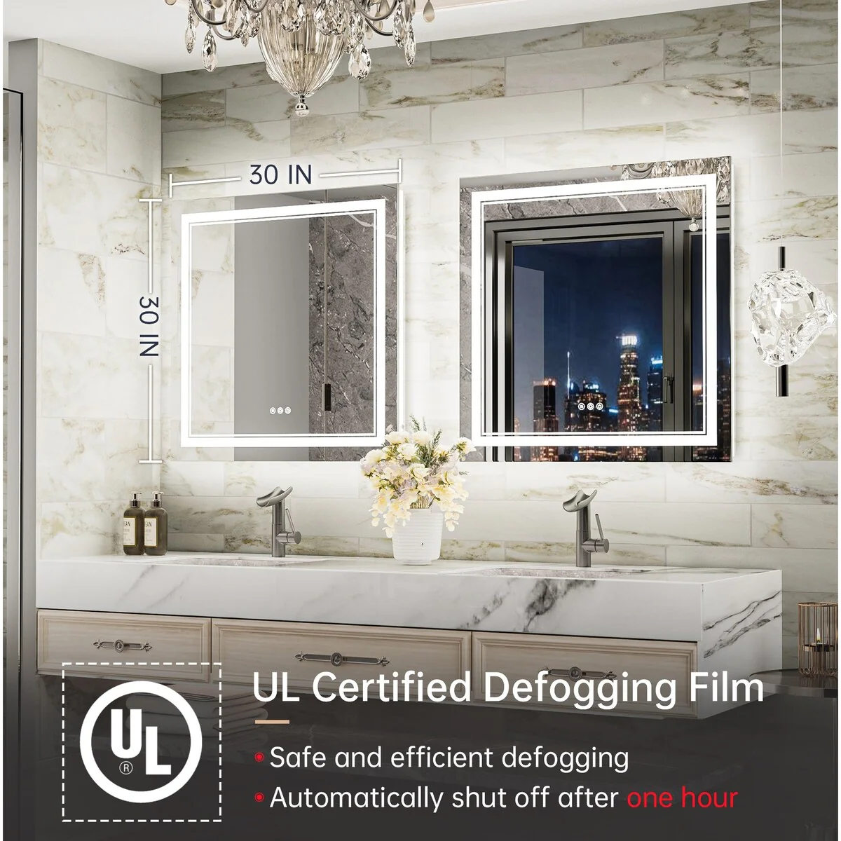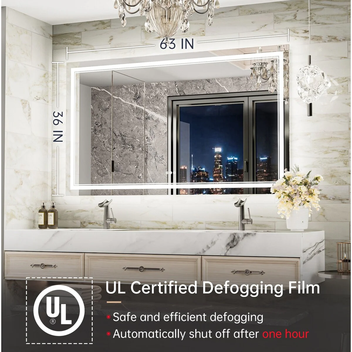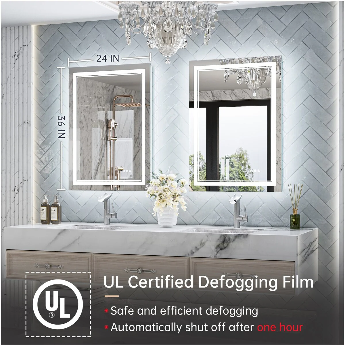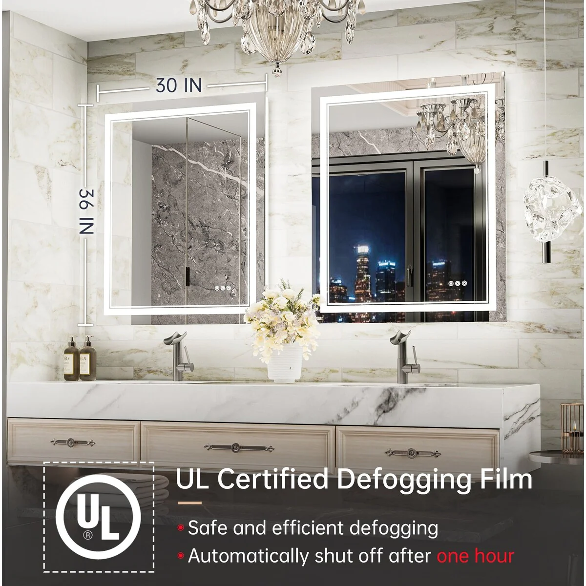 - [Safe & Defogging] The defogging function may take 5-10 minutes to completely cover/clear the entire bathroom mirror. *Note please turn on this function before you use it. To avoid overheating, the anti-fog function will turn off itself after one hour. IP54 waterproof rating ensures safe lighting in wet bathrooms.