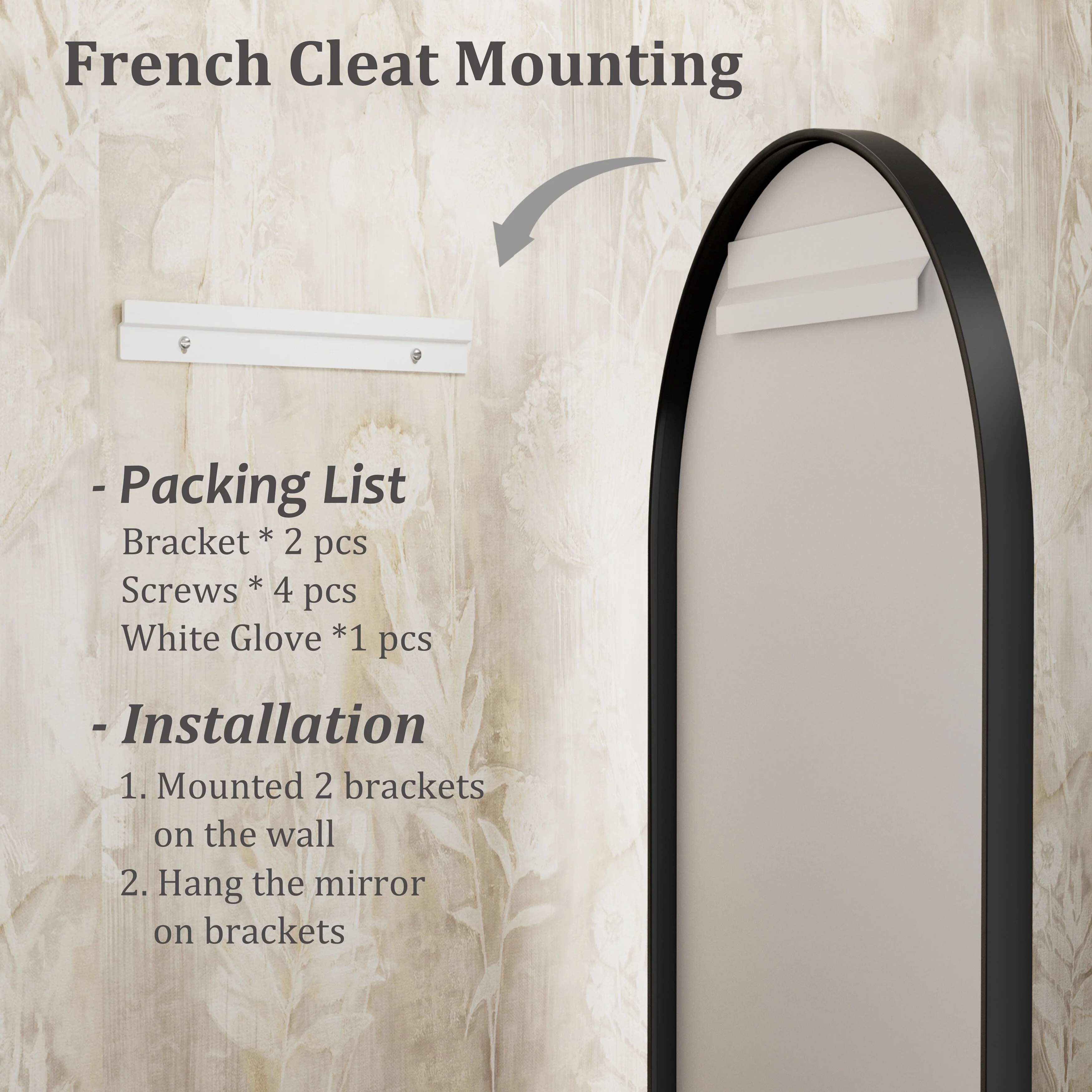 - Easy French Cleat Mounting:Install the bracket to the wall using the included screws and anchors and then just hang the mirror on. (The mirror can be removed from the bracket and leaned against the wall as ornaments.)