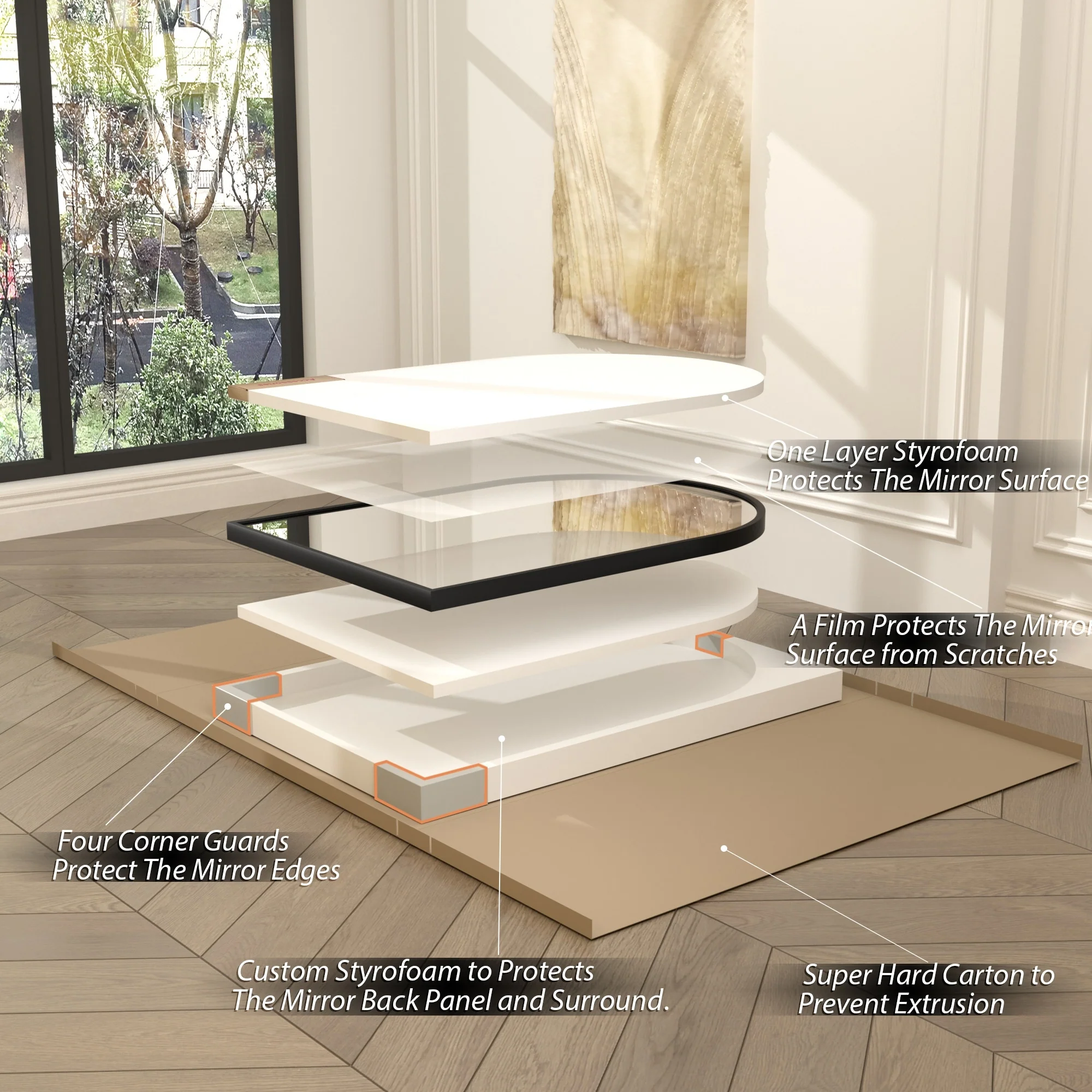 - Professional Packaging: Each mirror is made to a secret standard and secured with customized thick foam and sturdy corner guards in a carton box. Before delivered, it passed all rigorous tests including dropping, impact test, etc. Only for you to provide the perfect mirror.