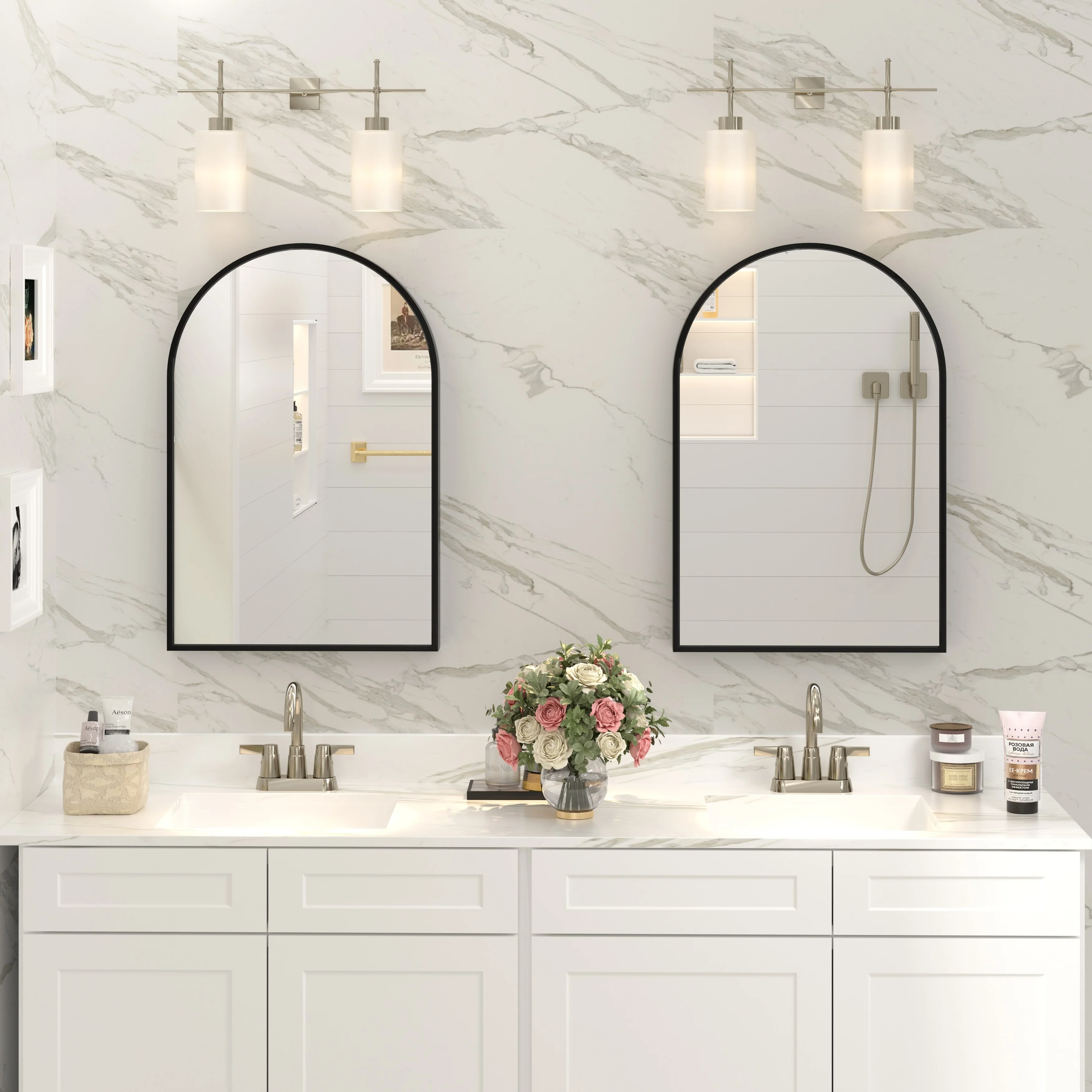 - Room: Bathroom, restroom, powder room, makeup room, living room, entryway and fireplace