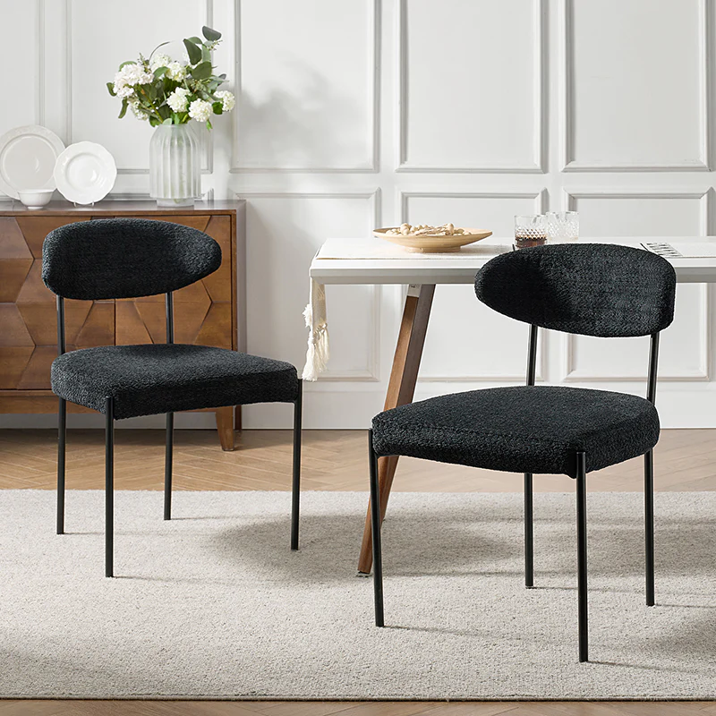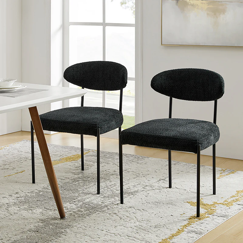 Indulge in modern elegance with this Scandinavian-inspired dining chair set of 2. Crafted with contemporary flair, its sleek metal legs with adjustable feet provide stability and a touch of sophistication. The chair set of 2 features a distinctive curved backrest for added comfort and style. Embrace luxury with the plush lamb wool upholstery, ensuring a cozy and inviting atmosphere in your dining room, kitchen, or living room. The armless design promotes a minimalist aesthetic, while the removable and washable short plush boucle fabric seat cover adds practicality to your lifestyle. If you need to remove and wash the seat cushion, please remove the chair legs first. Elevate your dining experience with this modern design and comfort fusion, where form seamlessly meets function.