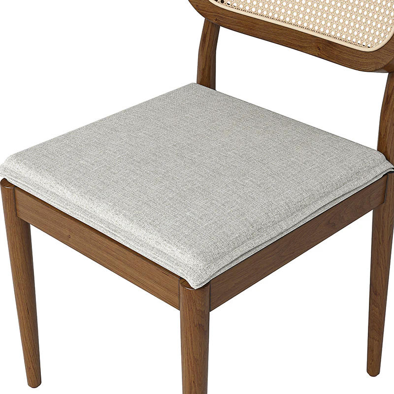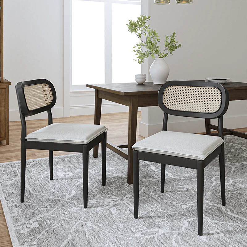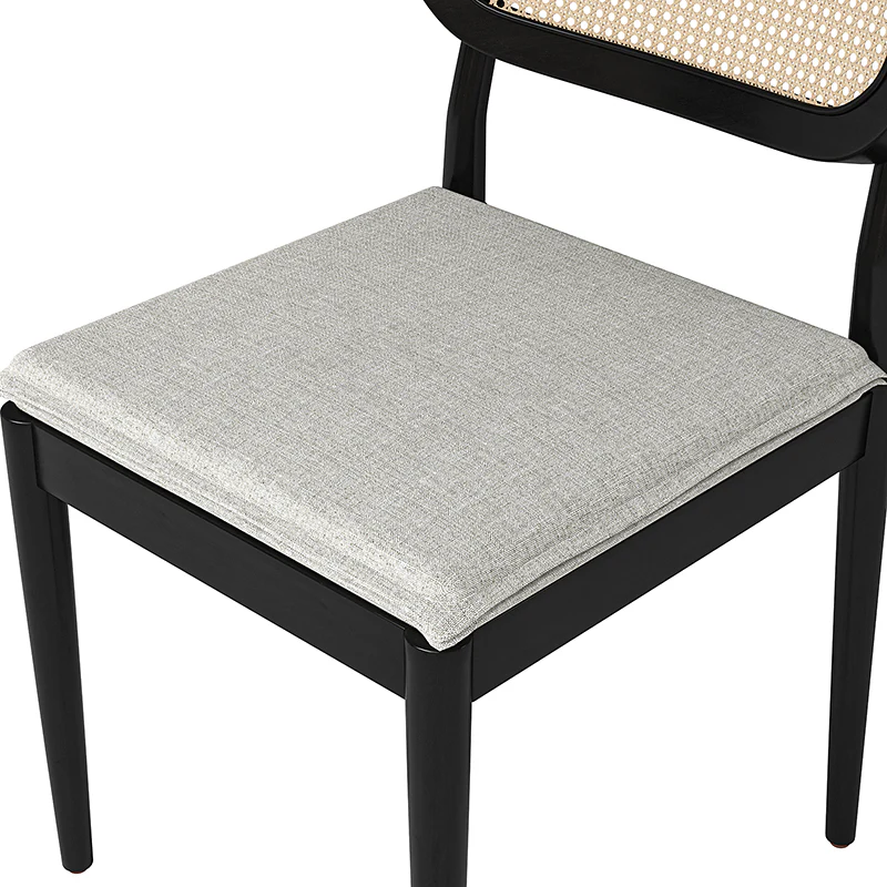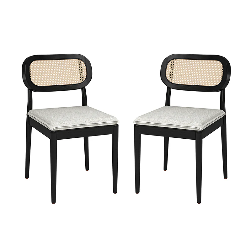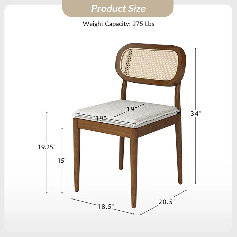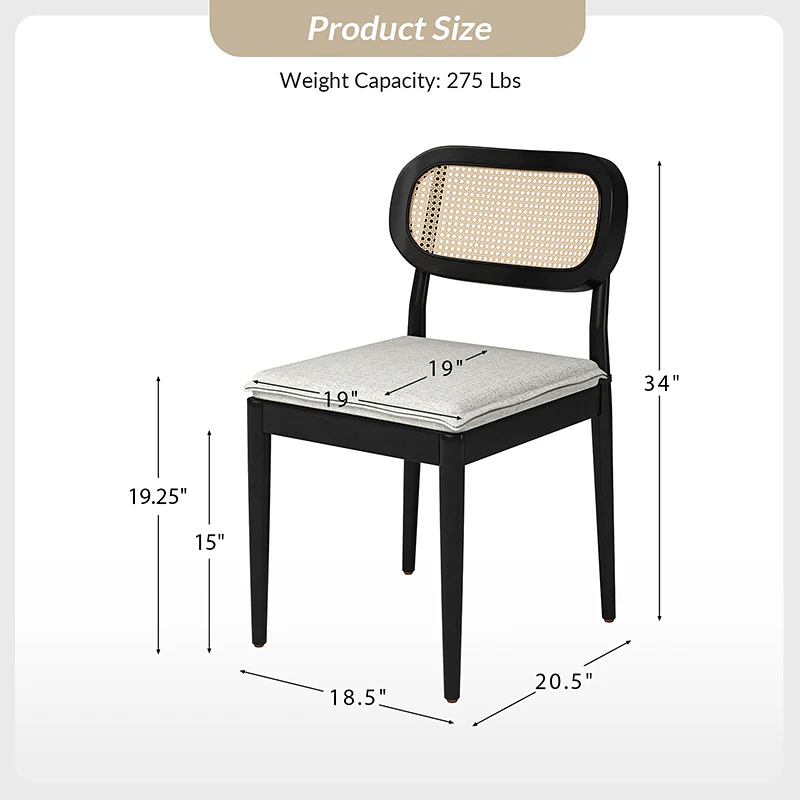 Embodying a harmonious blend of modern sophistication and organic allure, this contemporary dining chair set of 2 has a gracefully woven rattan backrest, which imparts a touch of natural elegance and offers excellent lumbar support. The sturdy rubber wood frame ensures both stability and longevity, while the solid wood legs provide a robust foundation for the chairs. Enhancing its adaptability, this chair set boasts adjustable feet, allowing it to sit firmly and level on various floor surfaces. Moreover, the seat cushions are thoughtfully designed to be removable and washable, facilitating easy maintenance while you can take off the seat cushions and sit alone. Whether entertaining guests or enjoying a quiet meal, this chair set effortlessly combines style and function, elevating your dining experience to a new level. Every element of this modern dining chair set, from its sturdy construction to its attention to detail, speaks volumes about its quality and design, enhancing the aesthetic of your living space.