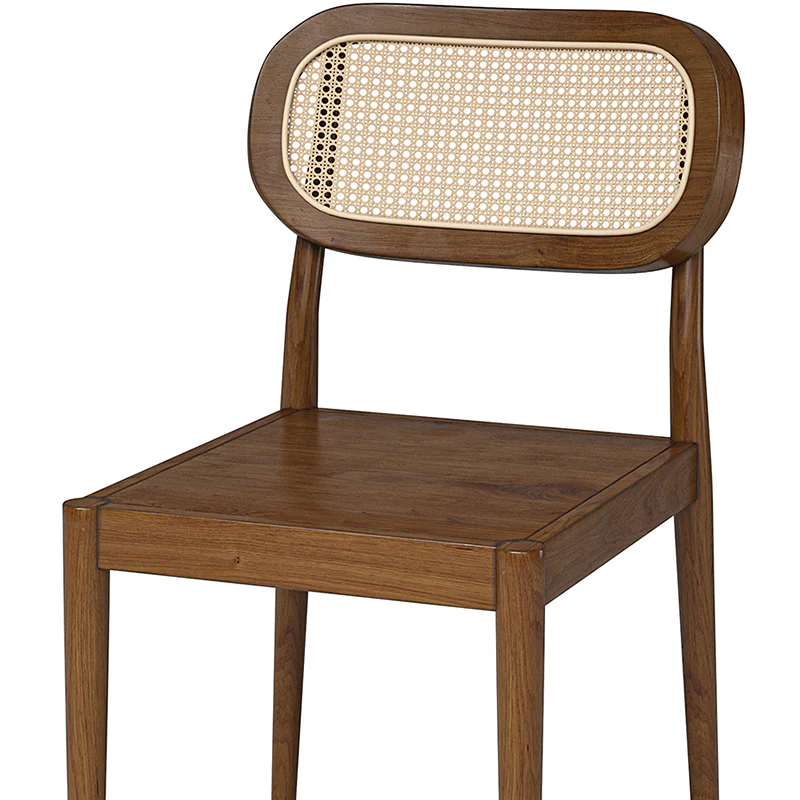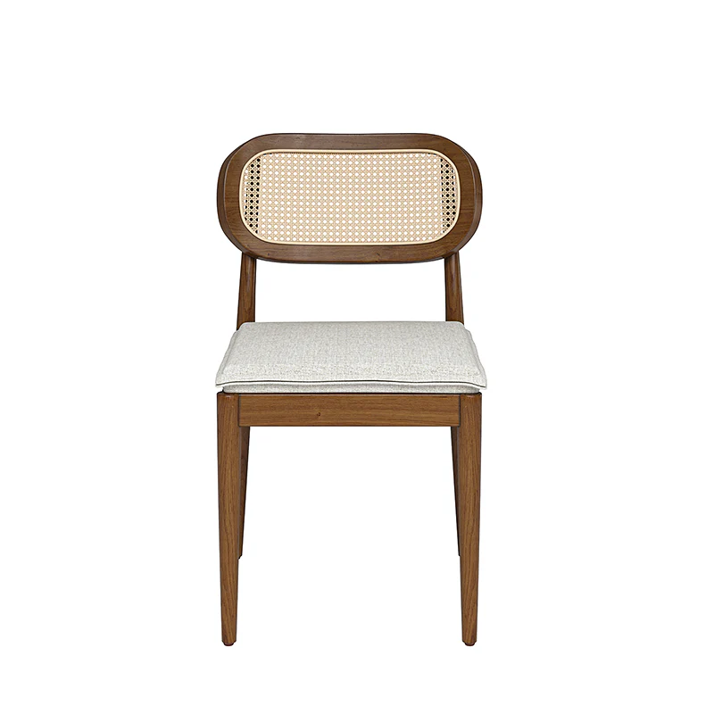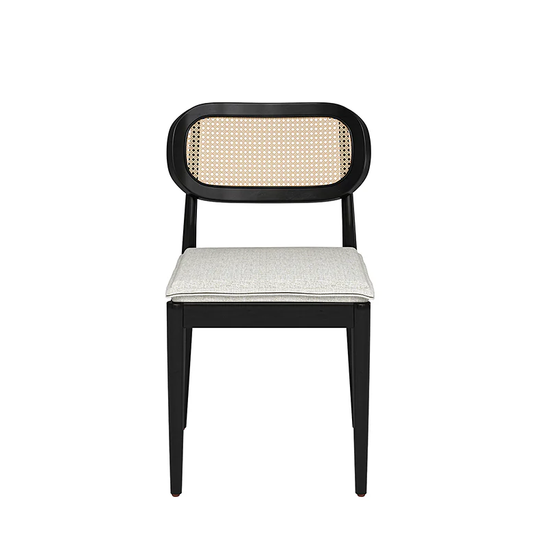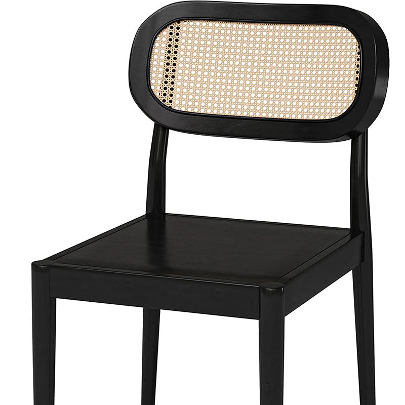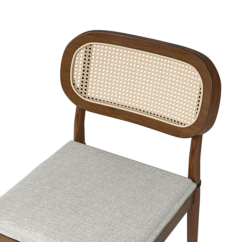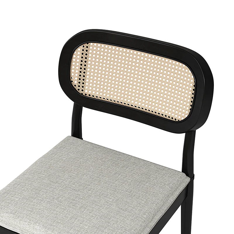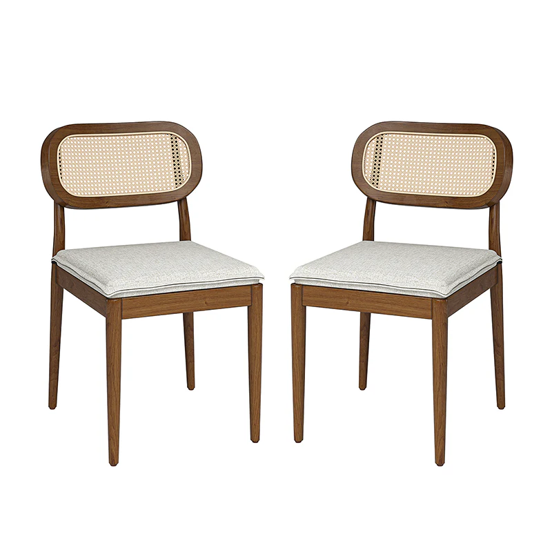 Embodying a harmonious blend of modern sophistication and organic allure, this contemporary dining chair set of 2 has a gracefully woven rattan backrest, which imparts a touch of natural elegance and offers excellent lumbar support. The sturdy rubber wood frame ensures both stability and longevity, while the solid wood legs provide a robust foundation for the chairs. Enhancing its adaptability, this chair set boasts adjustable feet, allowing it to sit firmly and level on various floor surfaces. Moreover, the seat cushions are thoughtfully designed to be removable and washable, facilitating easy maintenance while you can take off the seat cushions and sit alone. Whether entertaining guests or enjoying a quiet meal, this chair set effortlessly combines style and function, elevating your dining experience to a new level. Every element of this modern dining chair set, from its sturdy construction to its attention to detail, speaks volumes about its quality and design, enhancing the aesthetic of your living space.