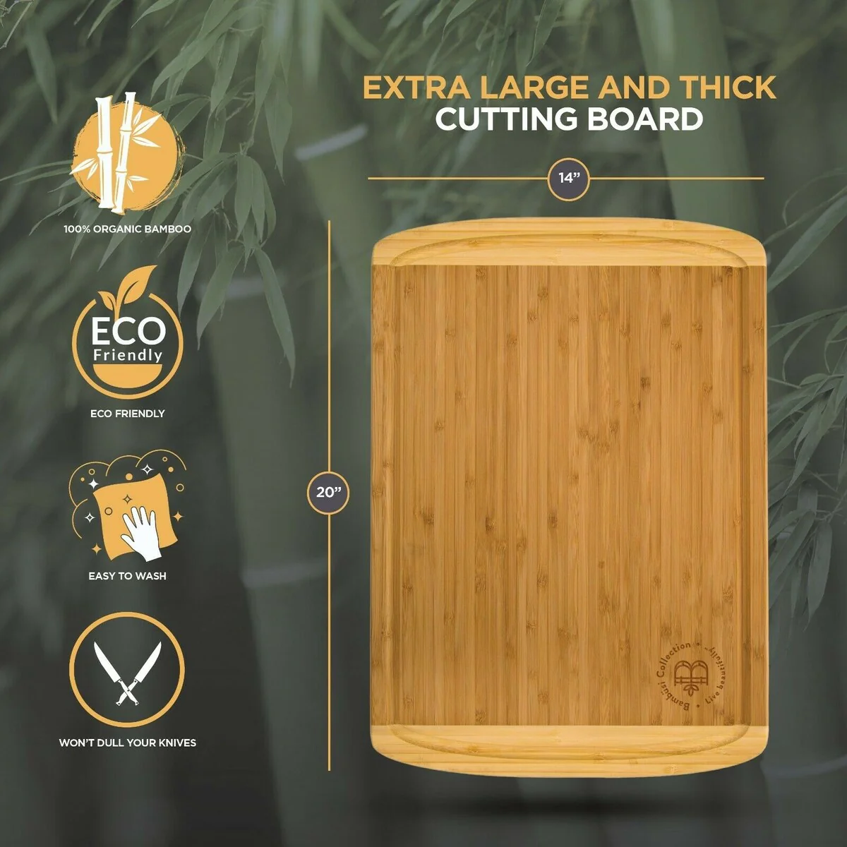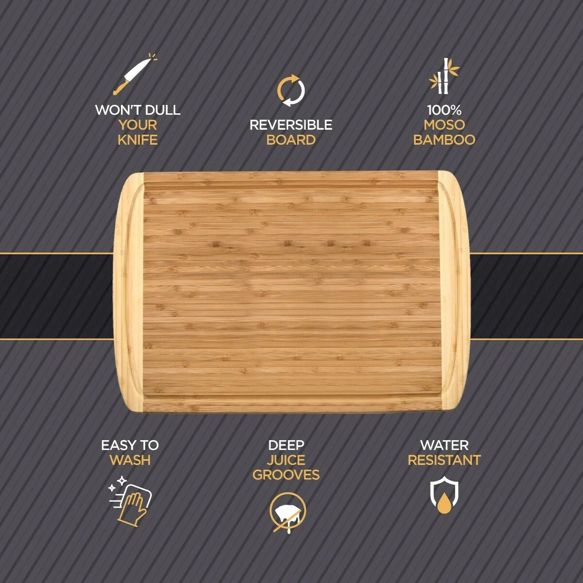 Upgrade your culinary game with this premium cutting board from Bambüsi. Crafted from environmentally-friendly Moso bamboo, this combination board with groove allows you to prep, cut, arrange, and present food on one platter. The sturdy, non-porous material repels dangerous bacteria for optimal food safety, while the oversized 2" ridge catches liquid for easy cleanup. Measuring at 12 W. x 18 L. x 3/4 H. inches, this visually striking platter is not only perfect for entertaining guests but also as a gorgeous decorative piece on your countertop. Add this attractive, durable, and natural cutting board to your collection of Bambüsi by Belmint bamboo products today.