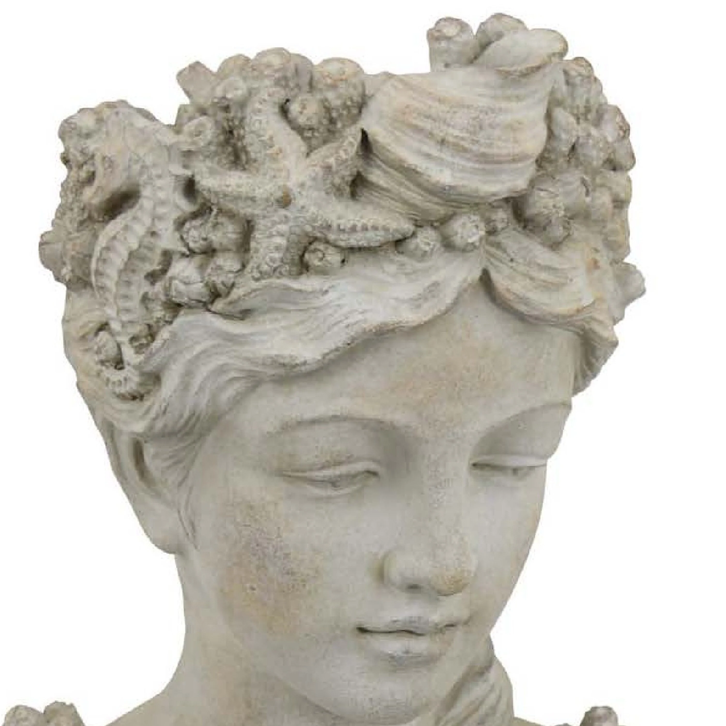 Elevate your botanical styling with this head planter, sculpted from terracotta and enriched with aquatic-inspired detail. Featuring a serene feminine face adorned with seashells, starfish, and coral textures, this piece offers a whimsical yet elegant way to display your plants. Ideal for tabletops, consoles, or garden nooks. Check out our Lewis collection for more options.