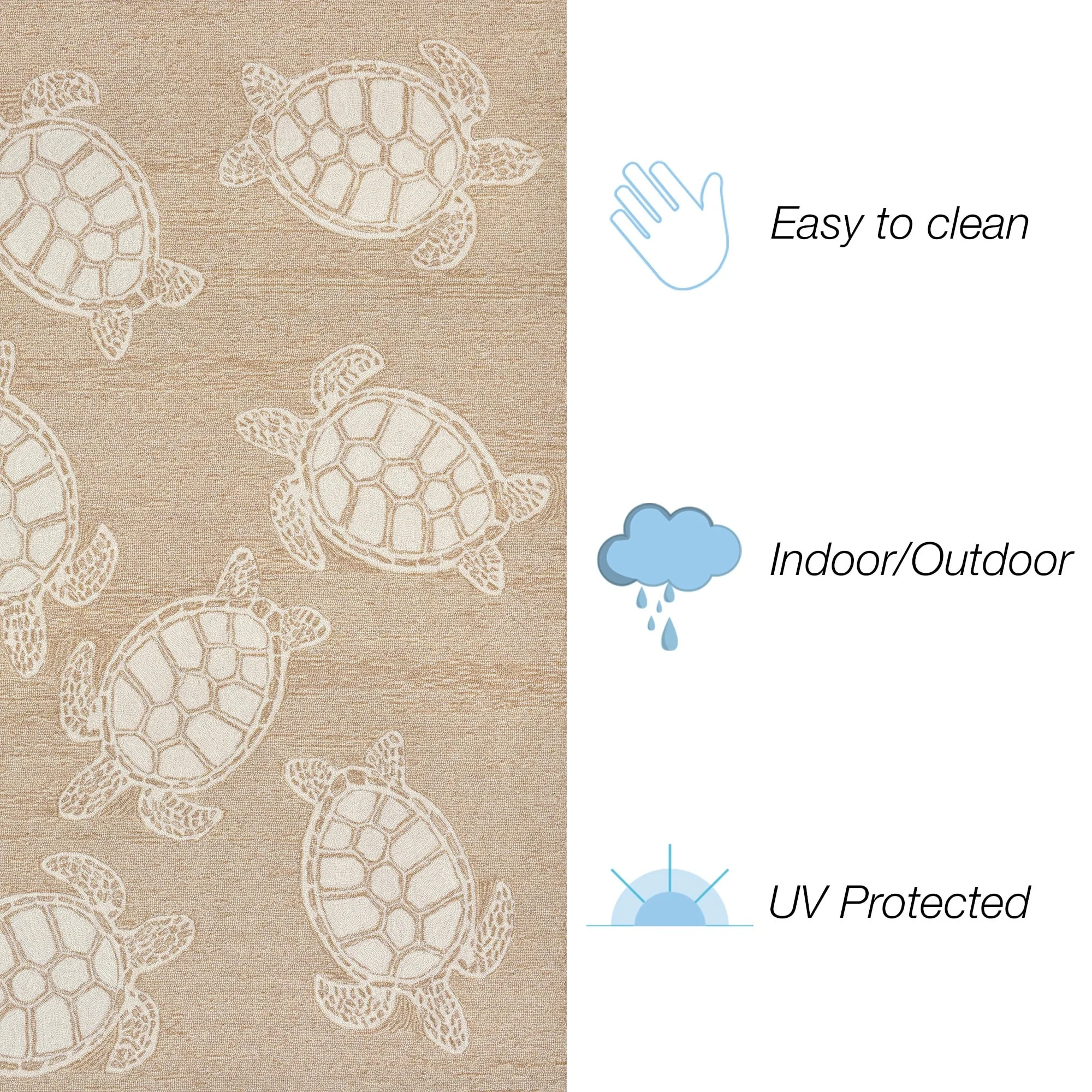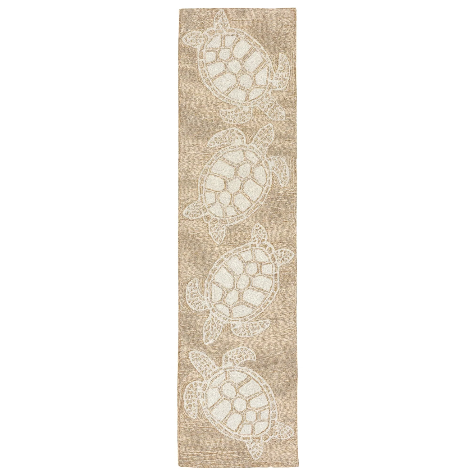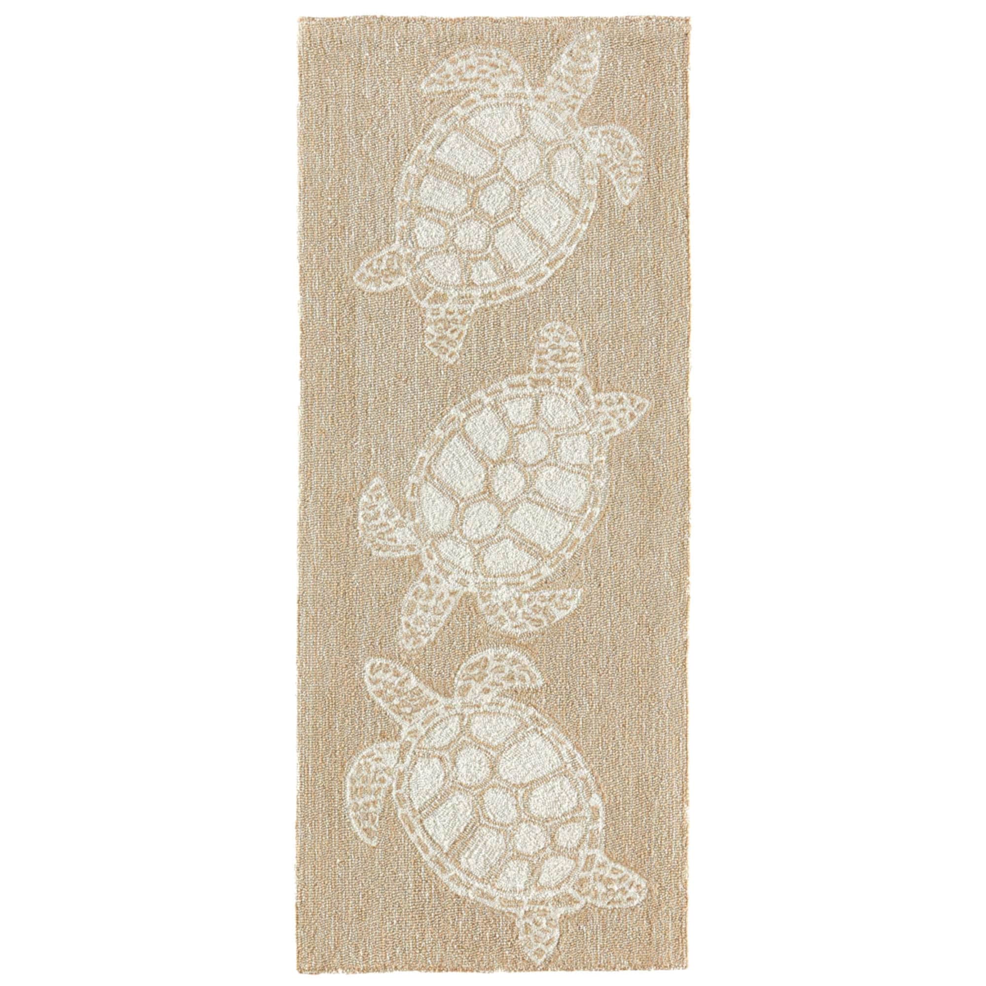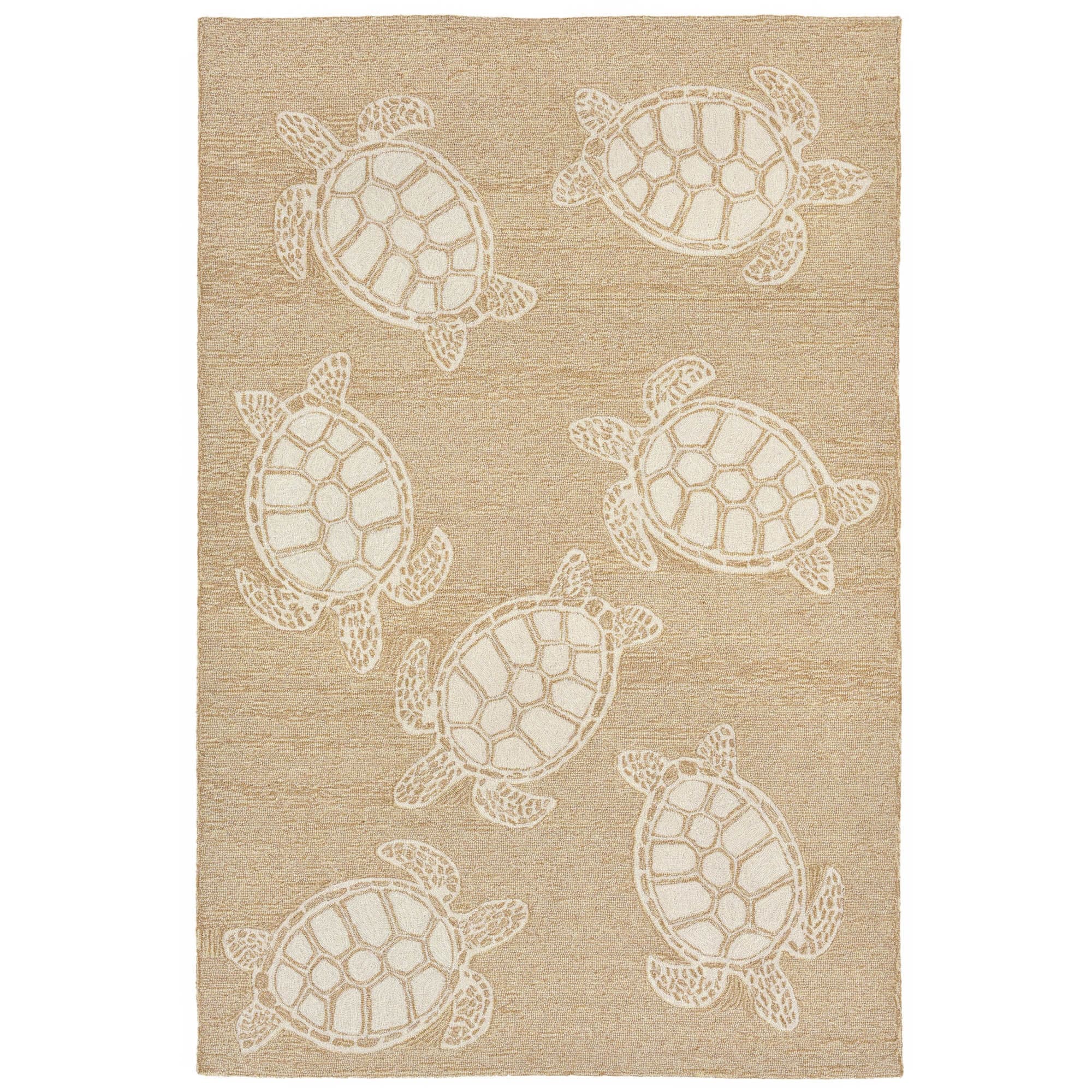 This hand-hooked area rug features a tan background accented with swimming turtles outlined in white. Tropical and fun, this design will effortlessly compliment any space inside or outside your home. Made in China from a polyester acrylic blend, the Capri Collection is hand tufted to create bright multi-toned detailed designs with a high-quality finish. The material is flatwoven, weather resistant and treated for added fade resistant making this the perfect rug for indoor or outdoor placement. This soft, durable piece is ideal for your patio, sunroom and those high traffic areas such as your entryway, kitchen, dining room and living room. A fresh take on nautical style, these area rugs range in style from coastal to tropical motifs that beautifully accent your home decor. Limiting exposure to rain, moisture and direct sun will prolong rug life.