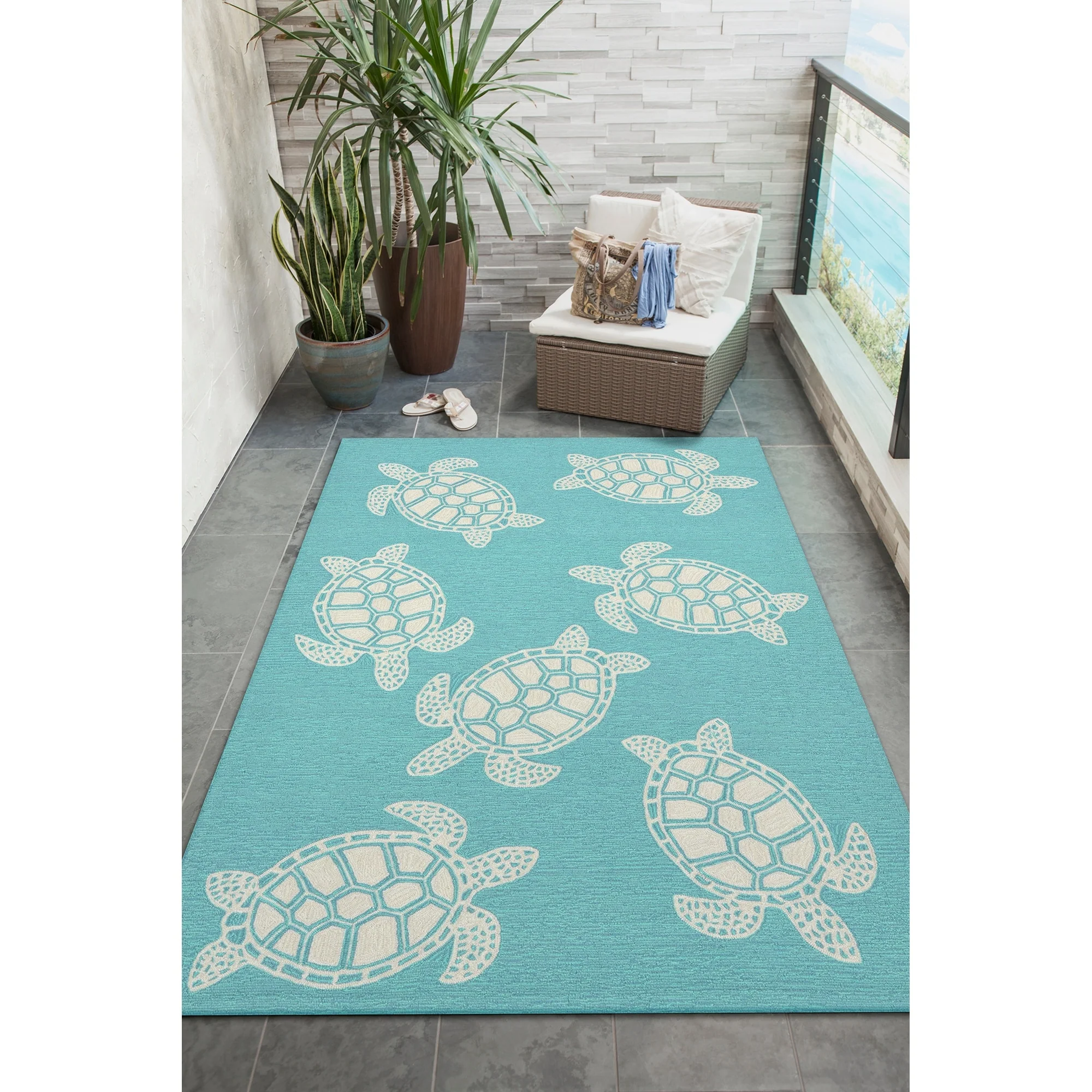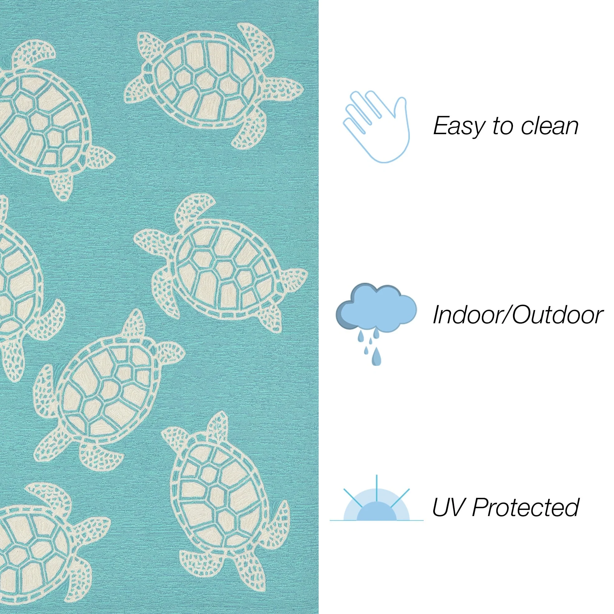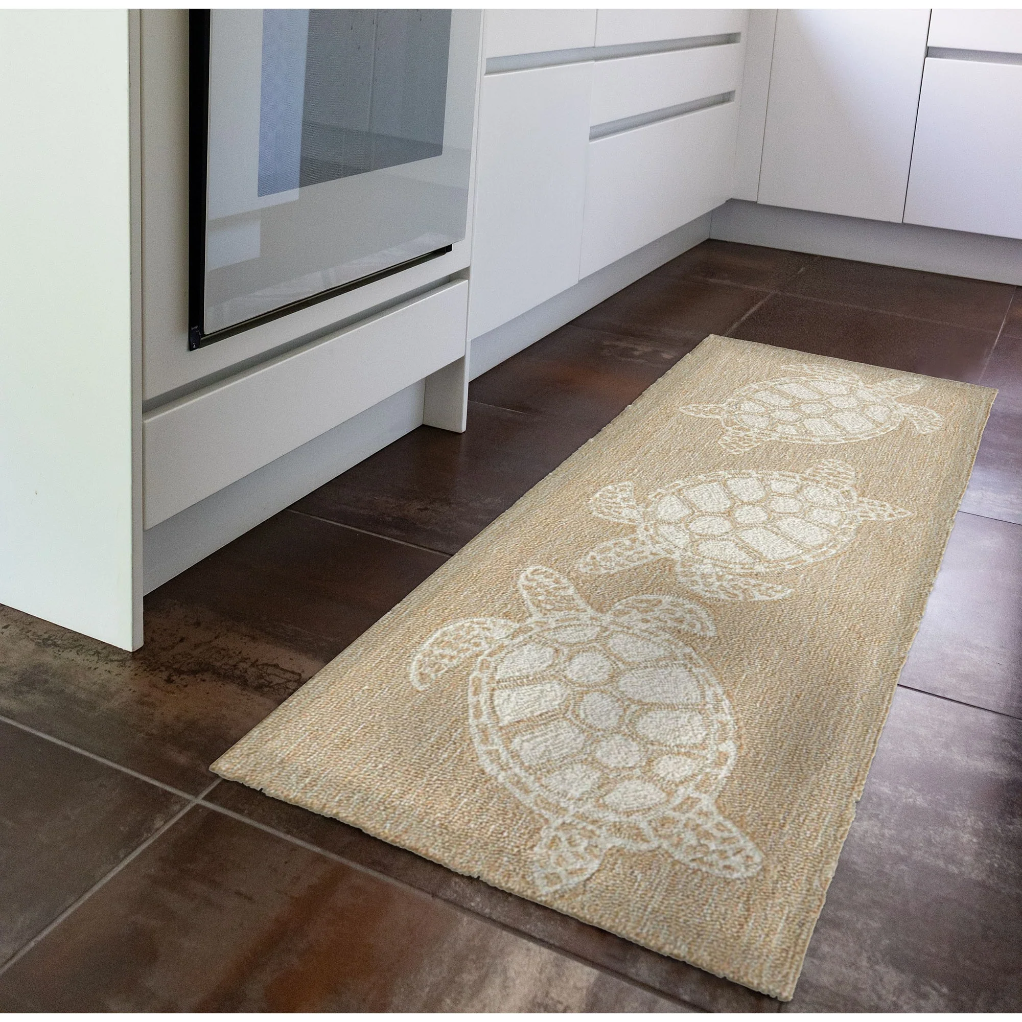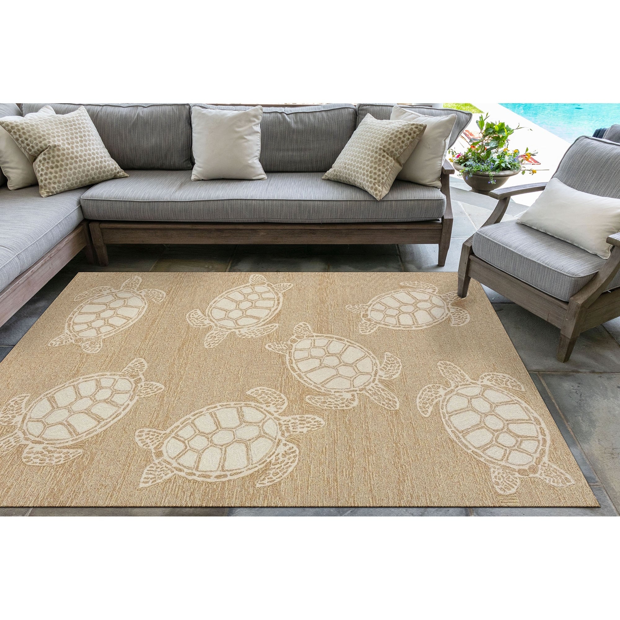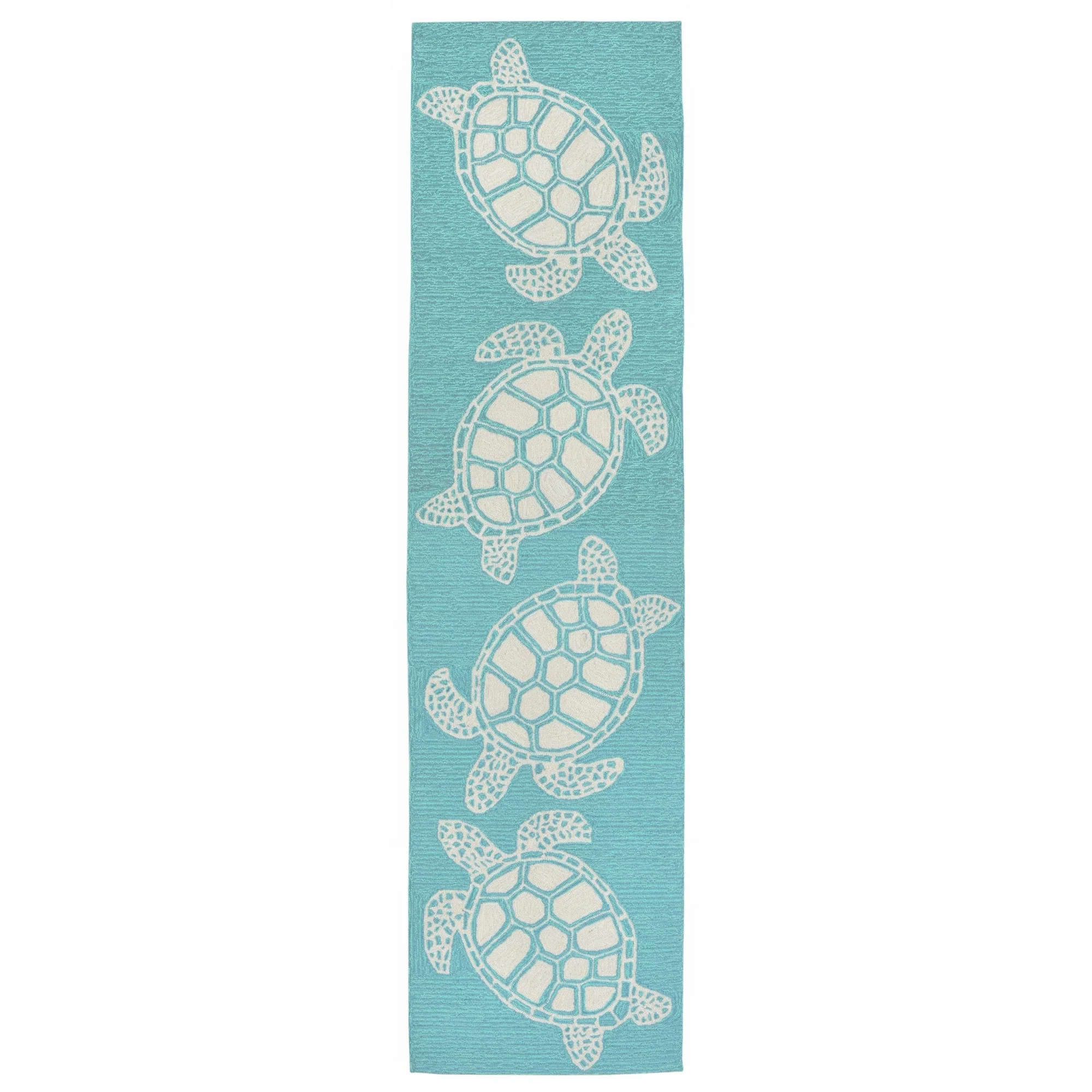 This hand-hooked area rug features a tan background accented with swimming turtles outlined in white. Tropical and fun, this design will effortlessly compliment any space inside or outside your home. Made in China from a polyester acrylic blend, the Capri Collection is hand tufted to create bright multi-toned detailed designs with a high-quality finish. The material is flatwoven, weather resistant and treated for added fade resistant making this the perfect rug for indoor or outdoor placement. This soft, durable piece is ideal for your patio, sunroom and those high traffic areas such as your entryway, kitchen, dining room and living room. A fresh take on nautical style, these area rugs range in style from coastal to tropical motifs that beautifully accent your home decor. Limiting exposure to rain, moisture and direct sun will prolong rug life.
