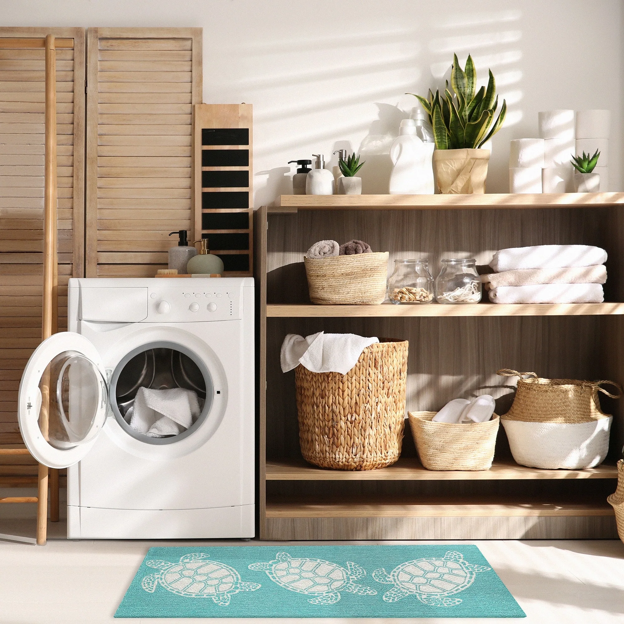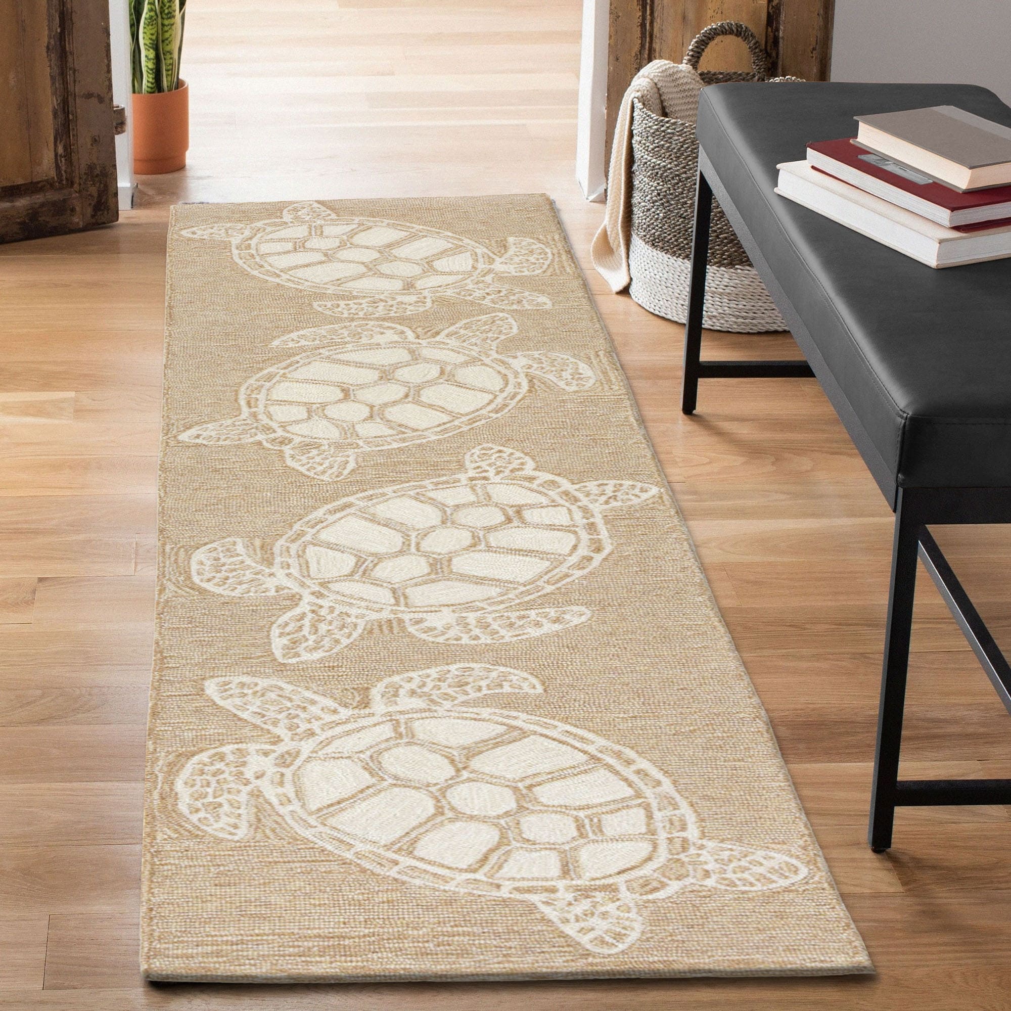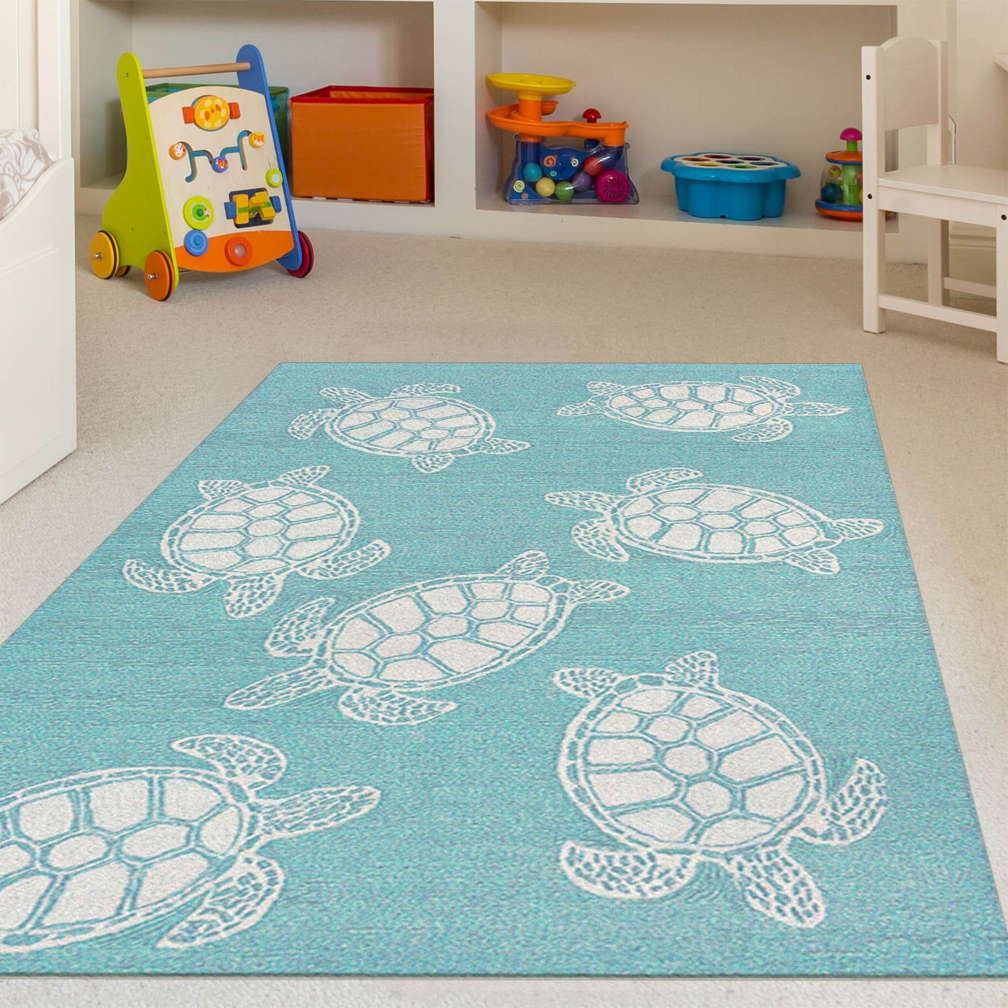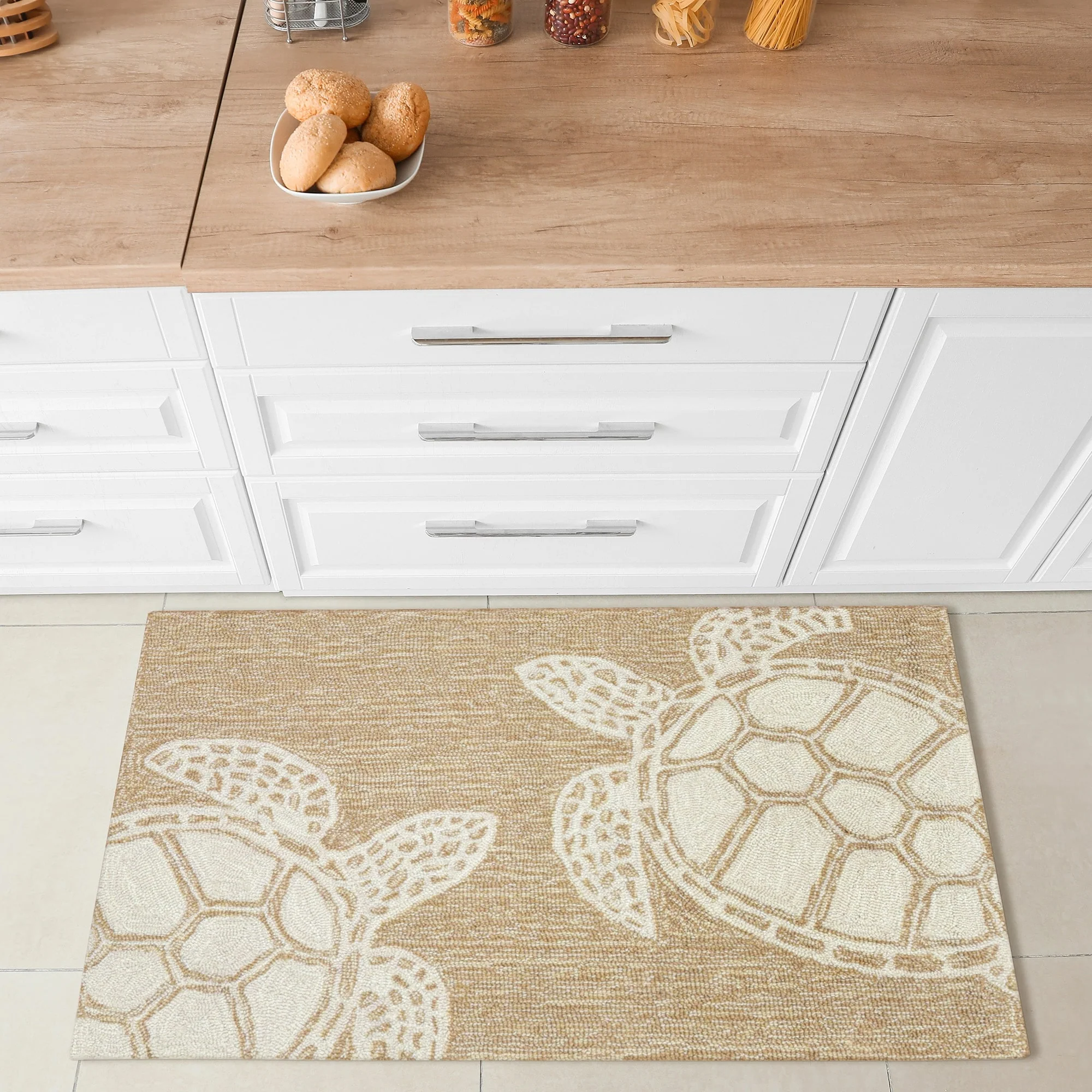 This hand-hooked area rug features a tan background accented with swimming turtles outlined in white. Tropical and fun, this design will effortlessly compliment any space inside or outside your home. Made in China from a polyester acrylic blend, the Capri Collection is hand tufted to create bright multi-toned detailed designs with a high-quality finish. The material is flatwoven, weather resistant and treated for added fade resistant making this the perfect rug for indoor or outdoor placement. This soft, durable piece is ideal for your patio, sunroom and those high traffic areas such as your entryway, kitchen, dining room and living room. A fresh take on nautical style, these area rugs range in style from coastal to tropical motifs that beautifully accent your home decor. Limiting exposure to rain, moisture and direct sun will prolong rug life.