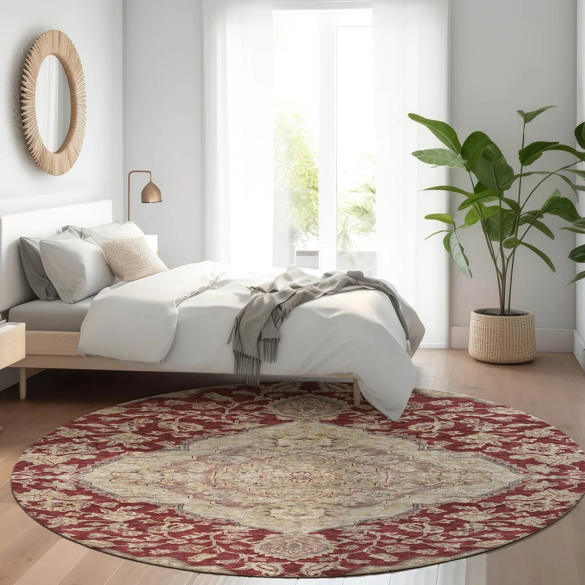 Add sophistication to your home with our area rug, featuring a beautifully detailed large diamond center medallion that seamlessly integrates traditional and global design elements. UV stabilized for lasting color, it's perfect for indoor or outdoor use. The ultra-thin construction ensures easy placement, and its machine-washable nature makes it a practical choice for families and pet owners. All rugs exposed to long periods of intense and direct sunlight can experience loss of color over time. Our rugs perform best in covered outdoor areas and uncovered areas with lower hours of direct sunlight. The ultra thin profile allows for fast drying after rainfall or outdoor cleaning. Larger rug sizes may not fit into a residential washing machine. They may be washed in a commercial size washing machine or hosed-off outside with mild soap and water. Air-dry, do not machine dry. While each rug already has a non-skid backing, the necessity for additional cushion or room settings with high traction areas, may require an additional rug pad.