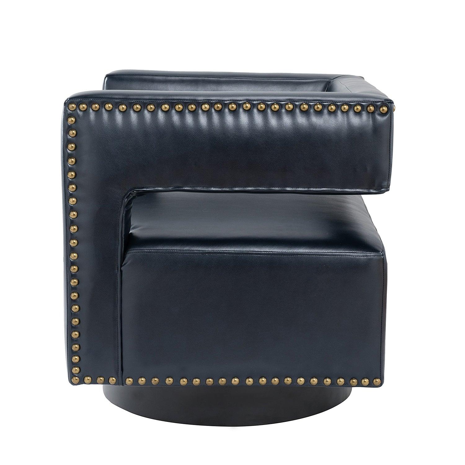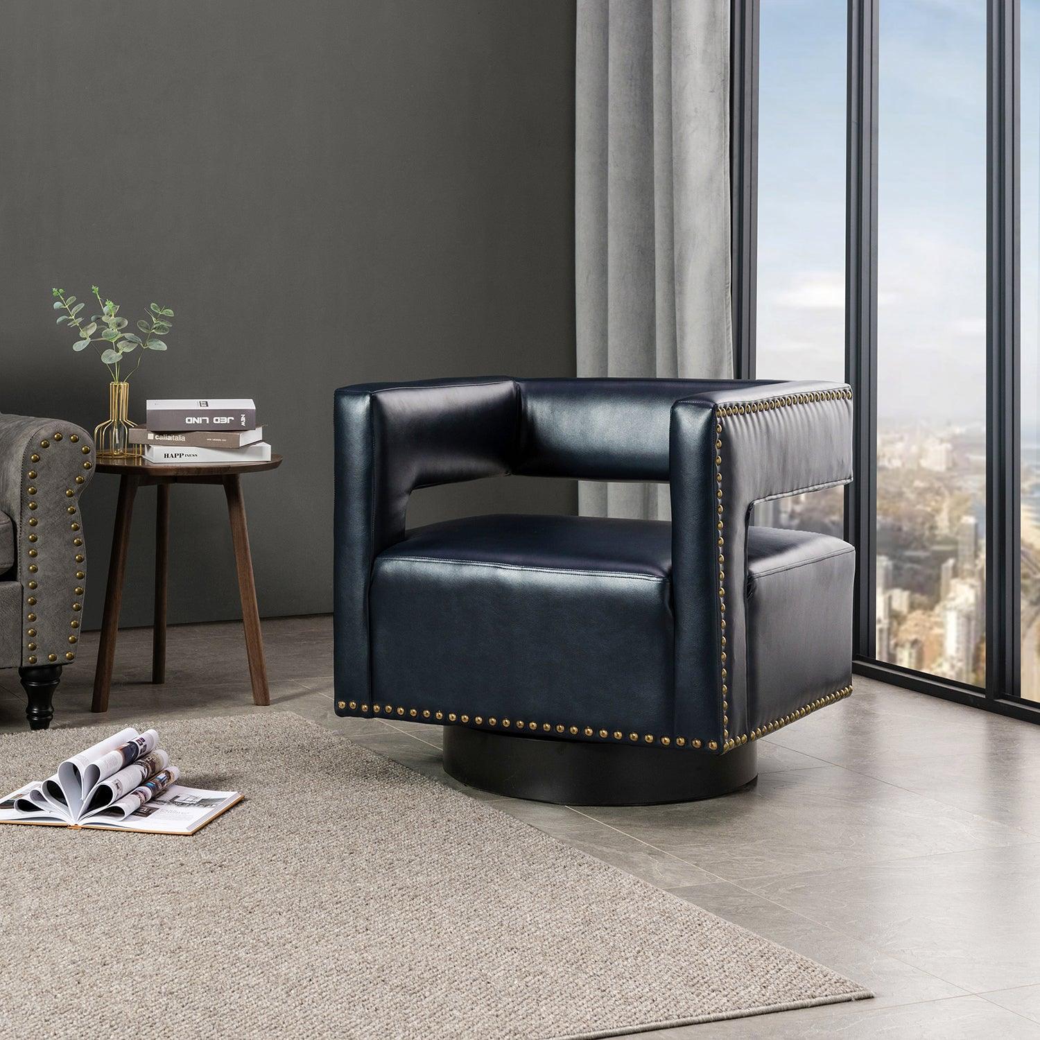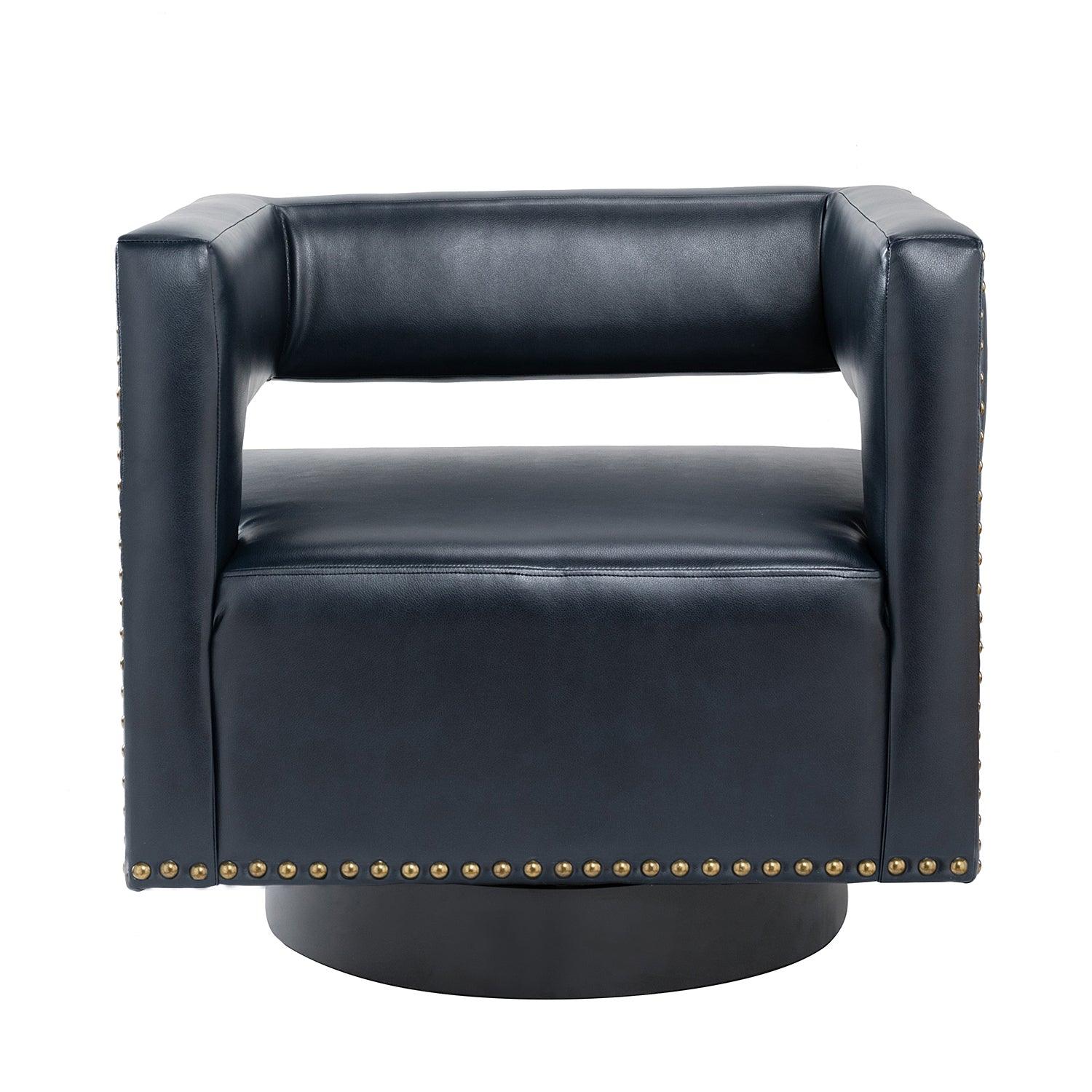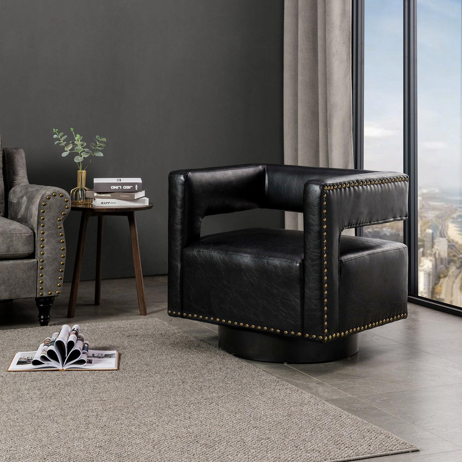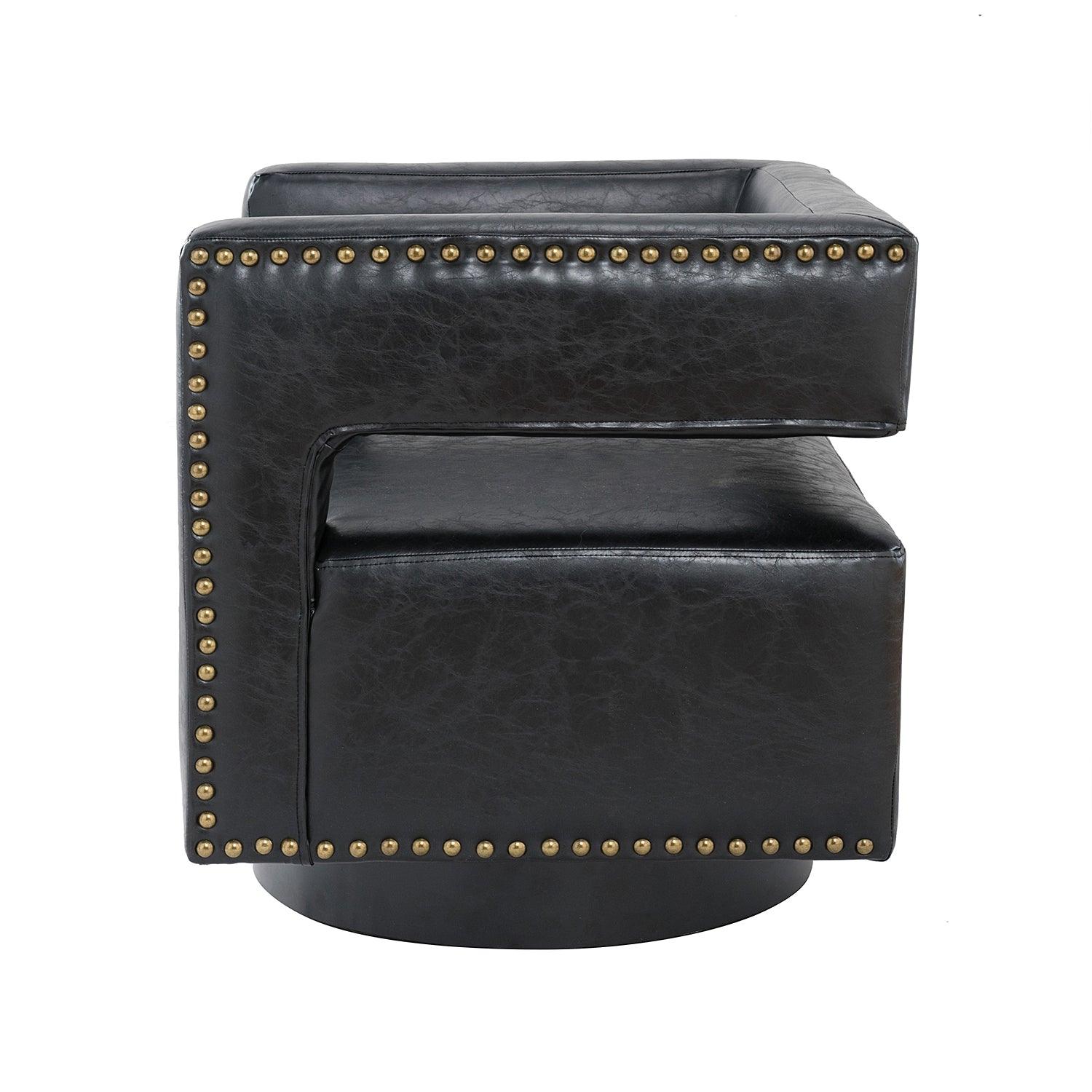 Whether you need a spot to curl up with a good book or somewhere to lay out clothes for the next day, this attractive barrel chair is a versatile addition to your space. A curvaceous cut-out back wraps around the sides to act as square arms. Made from a blend of polyurethane and polyvinyl chloride with nailhead trim, comfortable for skin touch, and features an on-trend solid hue that's bound to blend in with your color scheme. High-quality foam filling with a manufactured wood frame provides comfort and support. The black metal base adds to the timeless fashion of this piece. Even better, it's a swivel base so you can turn to others or in the direction of your TV with ease. It's the perfect pick for the living room, office room, and bedroom.