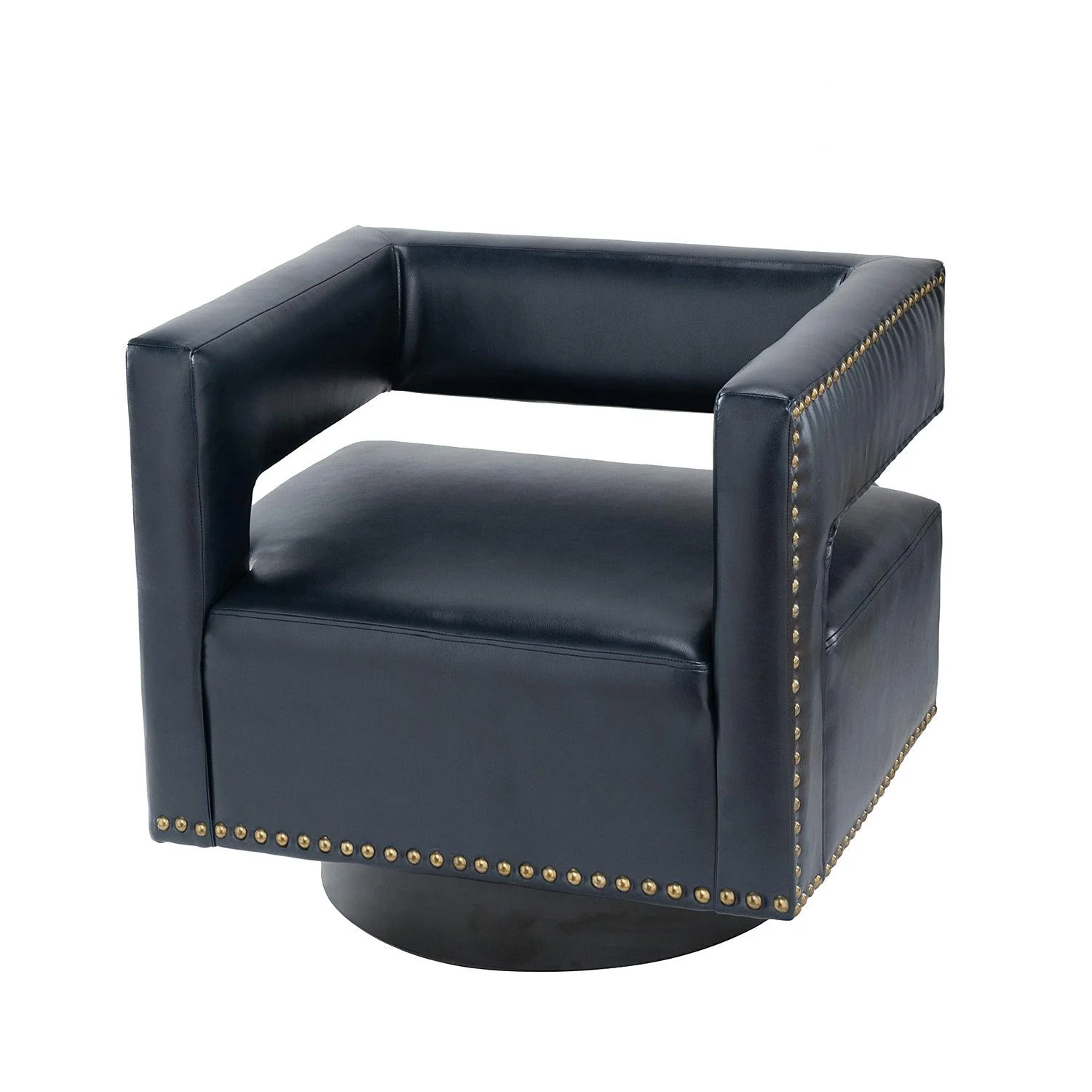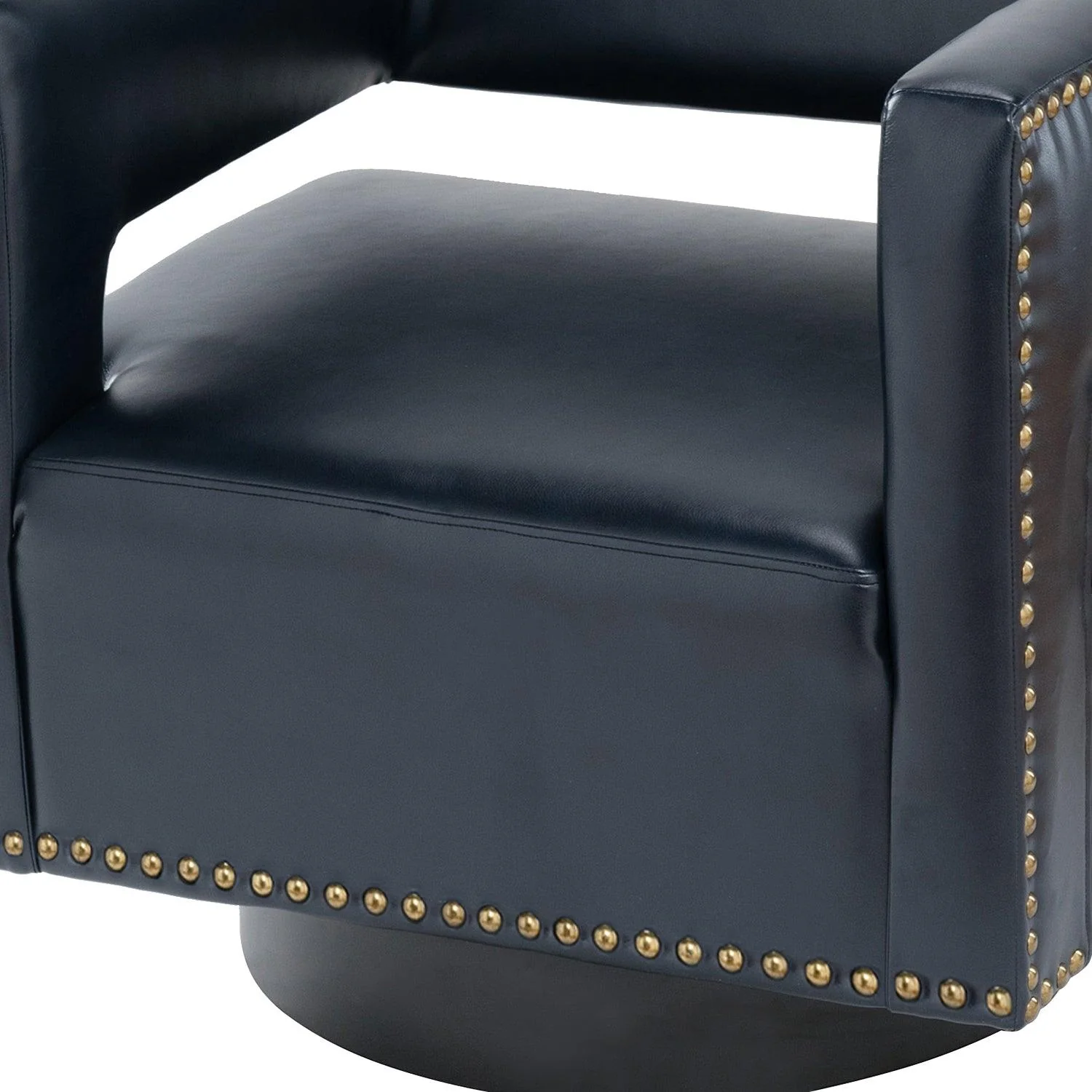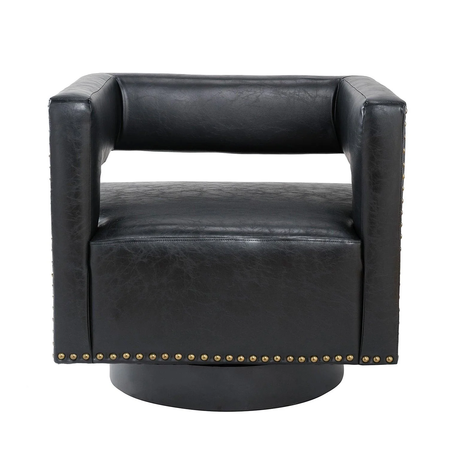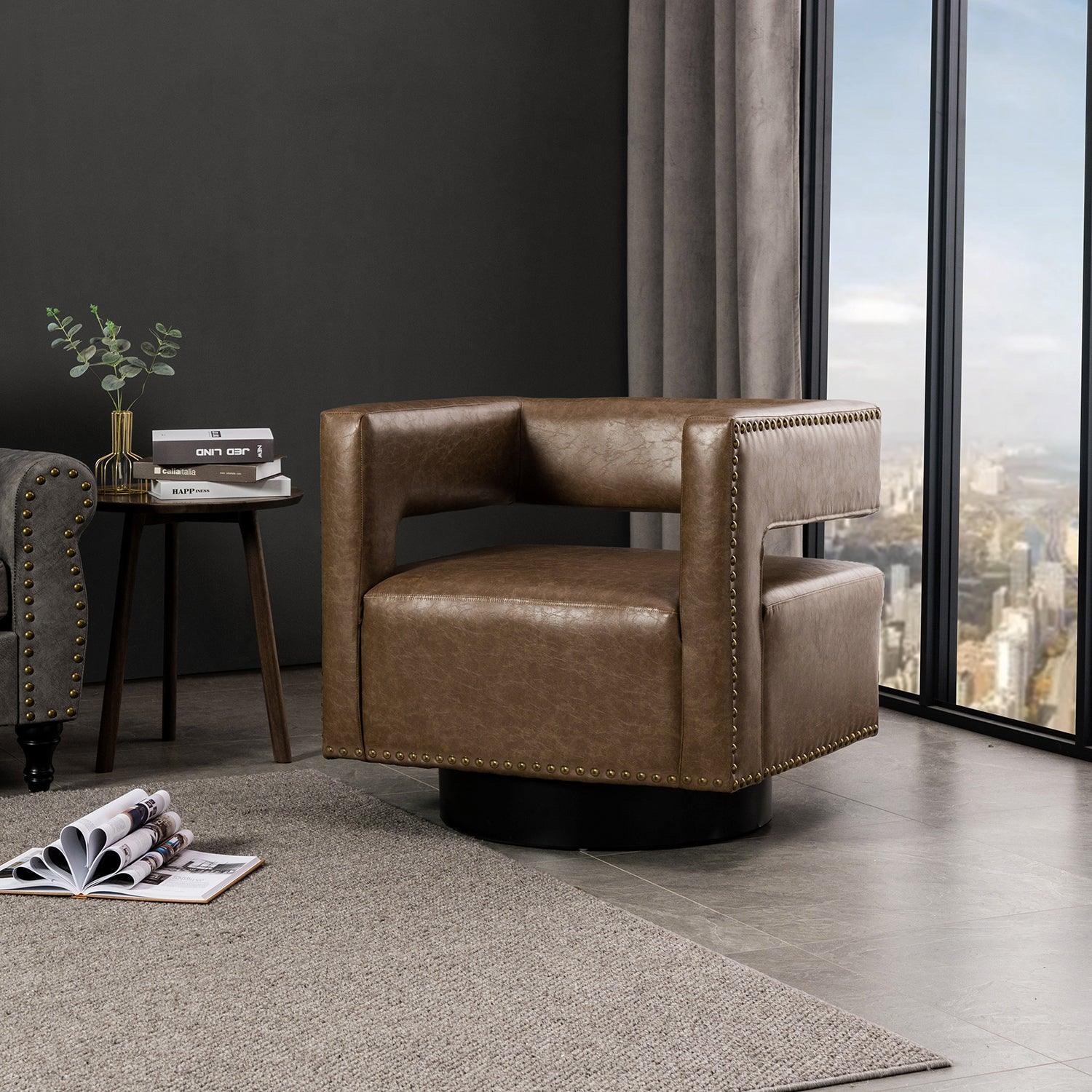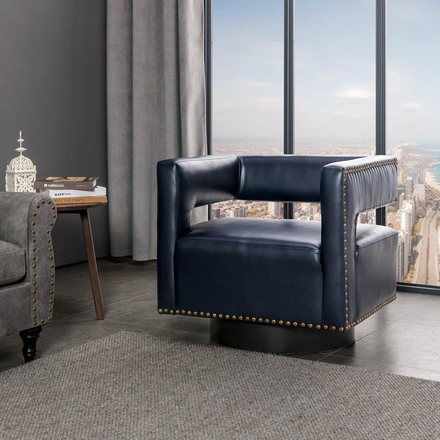 Whether you need a spot to curl up with a good book or somewhere to lay out clothes for the next day, this attractive barrel chair is a versatile addition to your space. A curvaceous cut-out back wraps around the sides to act as square arms. Made from a blend of polyurethane and polyvinyl chloride with nailhead trim, comfortable for skin touch, and features an on-trend solid hue that's bound to blend in with your color scheme. High-quality foam filling with a manufactured wood frame provides comfort and support. The black metal base adds to the timeless fashion of this piece. Even better, it's a swivel base so you can turn to others or in the direction of your TV with ease. It's the perfect pick for the living room, office room, and bedroom.