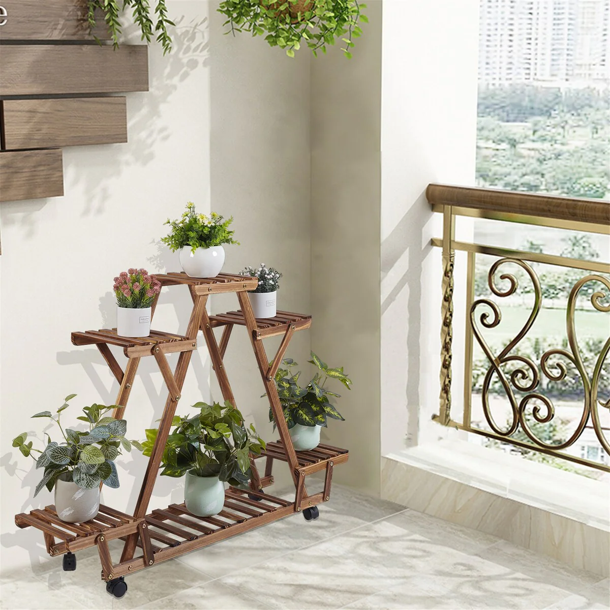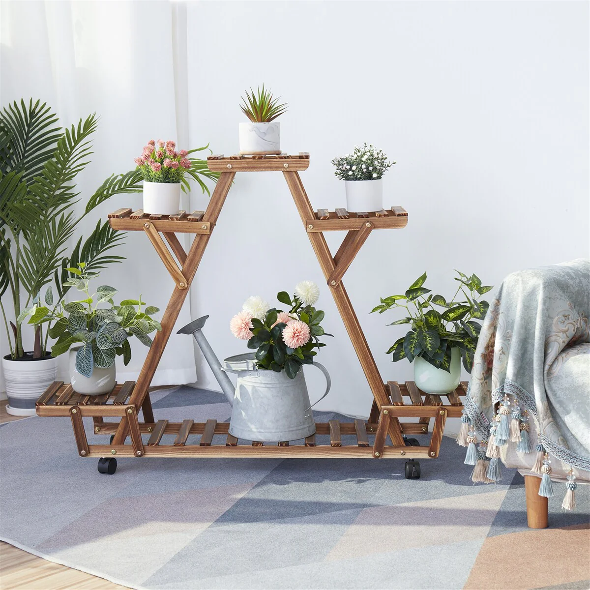 【Sturdy and Durable】----This wooden plant stand is made of solid carbonized pine wood, which has high hardness, durability, stability, anti-deform and weather resistant. Its triangular shape increased its weight capacity, can display many flower pots, plants, succulent, etc