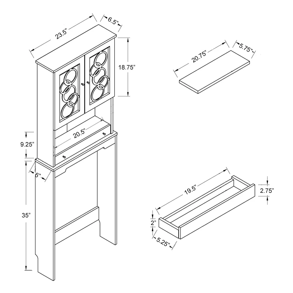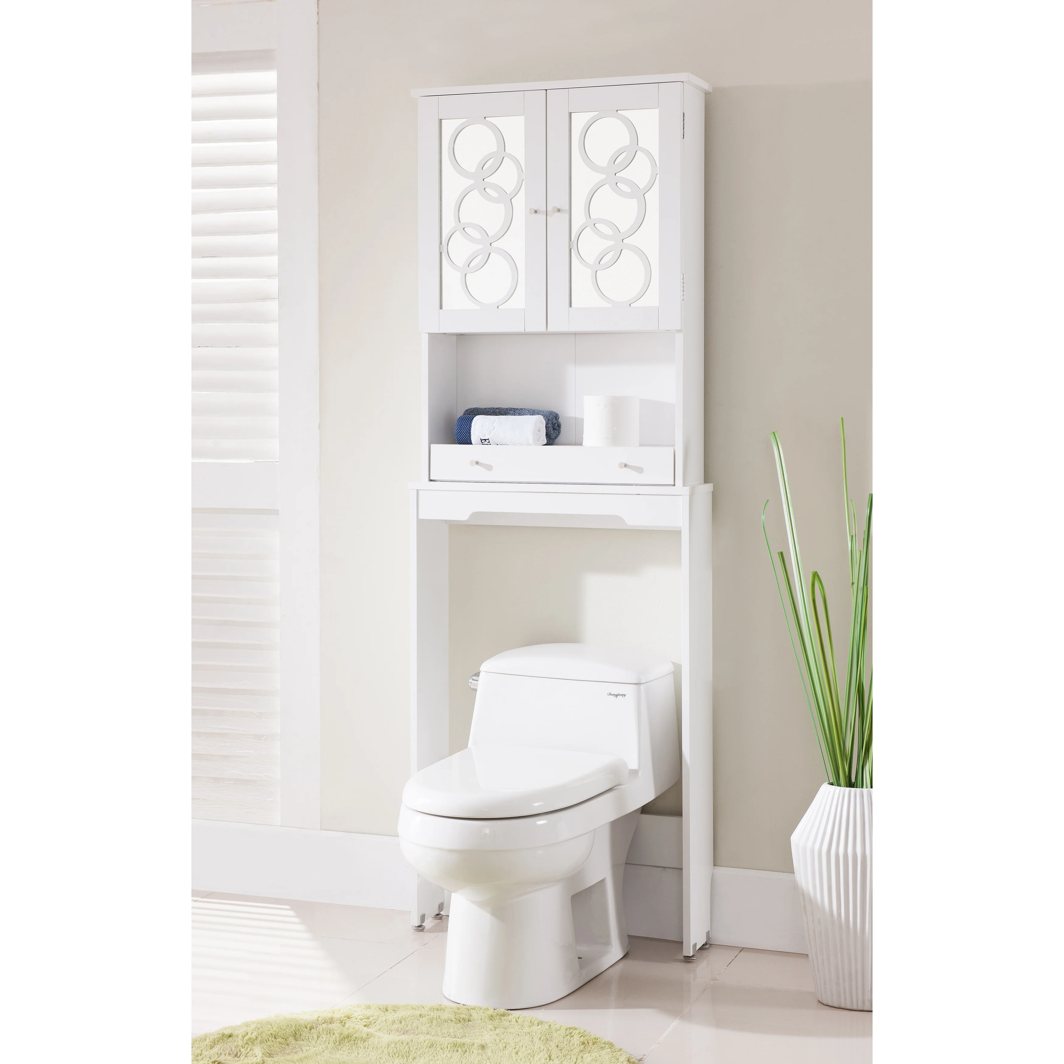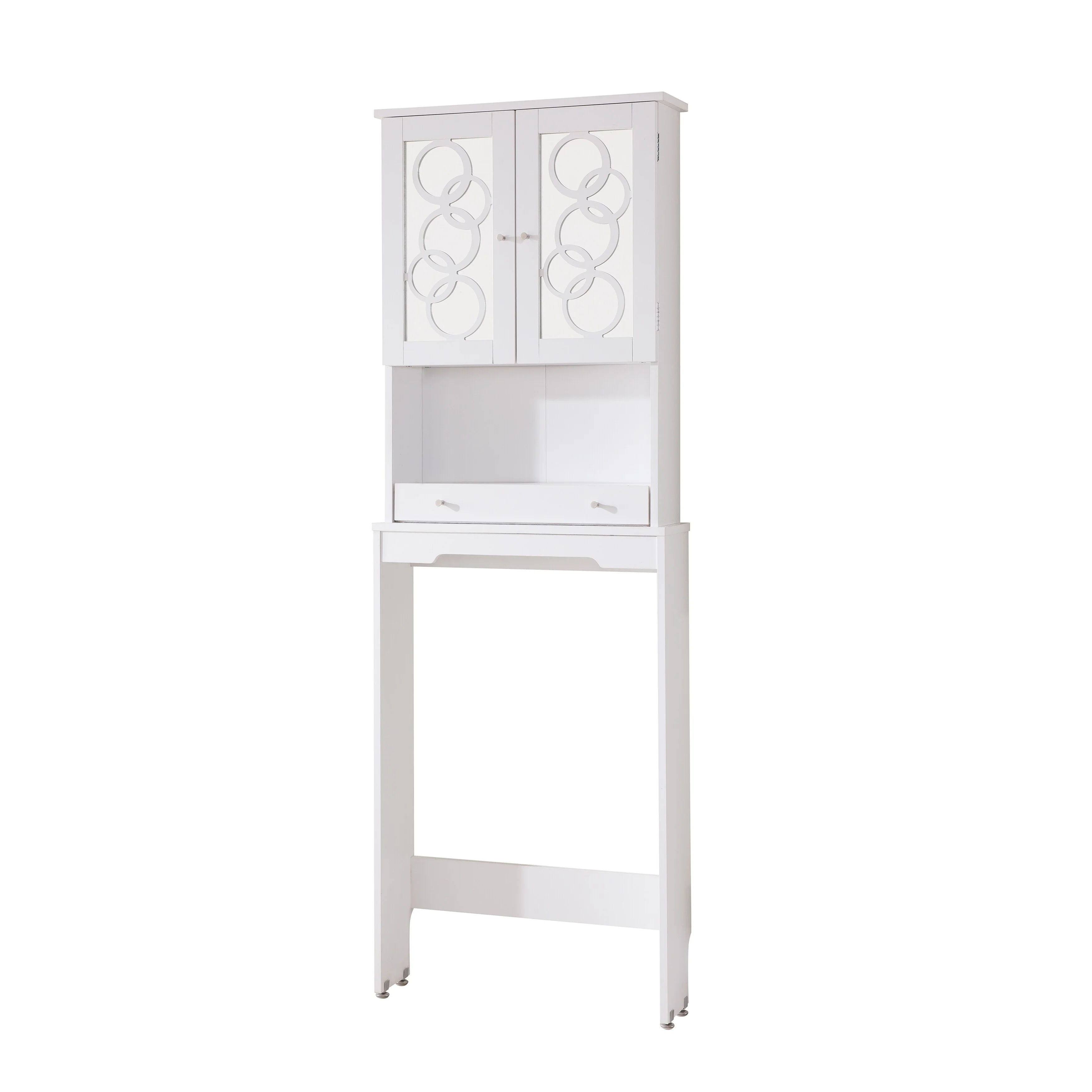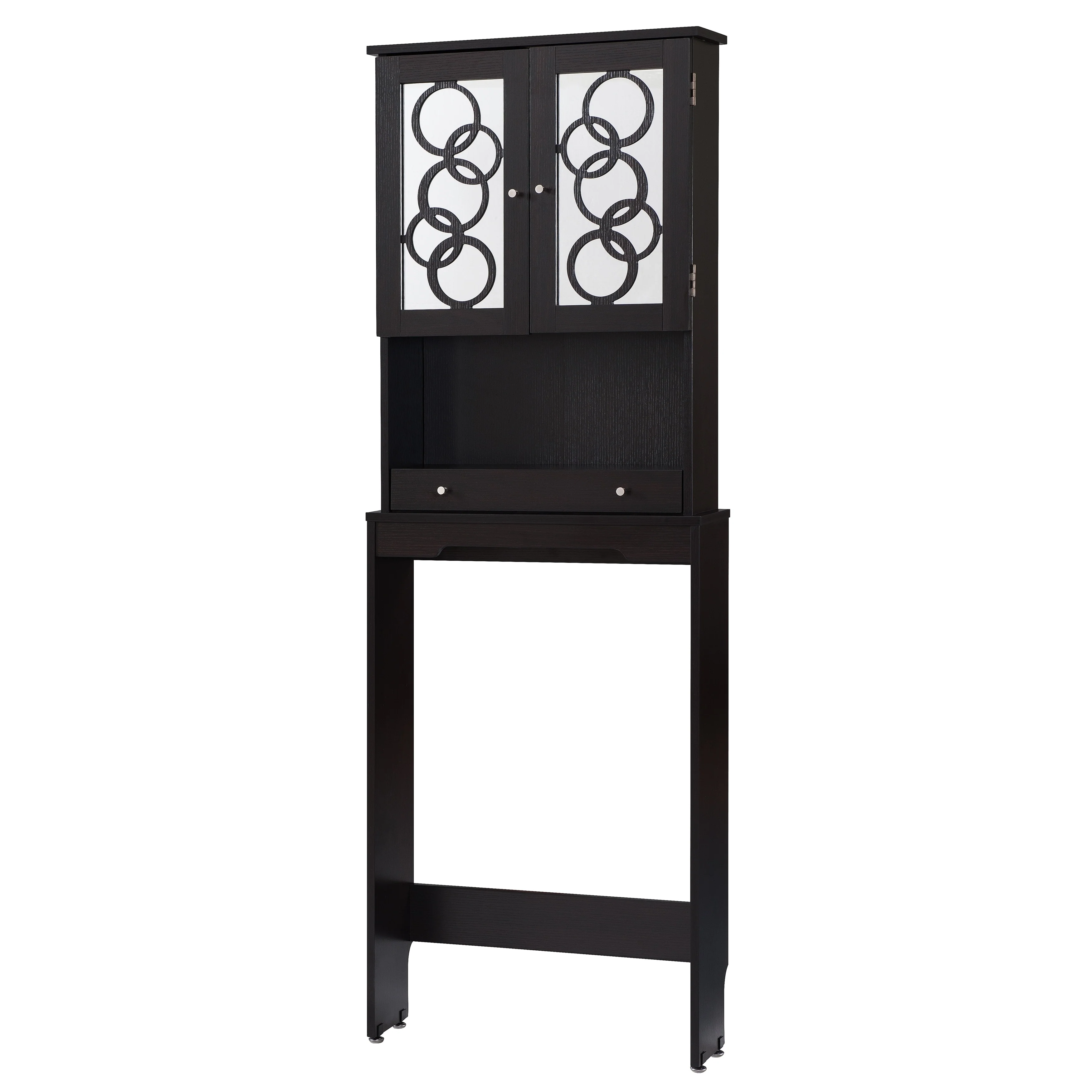 - Interlocking wood ring cutouts grace the two-door mirrored cabinet