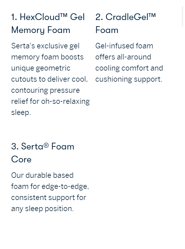 • Exclusive HexCloud™ Gel Memory Foam boasts unique geometric cut-outs that deliver contouring pressure relief