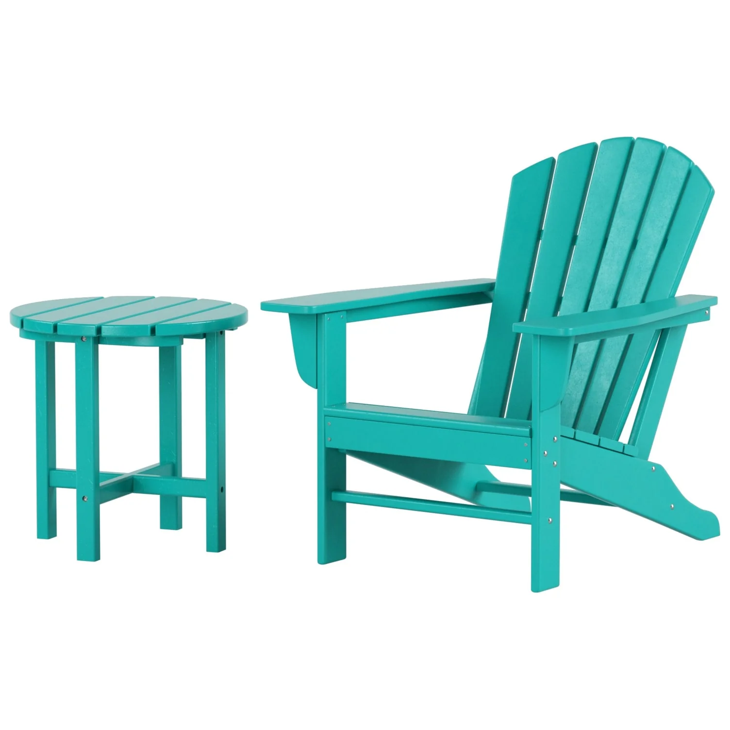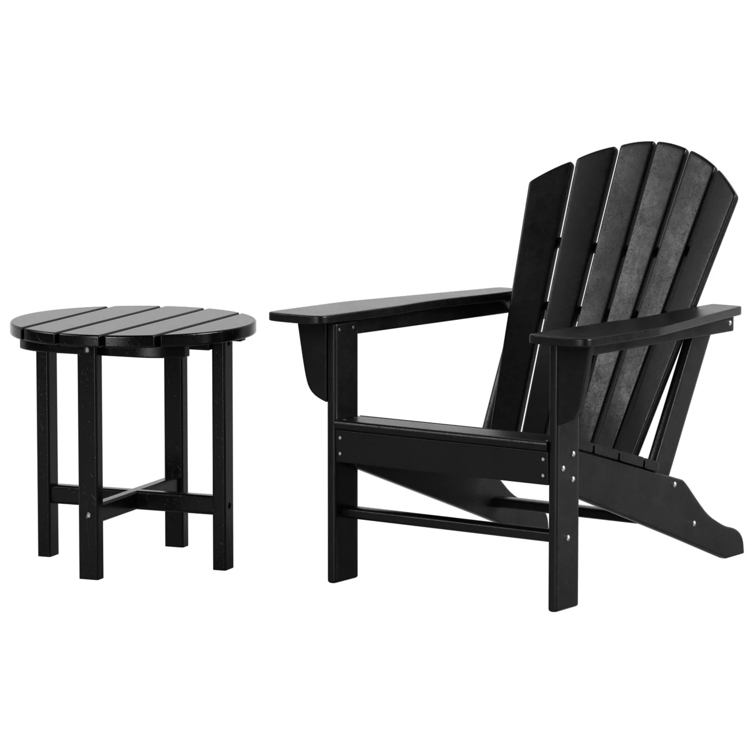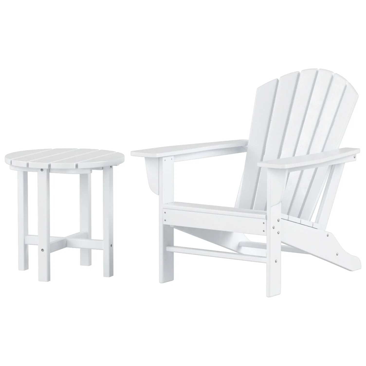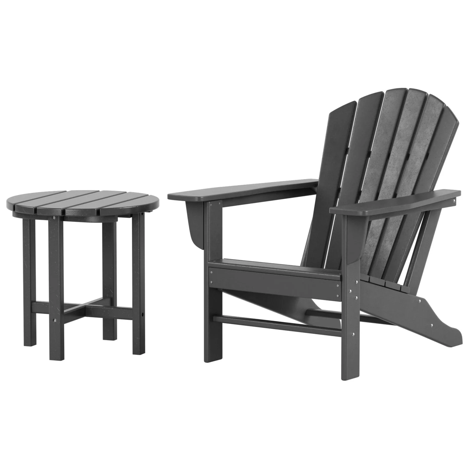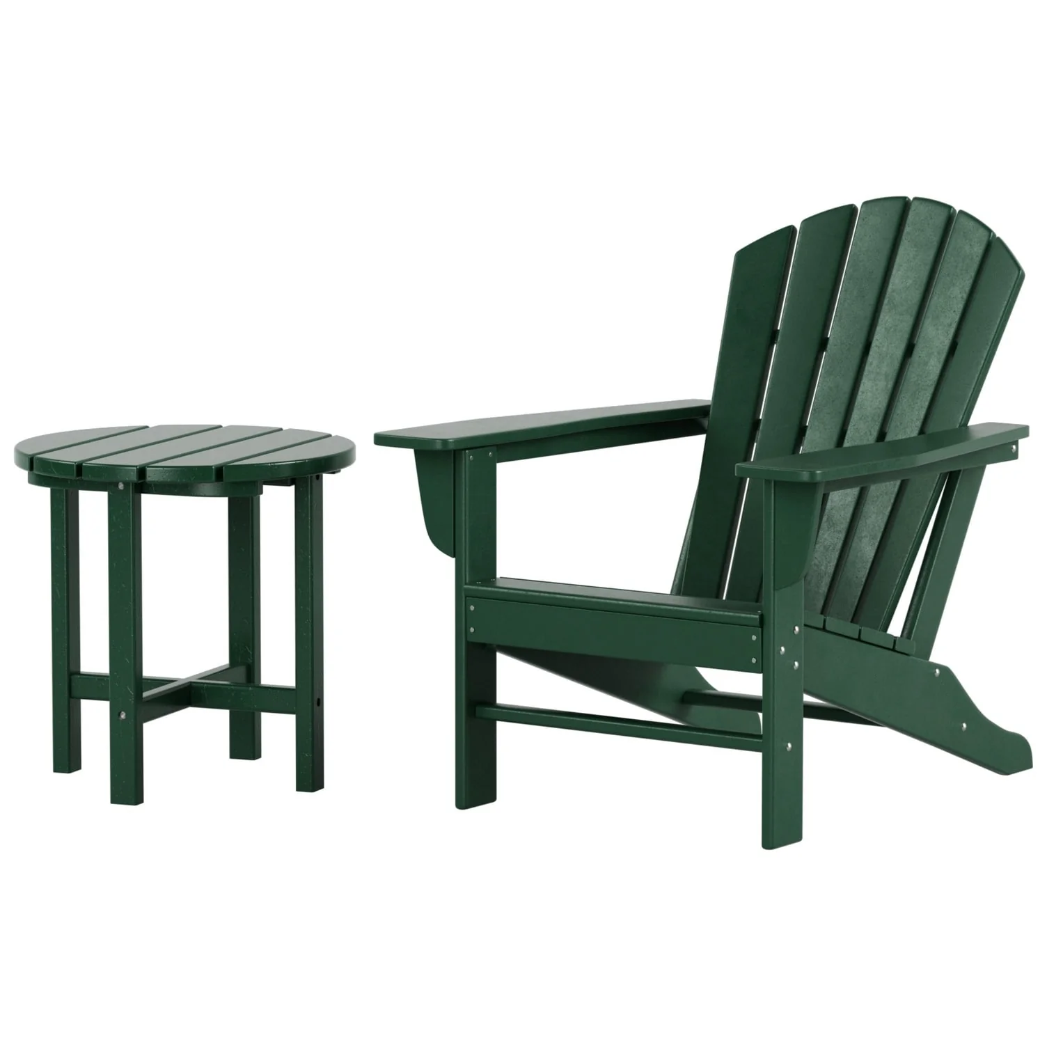 Relax with this beautiful two piece Adirondack set. Includes one chair and side table - this set is sure to impress with an ergonomical design with comfortable wide arms and contoured seat and back with a reclined silhouette. Makes the perfect addition to any backyard or outdoor space.