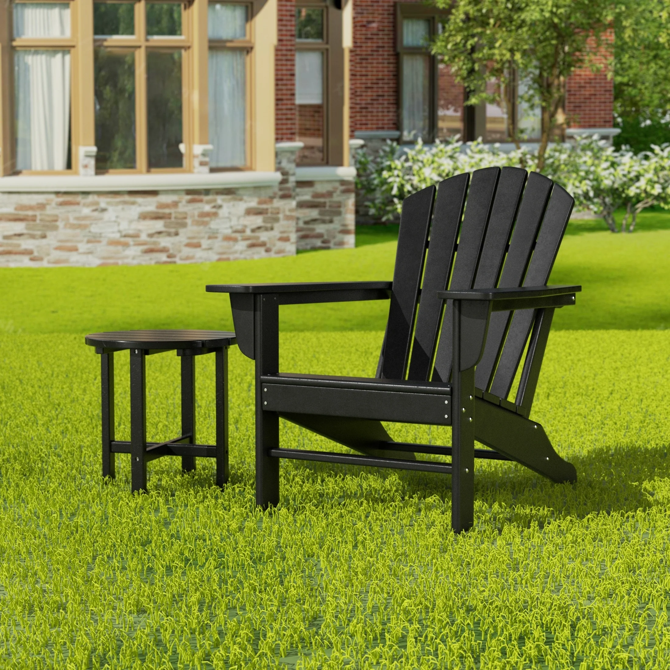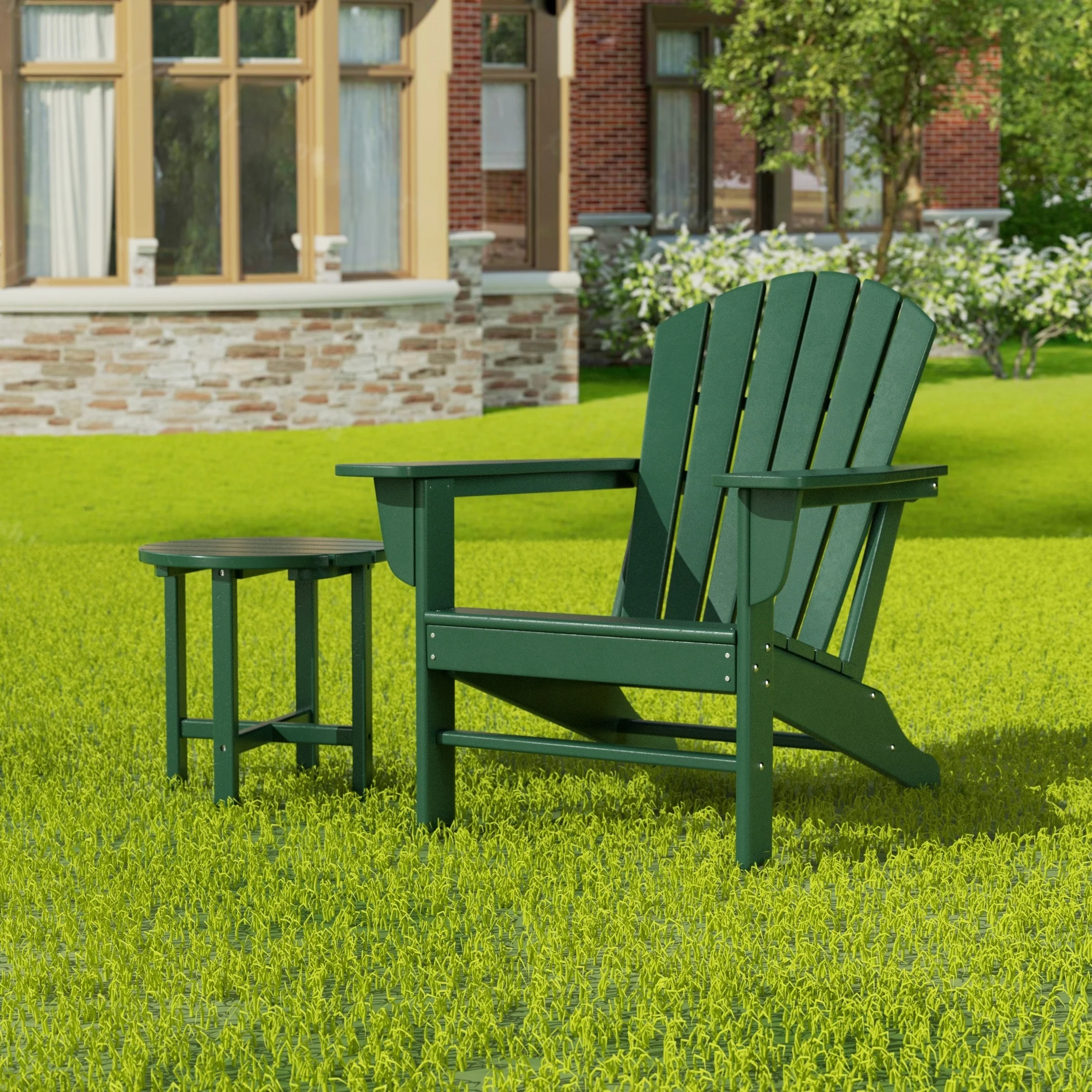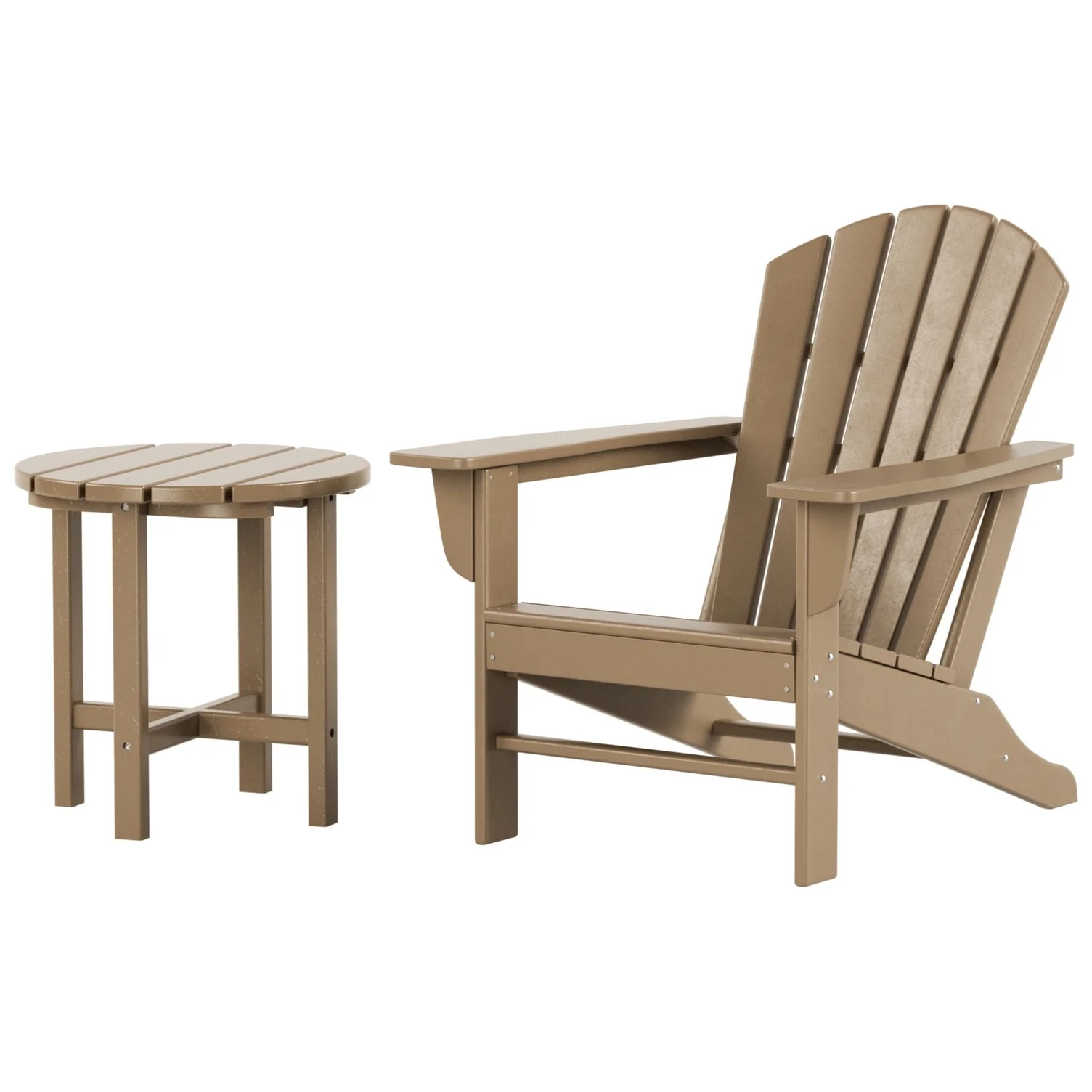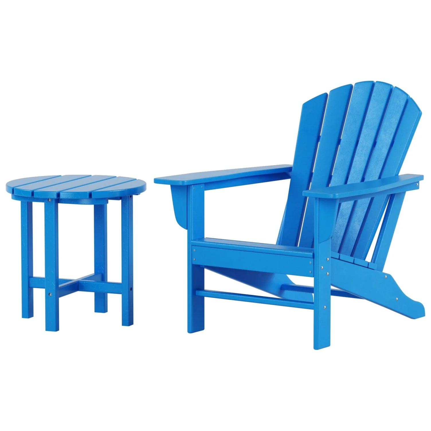 Relax with this beautiful two piece Adirondack set. Includes one chair and side table - this set is sure to impress with an ergonomical design with comfortable wide arms and contoured seat and back with a reclined silhouette. Makes the perfect addition to any backyard or outdoor space.