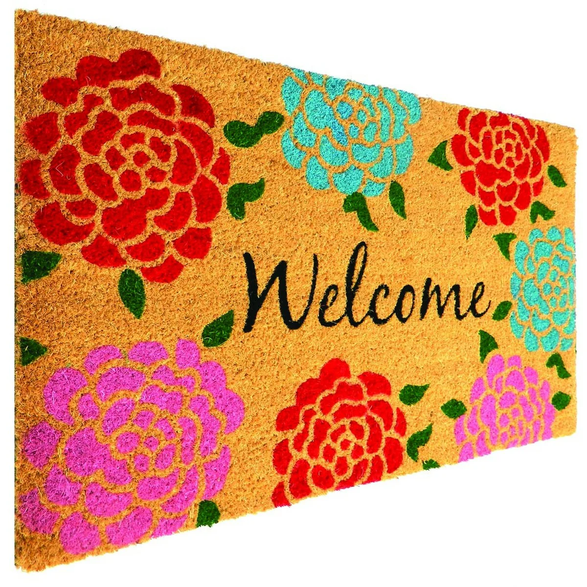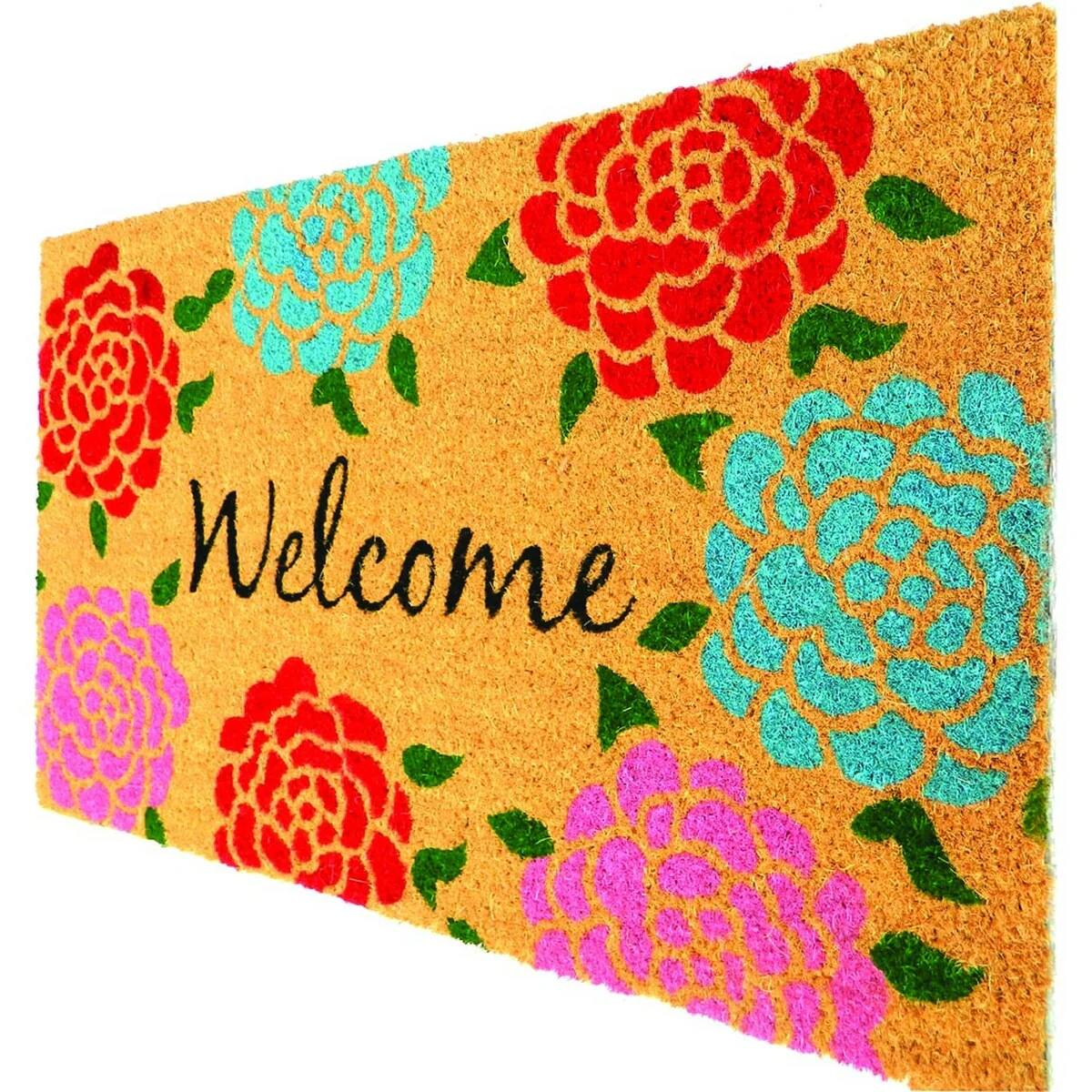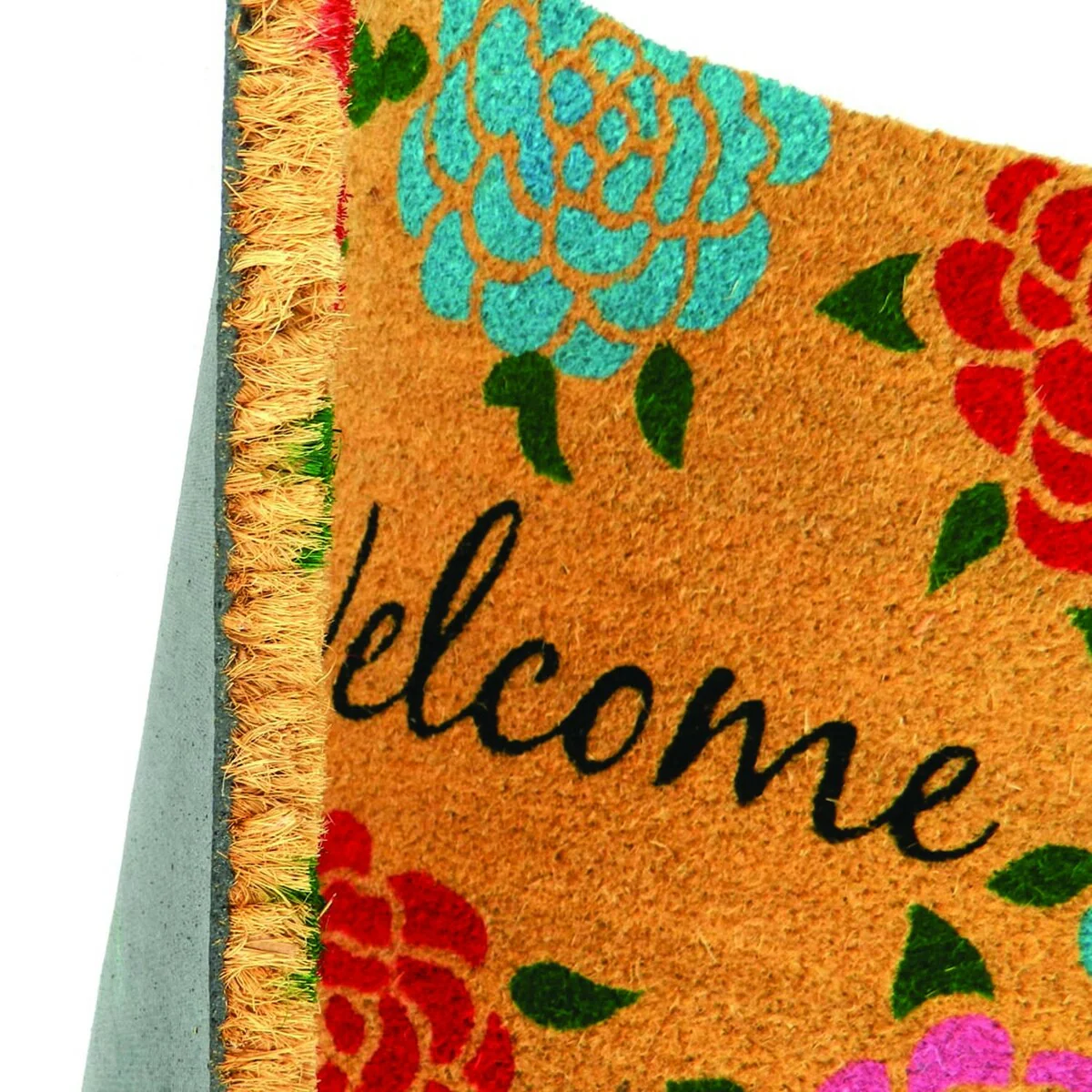 Let your guests know you are happy to see them with this welcoming door mat. Made of natural coir, a durable, fiber that scrapes shoes clean, this mat is vinyl backed for increased durability and to help prevent movement. Designed for both indoor and outdoor use. Perfect for all entryways. Environmentally friendly Recommended for indoor or outdoor use. Please Note: Due to differences in monitors, some rug colors may vary slightly.
