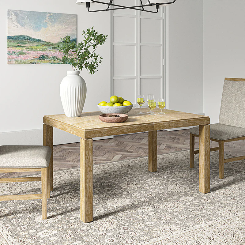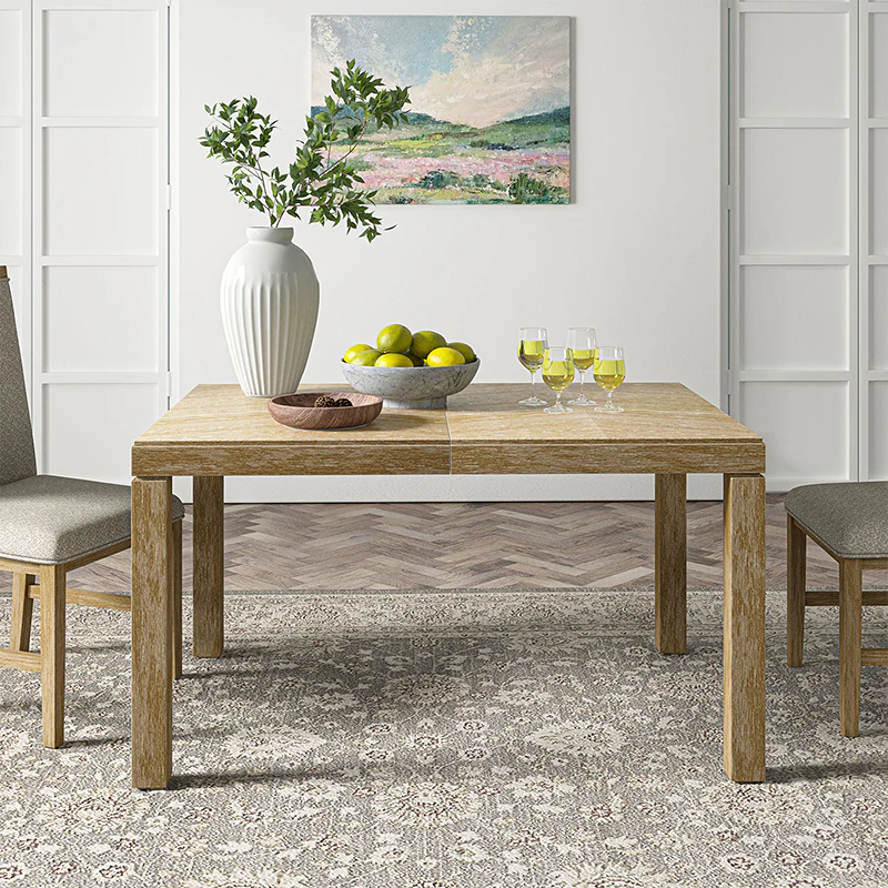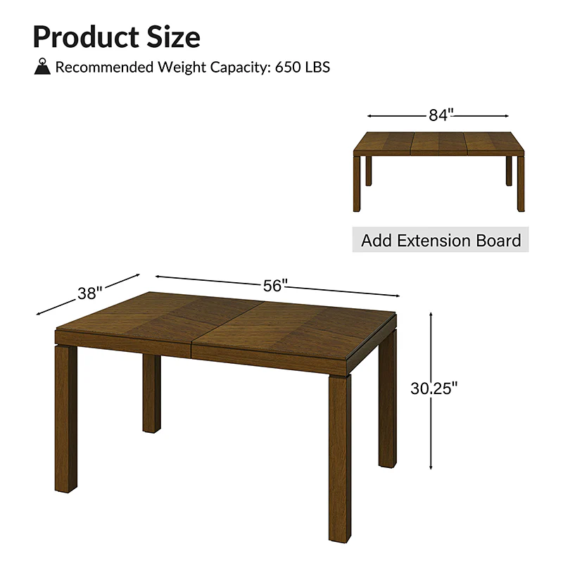 Experience the epitome of farmhouse-style dining with this exquisite extendable dining table. Supported by solid wood legs, this table features an MDF veneer tabletop, providing a sleek and contemporary look. The table is extendable, and equipped with a convenient center panel, allowing you to easily adjust its size according to your needs, providing flexibility for both family dinners and grand gatherings. With dimensions of 89.4 inches in width, 39.8 inches in depth, and 30.3 inches in height, this dining table offers ample space for gatherings and meals. Its spacious surface, coupled with the practicality of extension, makes it a versatile and practical addition to your dining area. Elevate your dining experience with this adaptable piece of furniture that embodies both farmhouse aesthetics and functional design.