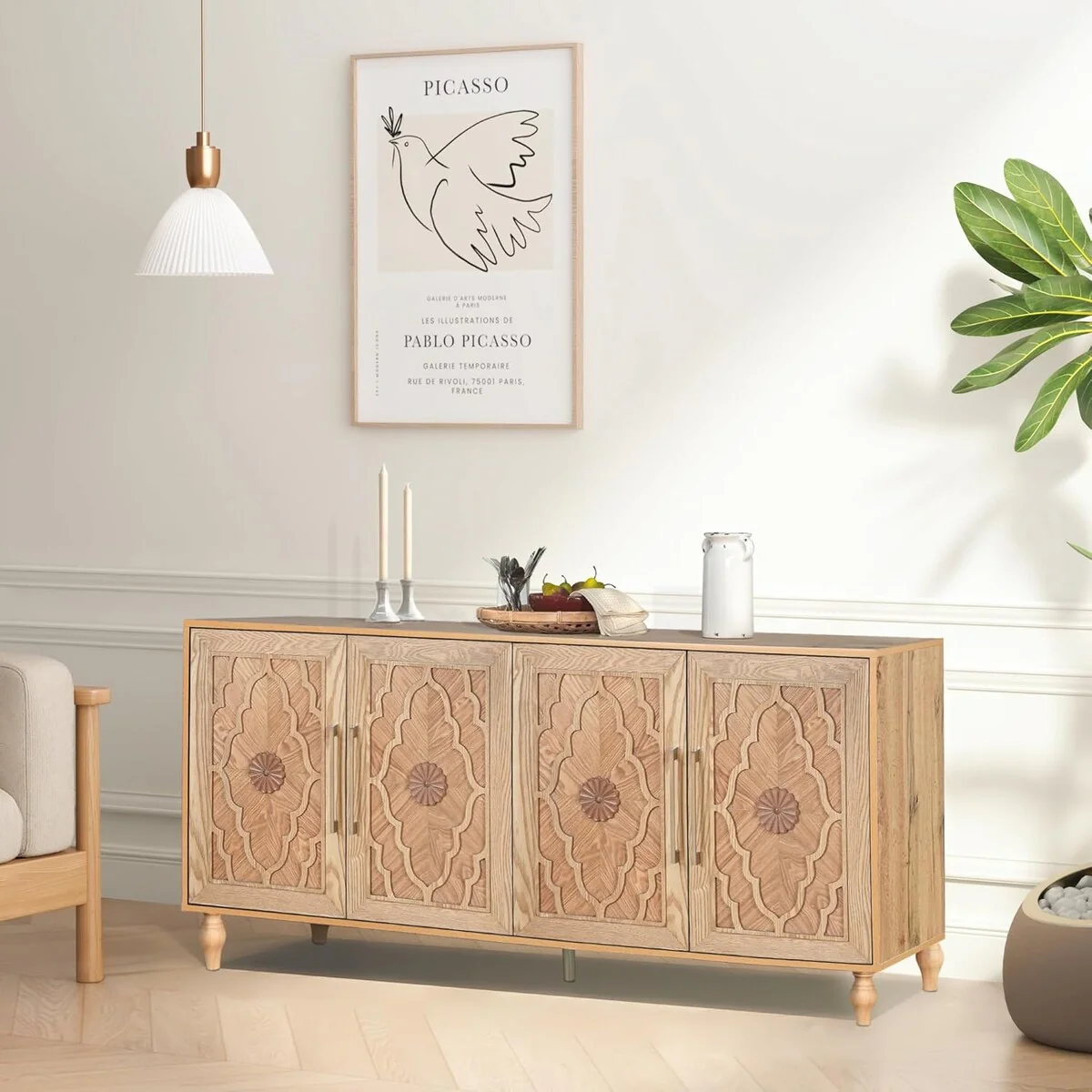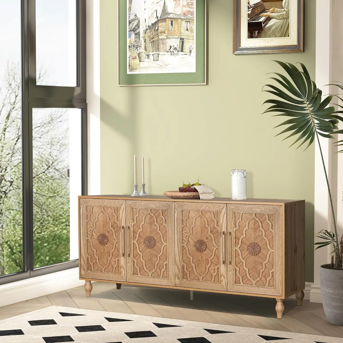 Add a touch of elegance and functionality to your home with the Carved Flower Door Large Storage Cabinet. Featuring intricate flower carvings and a sturdy metal handle, this cabinet is perfect for the living room, kitchen, or entryway. It offers ample storage space to keep your belongings organized and your home stylish. The elegant carved flower design on the doors adds a unique and artistic touch, making it a standout piece in any room. The large storage space provides plenty of room to store and organize your essentials, while the durable metal handle ensures easy opening and closing. This versatile cabinet is ideal for use in the living room, kitchen, or entryway, enhancing the decor of any room with its sophisticated design. Made with premium materials, this high-quality cabinet is built for long-lasting durability. Its low-maintenance surface makes cleaning a breeze, keeping your cabinet looking pristine.