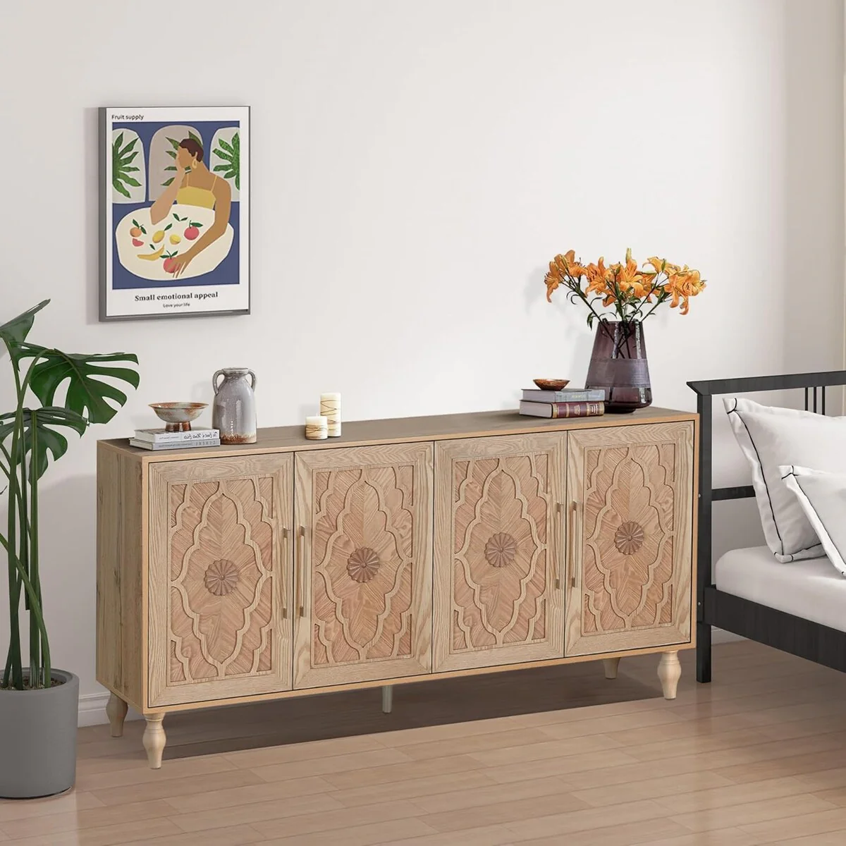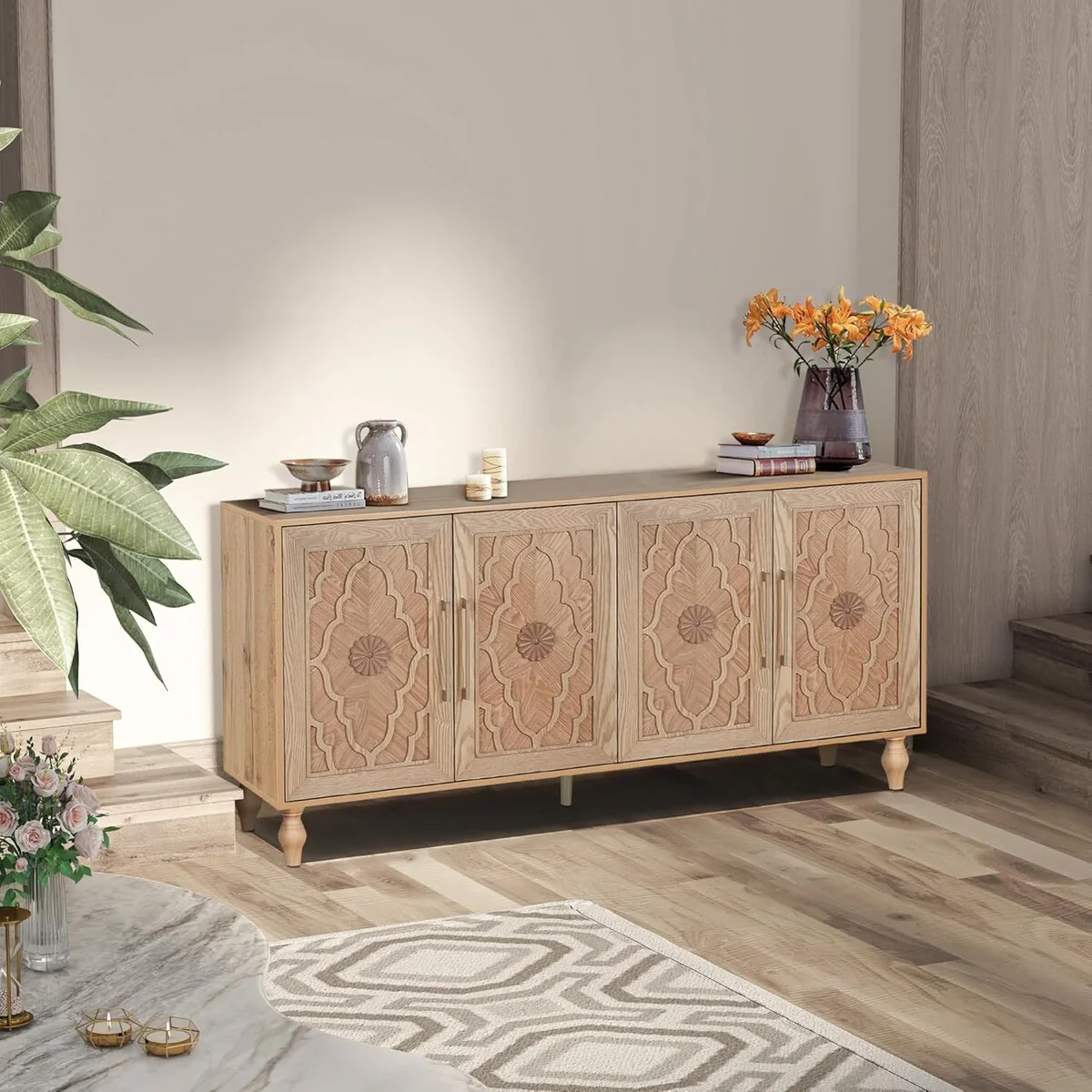 Enhance your home with the Carved Flower Door Large Storage Cabinet, combining beauty, functionality, and durability to elevate your living space.