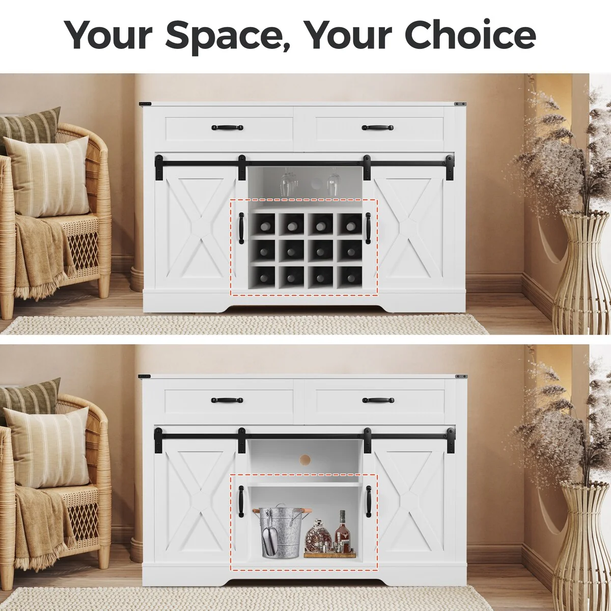 - With its versatile design, this side cabinet can not only serve as a wine cabinet for bottles and glasses but also carry cutlery, wine tools, and other catering supplies