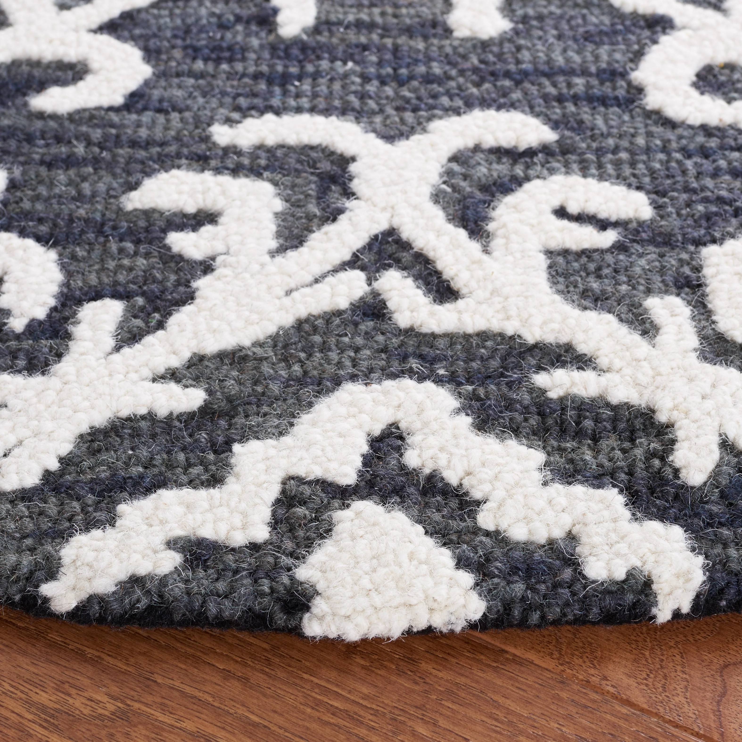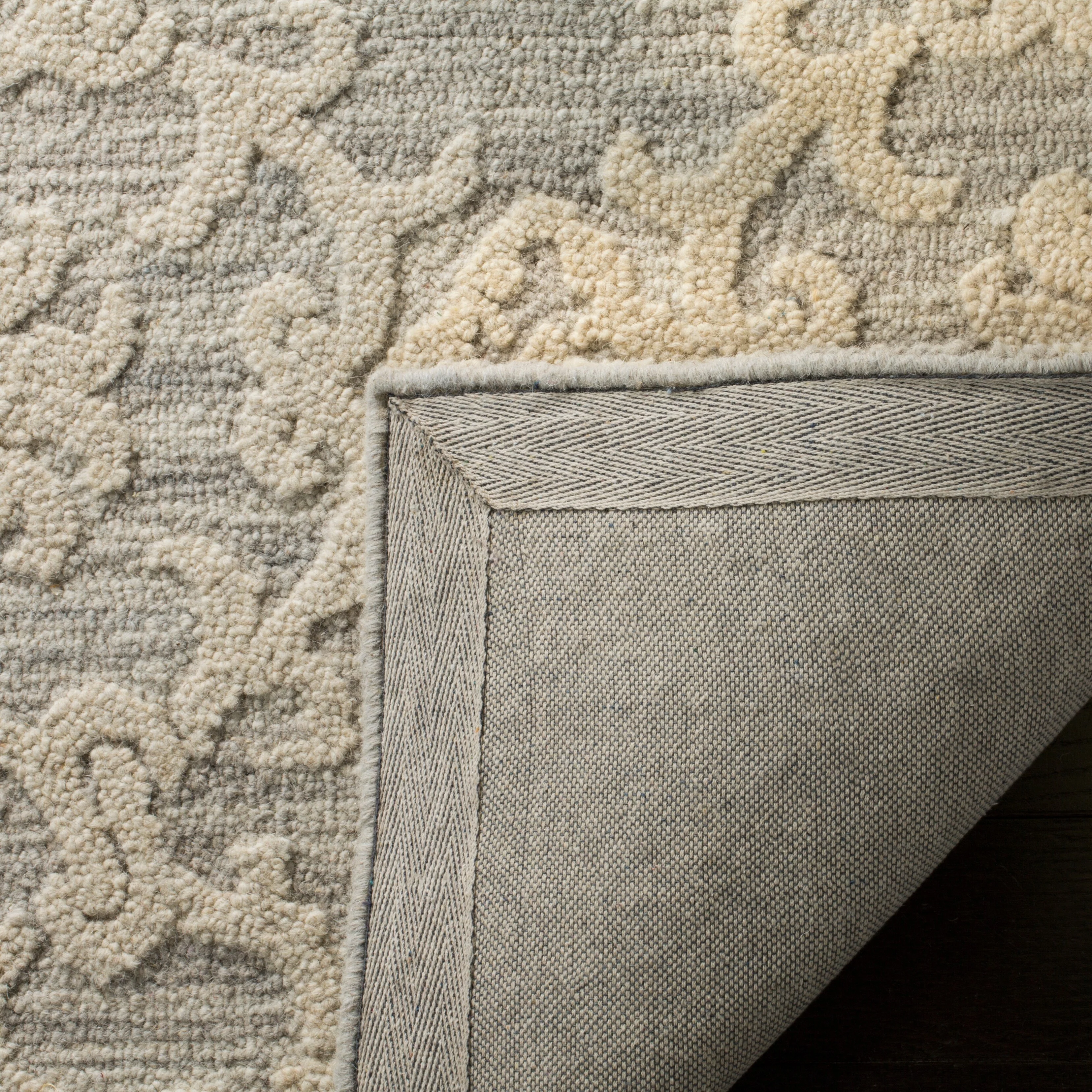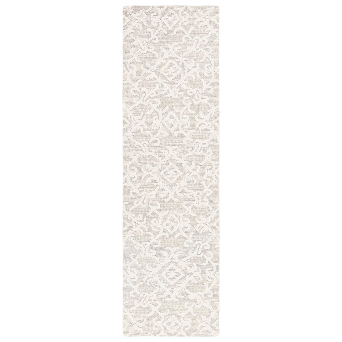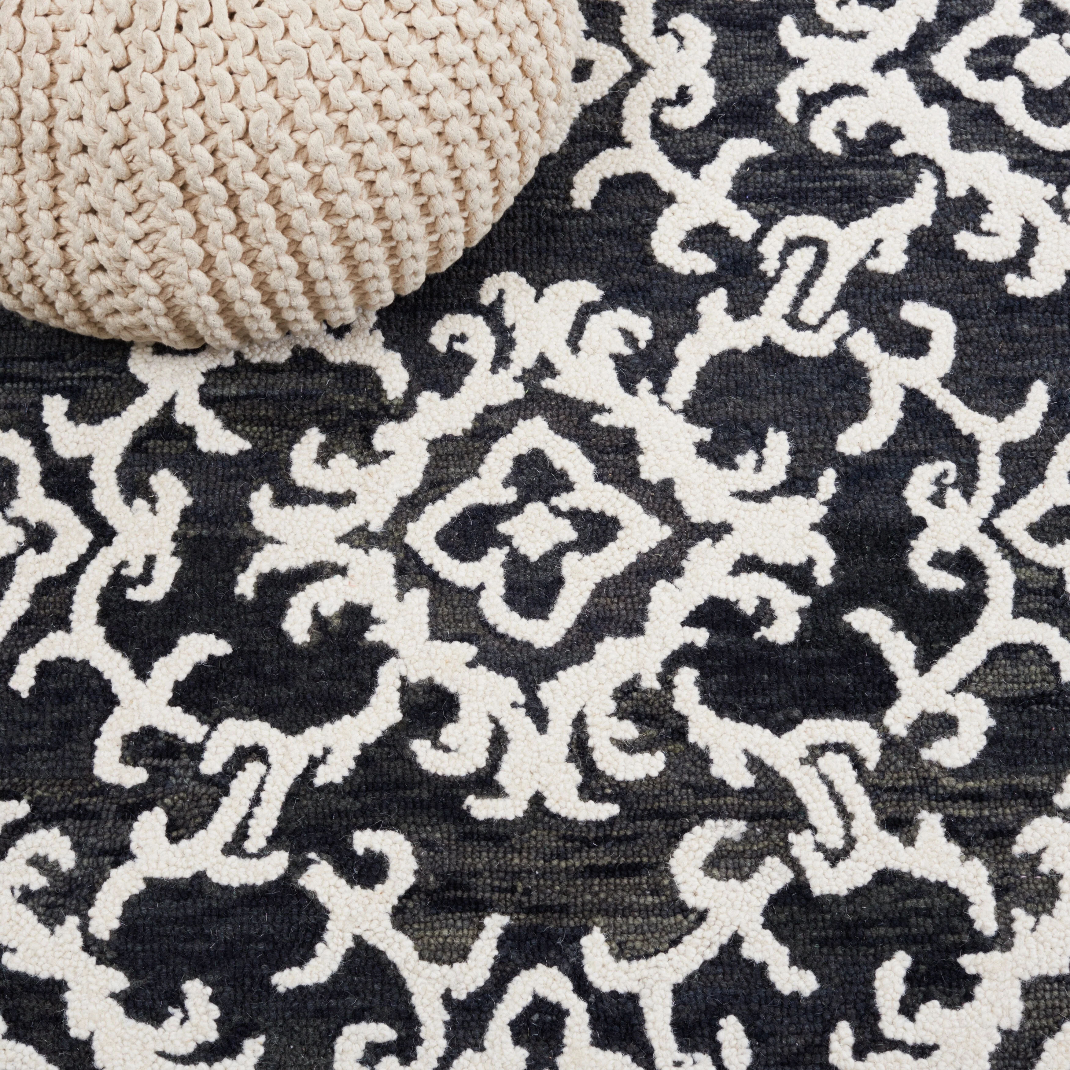 Elevate your living space with the exquisite charm of our Hand Tufted Wool Area Rug, now available in a grand 10' x 14' size, perfect for accentuating your large living areas, dining rooms, or master suites. Crafted with care in India, this rug boasts a luxurious height of 1/4", ideal for creating an inviting yet stylish atmosphere.Impeccably designed with a refined grey and ivory color palette, this large rectangle-shaped area rug showcases a sophisticated interplay of traditional patterns. Its elegant damask-like motifs, defined by delicate swirls and floral elements, create a serene and timeless ambience that effortlessly complements a variety of decor styles.The hand-tufted construction ensures each piece is unique, demonstrating the artisan's touch with every fiber. The rug's 100% wool composition not only gives it an unmatched softness underfoot but also contributes to its durability, making it a trusted addition to your home for years to come.Let your floor make a statement of luxury and grace with this magnificent area rug; a testament to classic beauty and artisanal craftsmanship.
