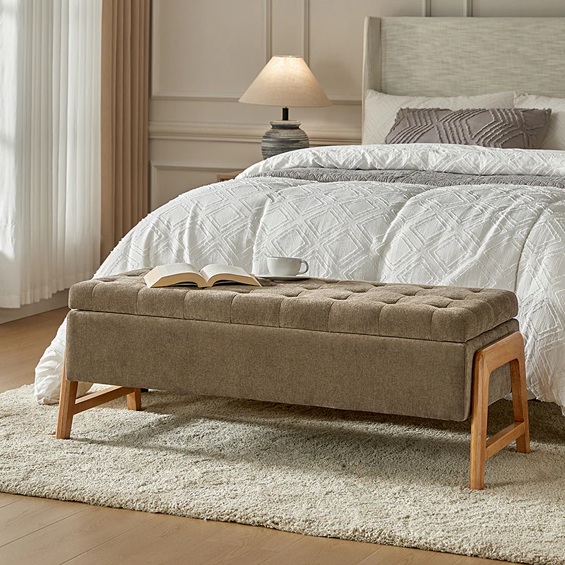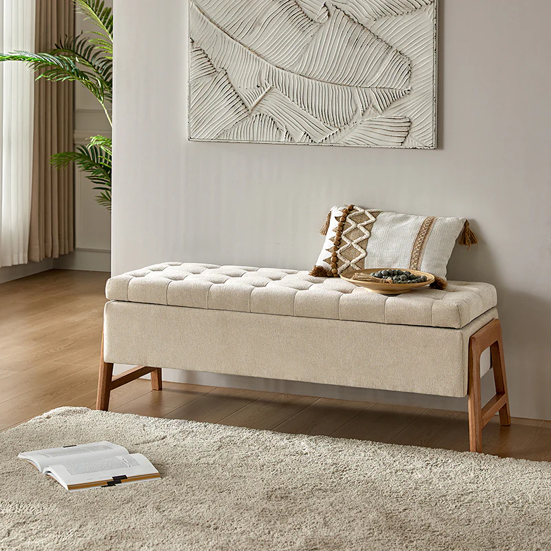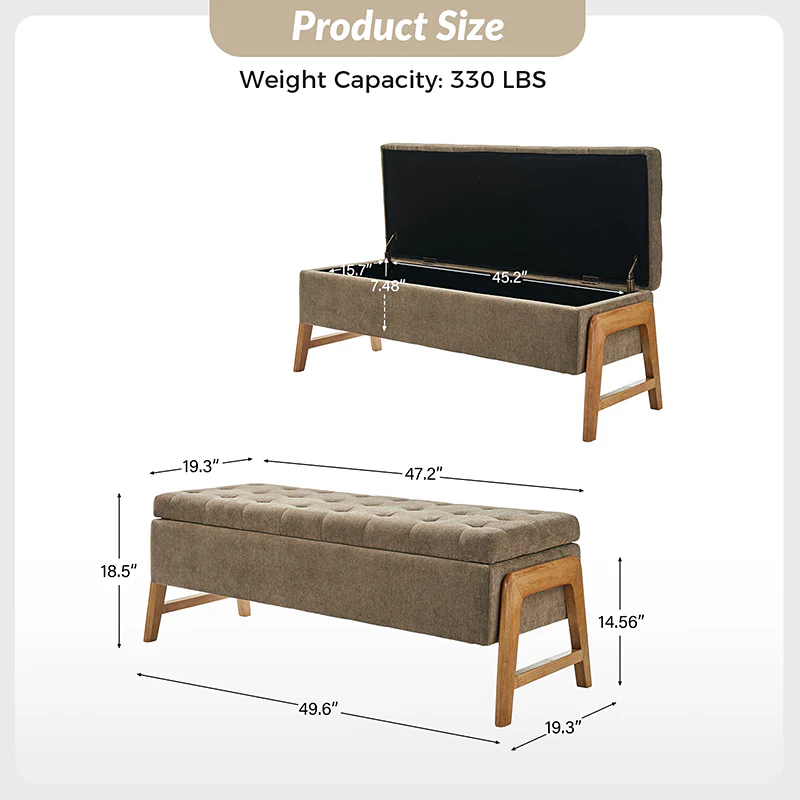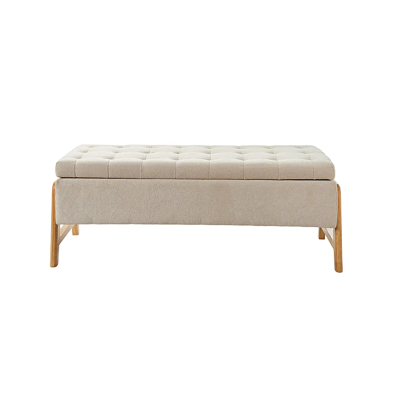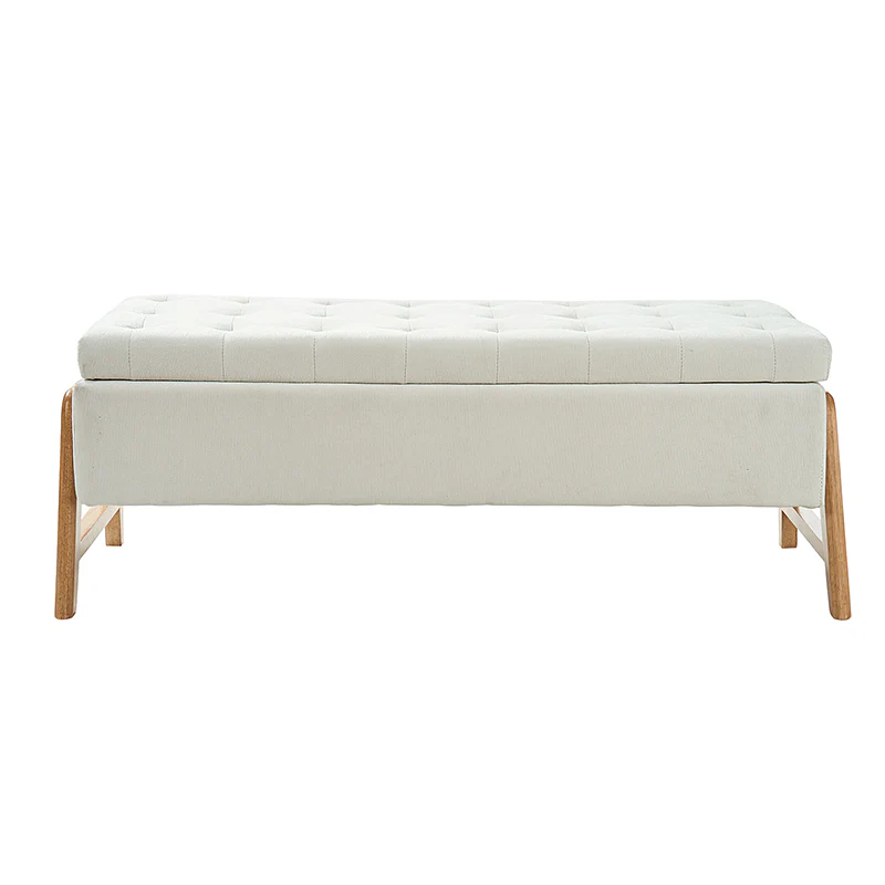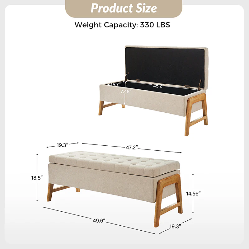 Introducing the mid-century modern upholstered storage bench, a perfect blend of style and functionality. Its chic design and sleek silhouette add a touch of sophistication to any space. The thick point-tufted seat cushion not only enhances comfort but also exudes elegance. Crafted with solid wood legs, this bench ensures durability and stability. Its versatile nature makes it an ideal addition to your living room, bedroom, or entryway, seamlessly adapting to various settings. The upholstered fabric not only contributes to its luxurious appeal but also ensures easy maintenance. Experience the perfect combination of form and practicality with this timeless piece, enhancing both your decor and storage solutions.