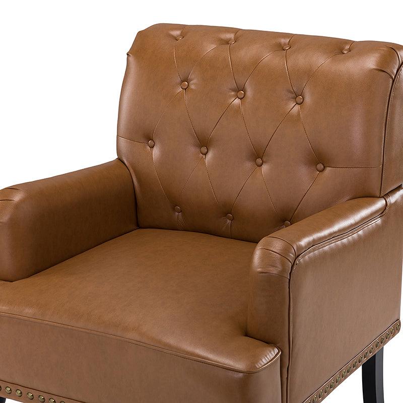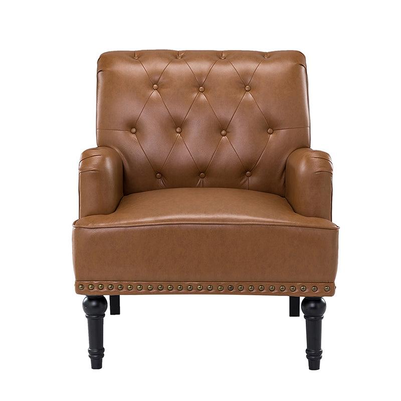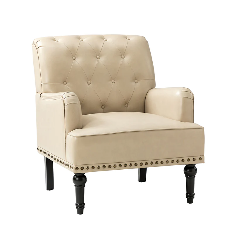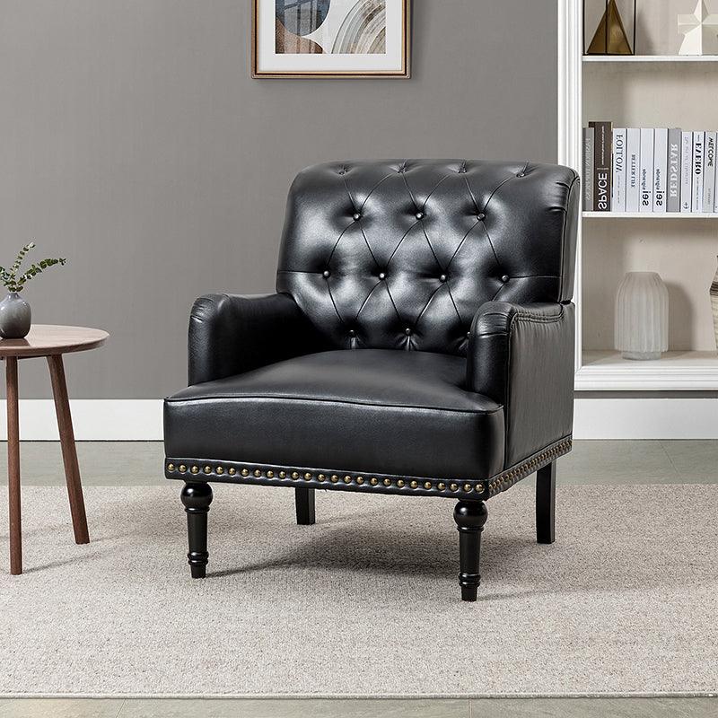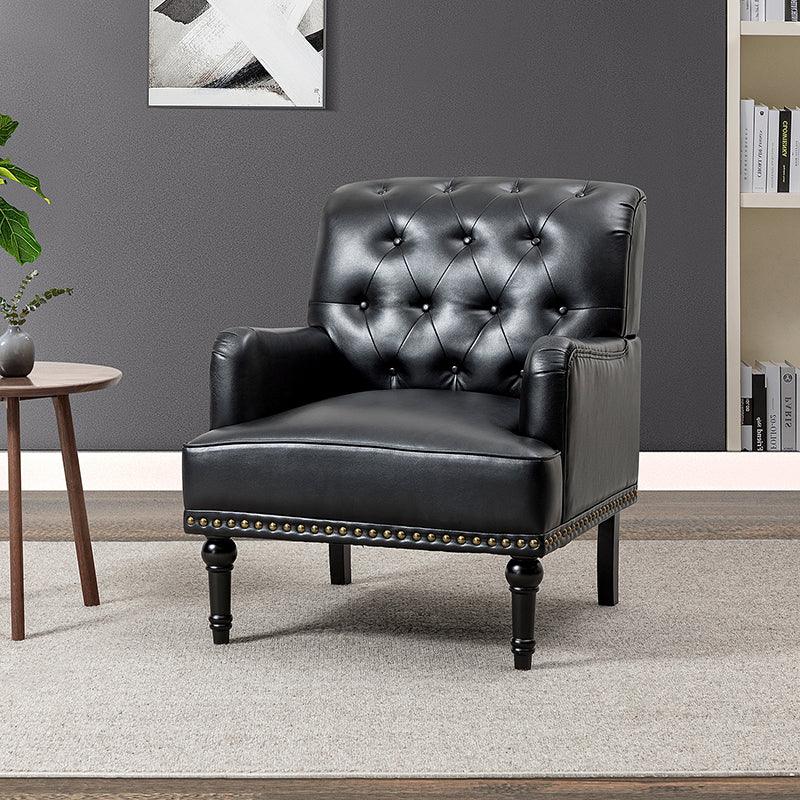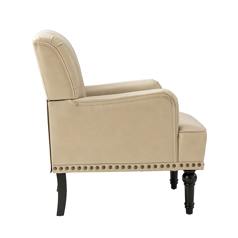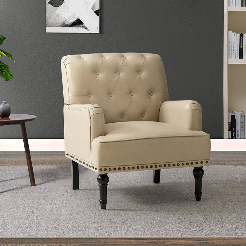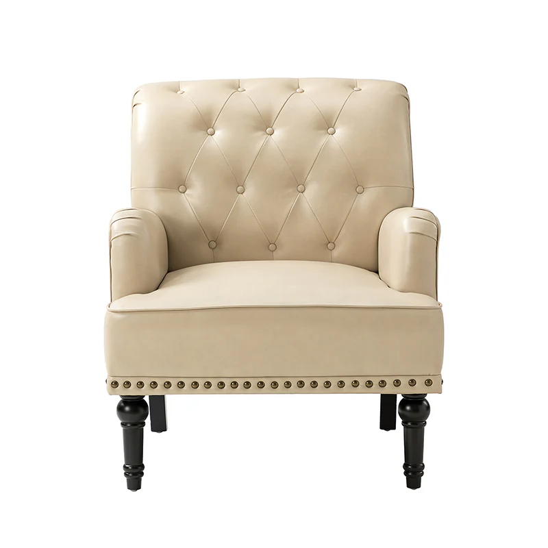 Unique style and classic design combine in this inviting armchair. It features a sturdy wood frame, wrapped in PU upholstery with a button-tufted design, elegantly carved front legs, and simple back legs that offer a visual variation. The foam-filled back provides extra support, while the nailhead trim adds a dose of vintage design to it. It is suitable for most of your daily scenarios such as study room, bedroom, and living room. Whether you are enjoying quality family time or entertaining guests, this armchair will extend an open invitation for everyone to relax.
