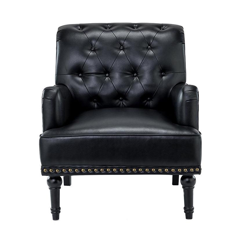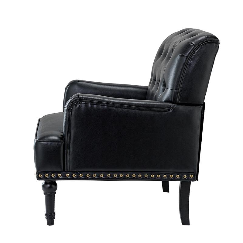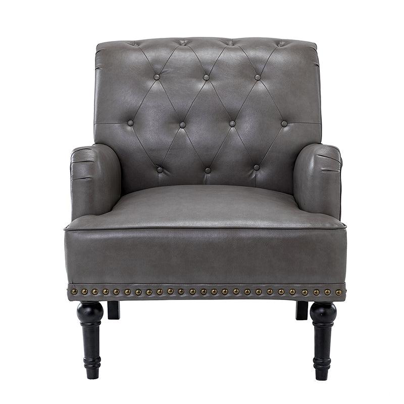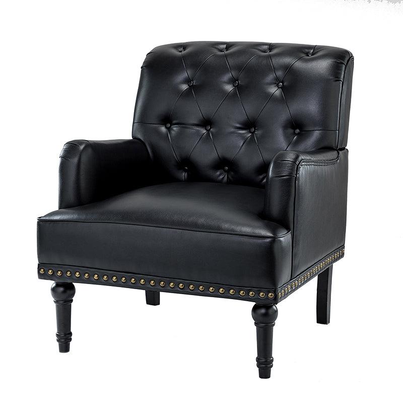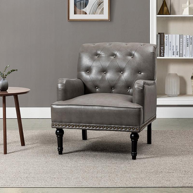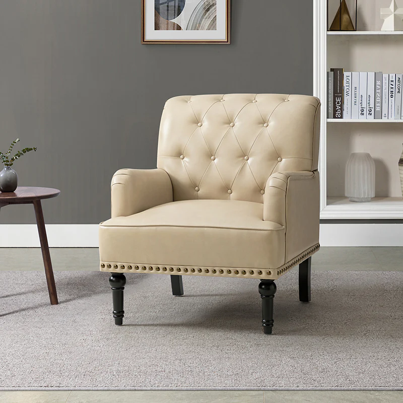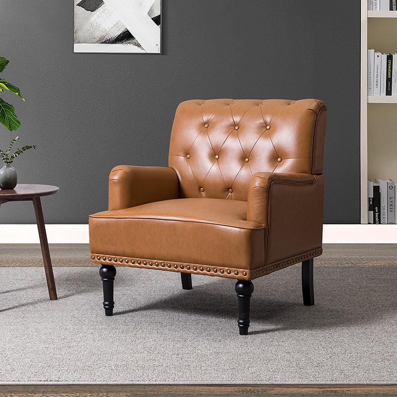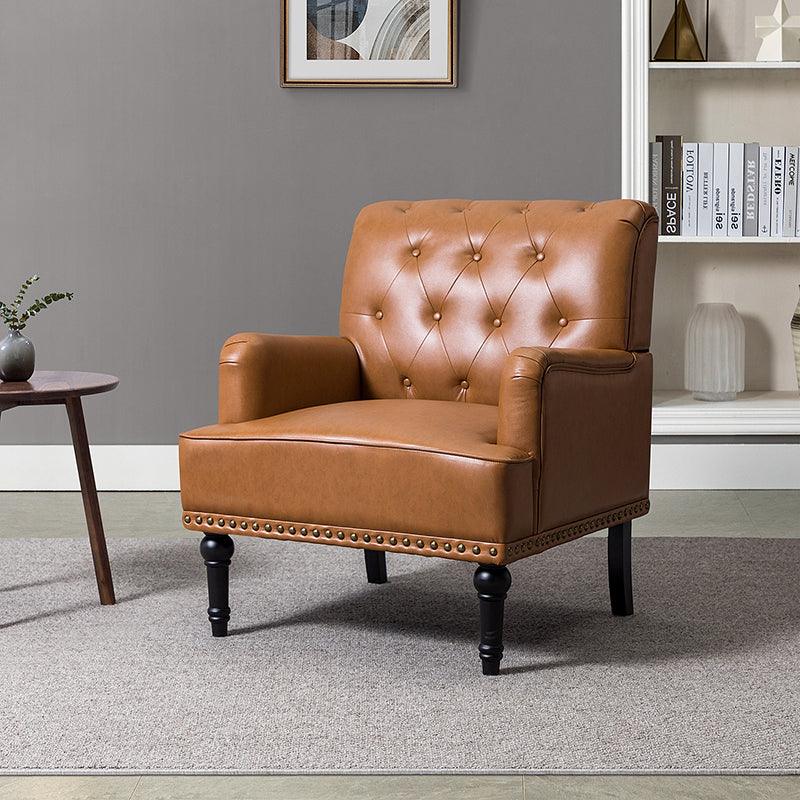 Unique style and classic design combine in this inviting armchair. It features a sturdy wood frame, wrapped in PU upholstery with a button-tufted design, elegantly carved front legs, and simple back legs that offer a visual variation. The foam-filled back provides extra support, while the nailhead trim adds a dose of vintage design to it. It is suitable for most of your daily scenarios such as study room, bedroom, and living room. Whether you are enjoying quality family time or entertaining guests, this armchair will extend an open invitation for everyone to relax.