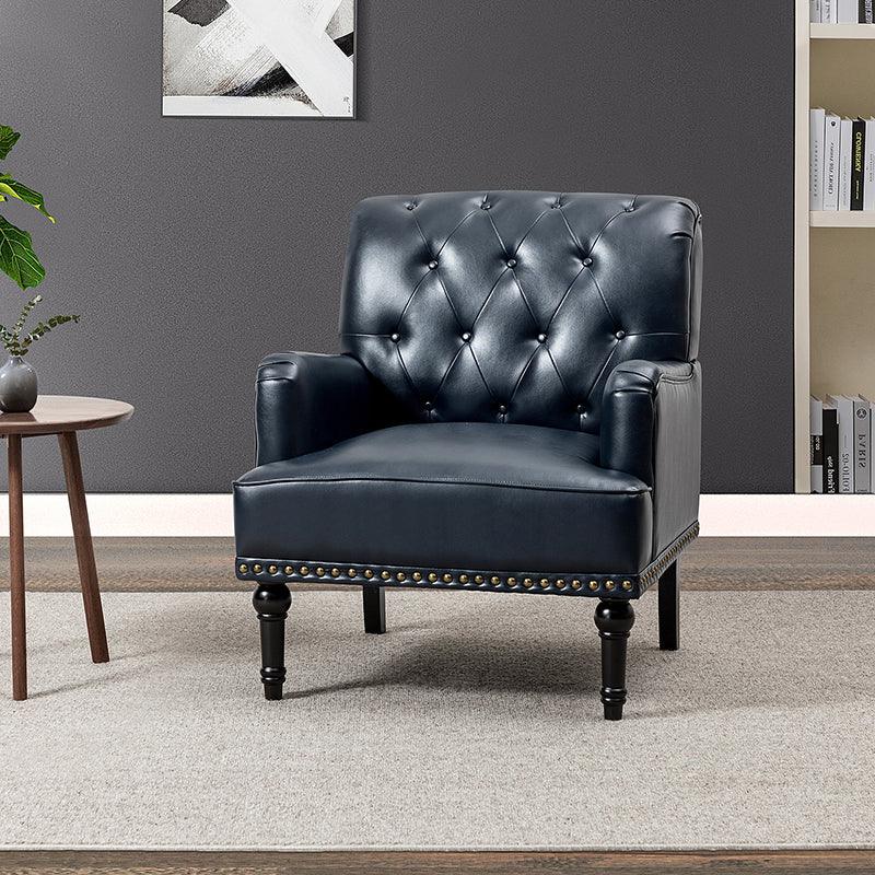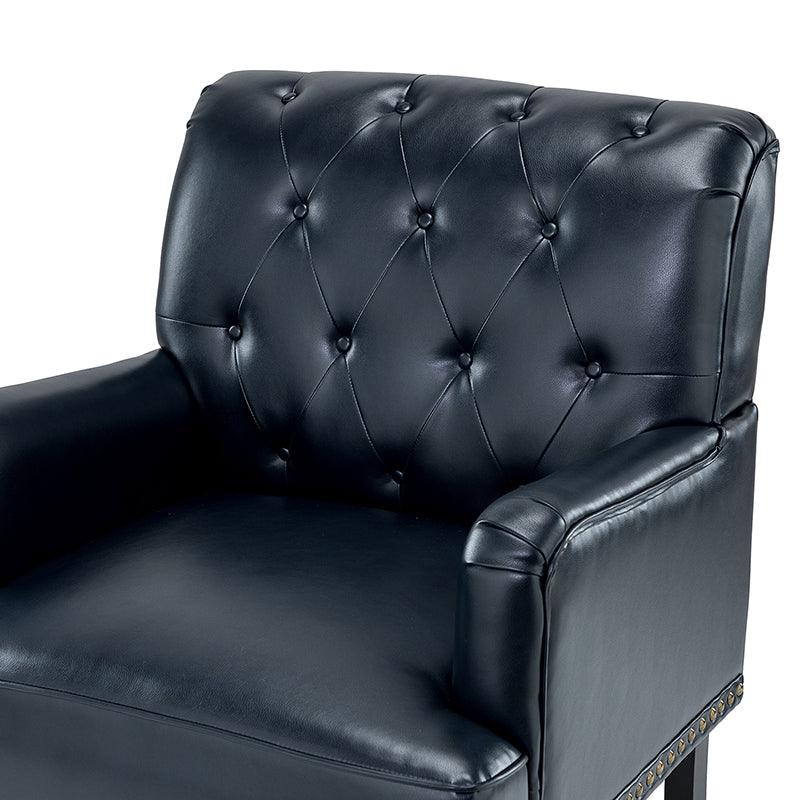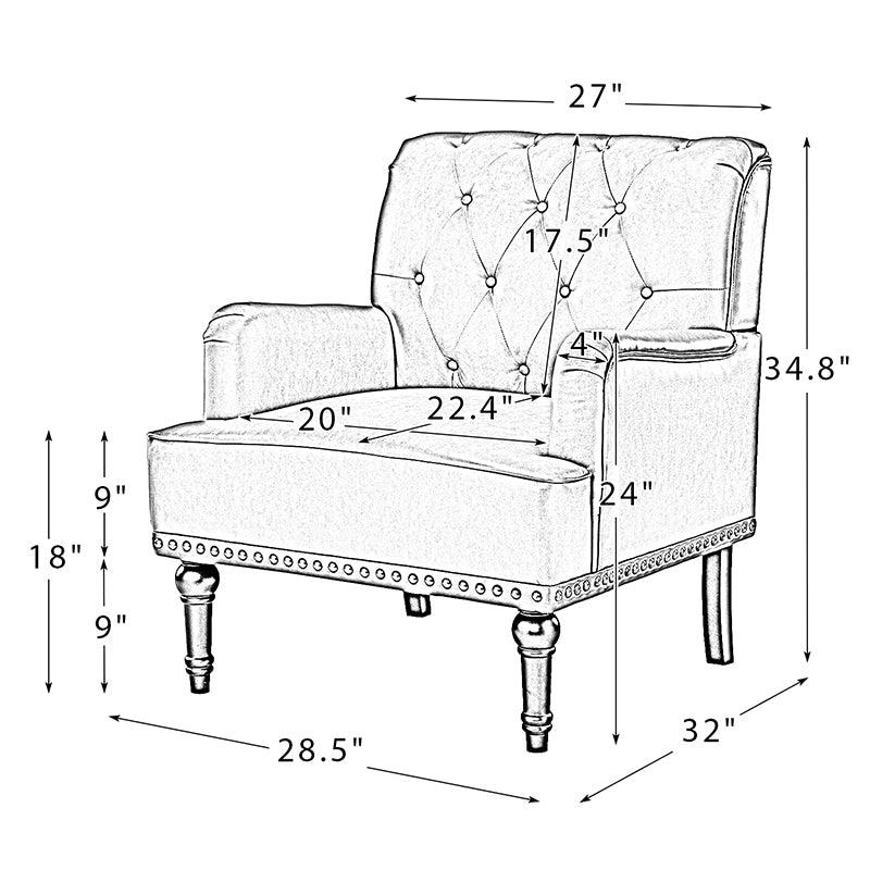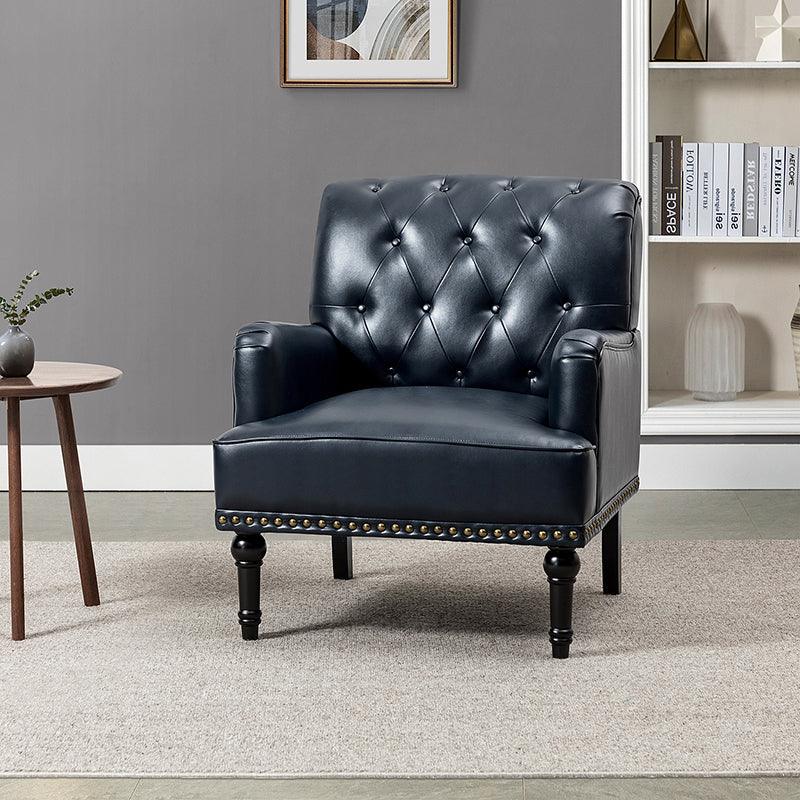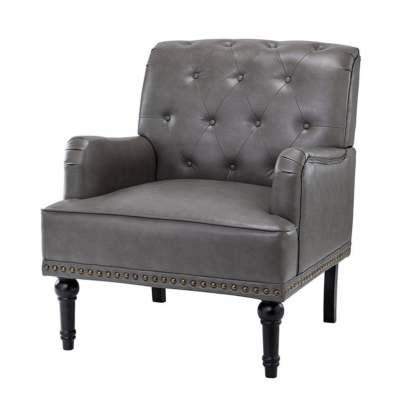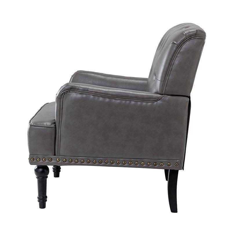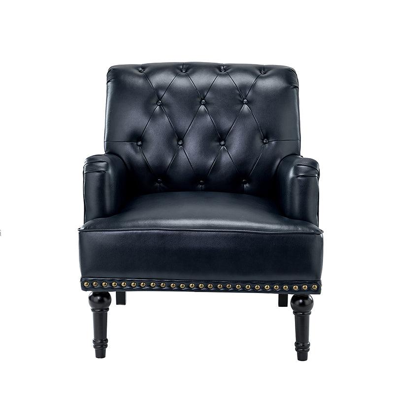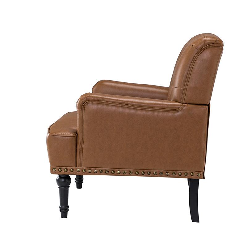 Unique style and classic design combine in this inviting armchair. It features a sturdy wood frame, wrapped in PU upholstery with a button-tufted design, elegantly carved front legs, and simple back legs that offer a visual variation. The foam-filled back provides extra support, while the nailhead trim adds a dose of vintage design to it. It is suitable for most of your daily scenarios such as study room, bedroom, and living room. Whether you are enjoying quality family time or entertaining guests, this armchair will extend an open invitation for everyone to relax.