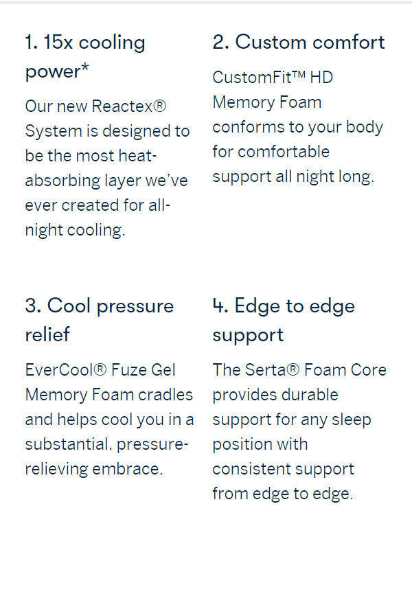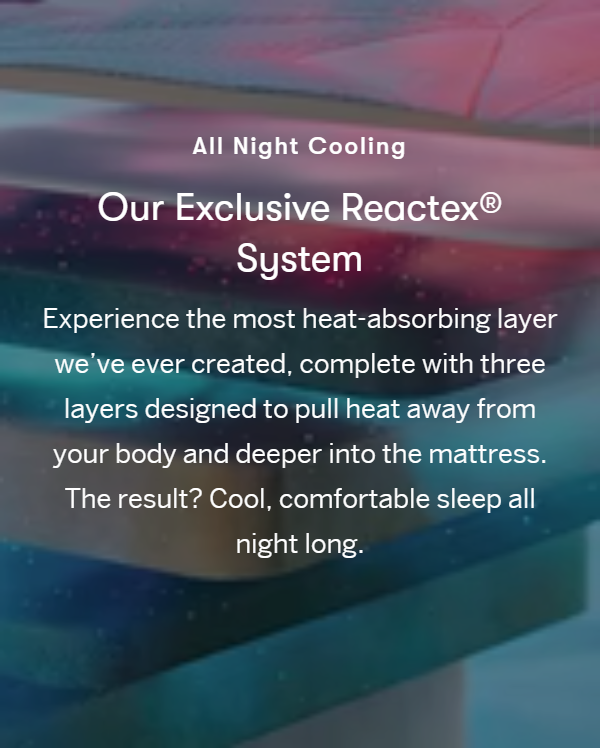 • Experience all-night cool, restful sleep with the Serta Arctic mattress. Powered by Serta's exclusive Reactex® technology, a unique three-part cooling system pulls heat away from your body and deep into the mattress. With layers of premium, body-hugging memory foam that conforms to your body for the comfiest slumber of your dreams.