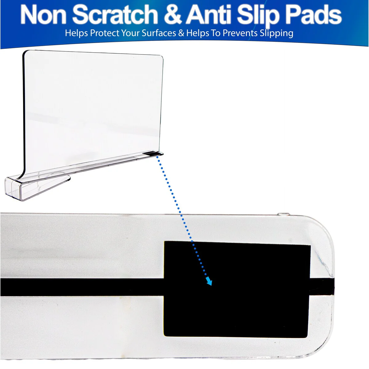 - ANTI SCRATCH PAD & SMOOTH ROUNDED CORNERS: Safety has been kept paramount with these shelf dividers. Their rounded corners are meticulously designed to ensure that neither the shelves nor the items stored face any scratches or damage. The bottom of each divider features a anti slip and anti scratch pad. Ensuring your surfaces stay scratch free and dividers stay in place.