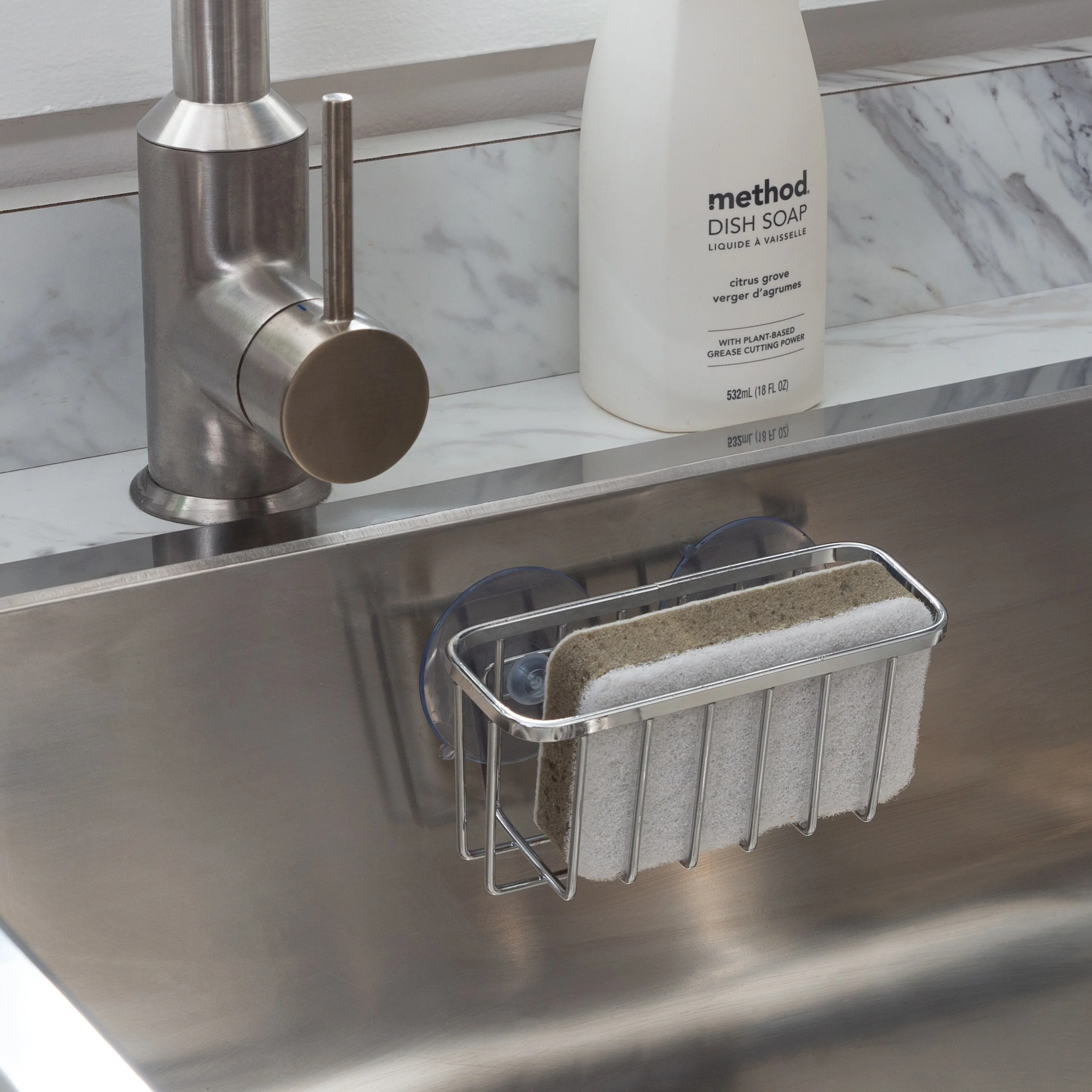 Kitchen Details' Suction Mount Sink Caddy is the perfect addition to your kitchen sink. The open design allows water to drain away following washes allowing sponges and scrubbers to dry quickly. 2 strong suction cups allows caddy to stick to smooth sink surfaces, giving it it's convenient In-sink design. Strong chrome wire material is long lasting, resisting water and other damage.