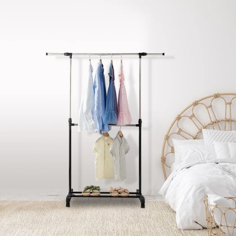 • Single/Dual-bar Vertical & Horizontal Stretching Stand Clothes Rack with Shoe Shelf