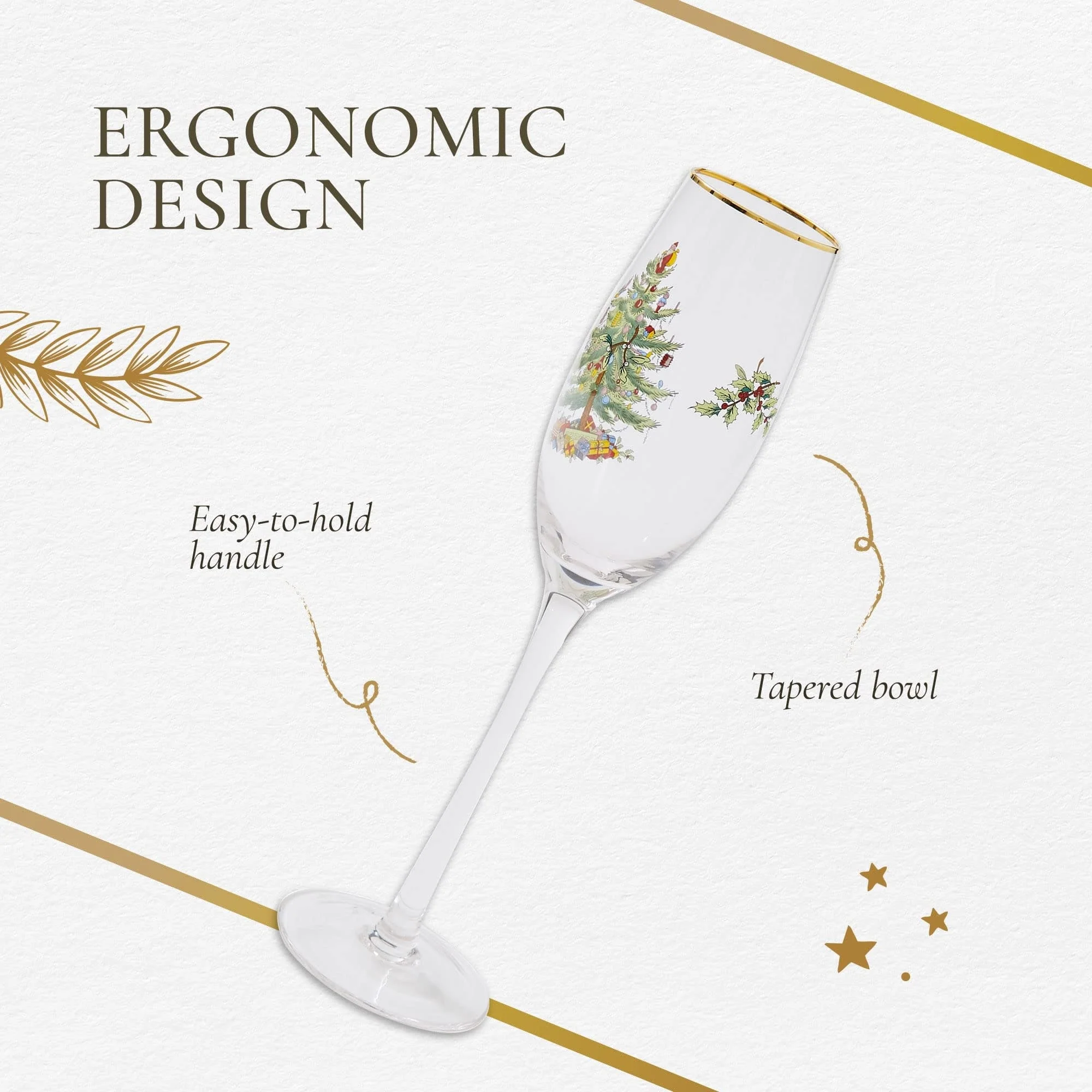 Spode Christmas Tree Gold 8.5oz Champagne Flutes (Set of 4) - Gold Rimmed Glasses, Festive Holiday Drinkware for Christmas Dinner, Wedding Gifts - Classic Holiday Glassware for Wine & Minosas - New